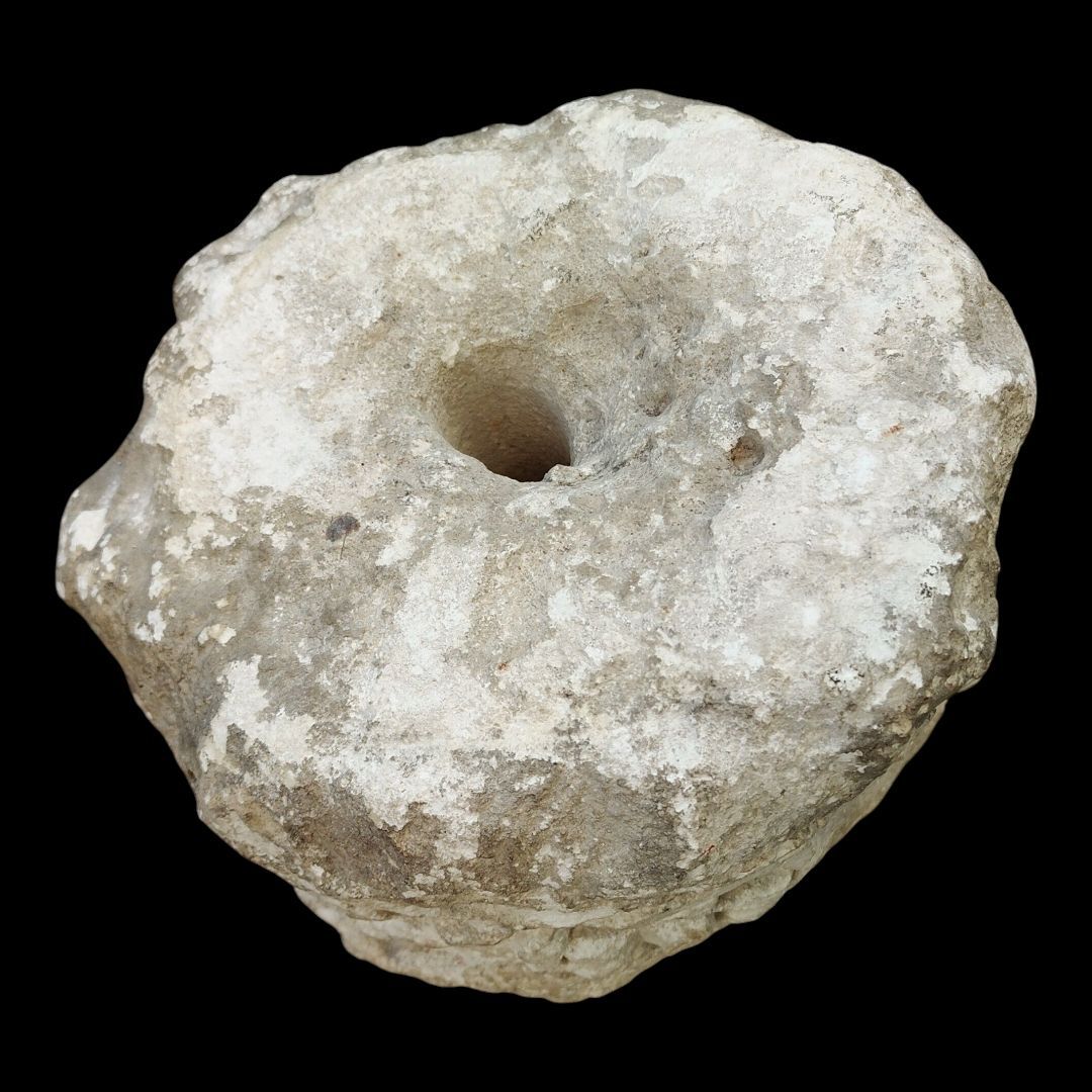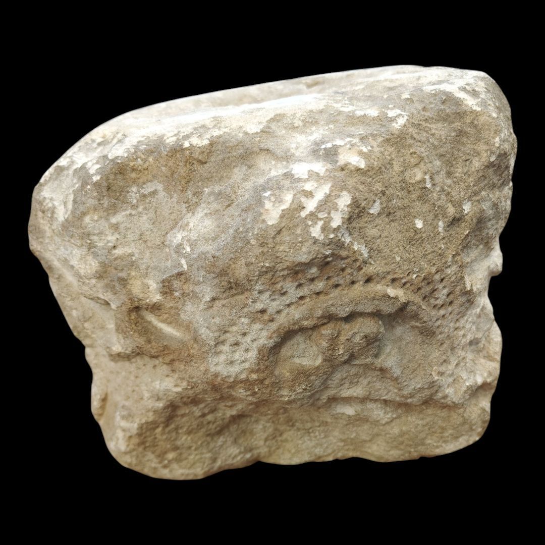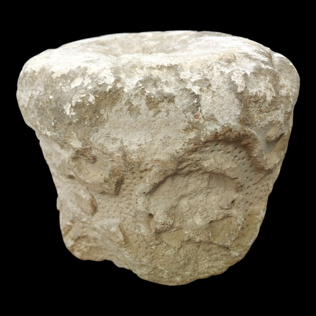Raffinato capitello romanico in pietra decorato con rose camune.Evidenti segni di usura. Diametro massimo 24 cm Altezza 18