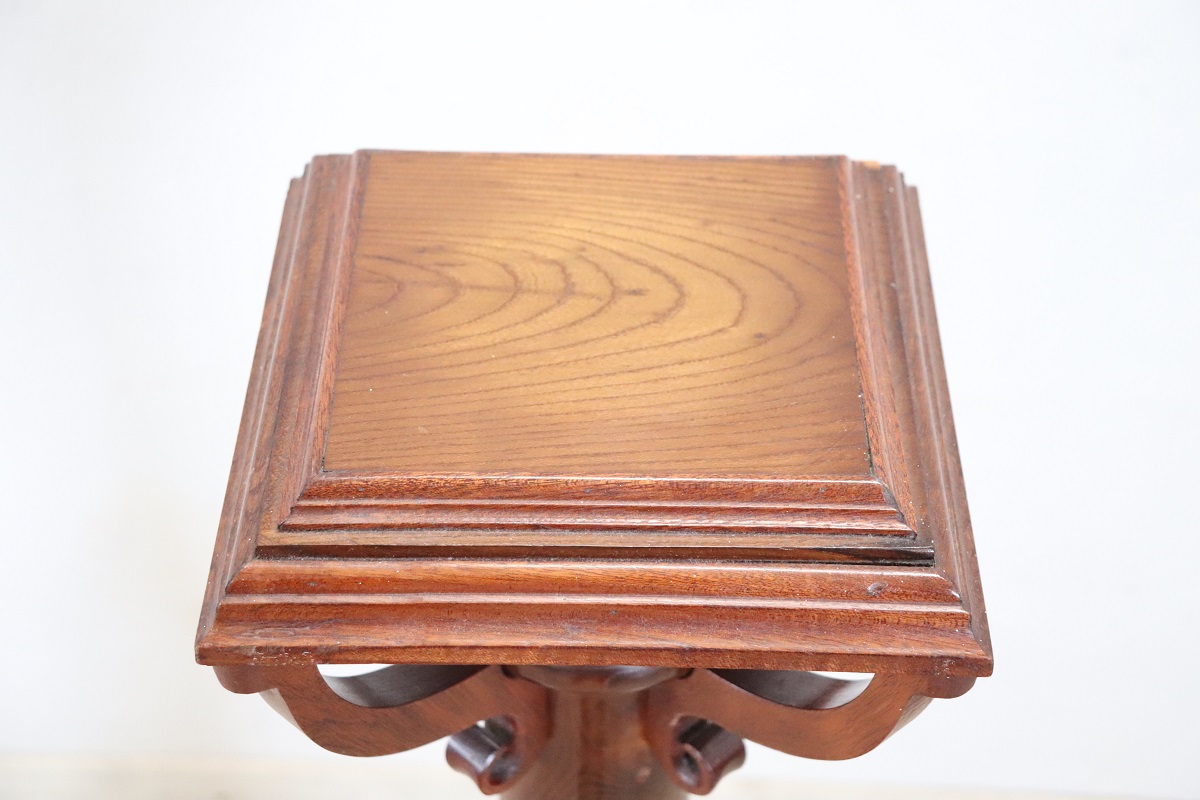 La finitura lucida del legno esalta le venature naturali, mettendo in risalto la consistenza e il colore del rovere. Questa colonna funge da base ideale per esporre una varietà di oggetti, sia che si tratti di una scultura in marmo o in bronzo, di un pezzo di ceramica da collezione o di un vivace vaso pieno di fiori.
