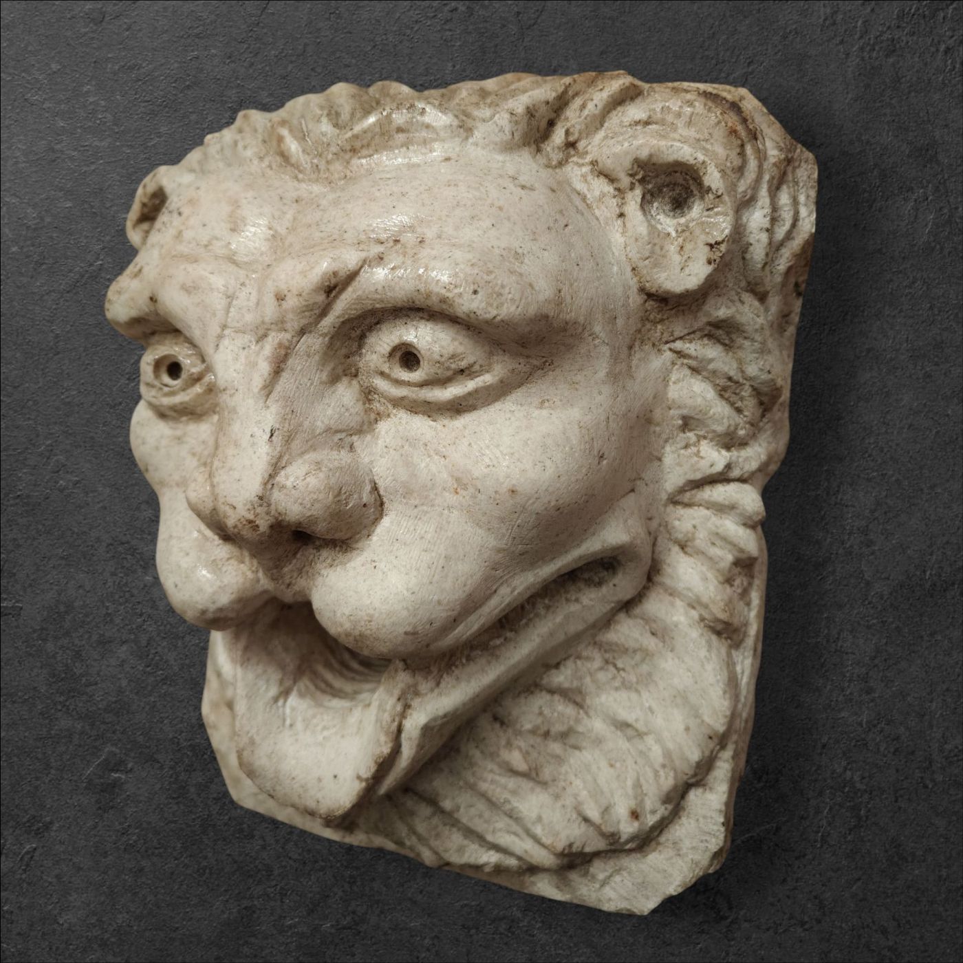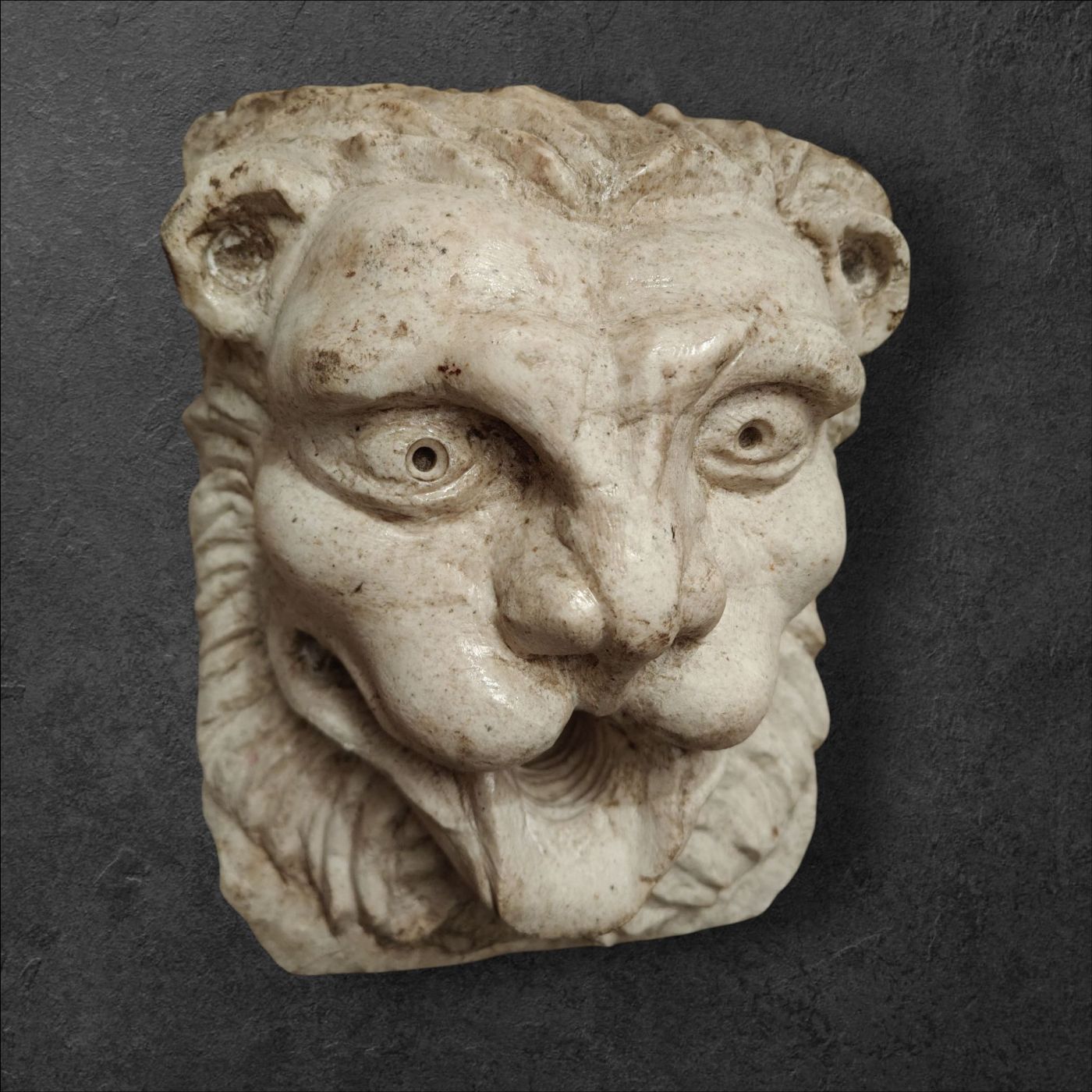 Bel mascherone di fontana in marmo a forma di testa di leone.