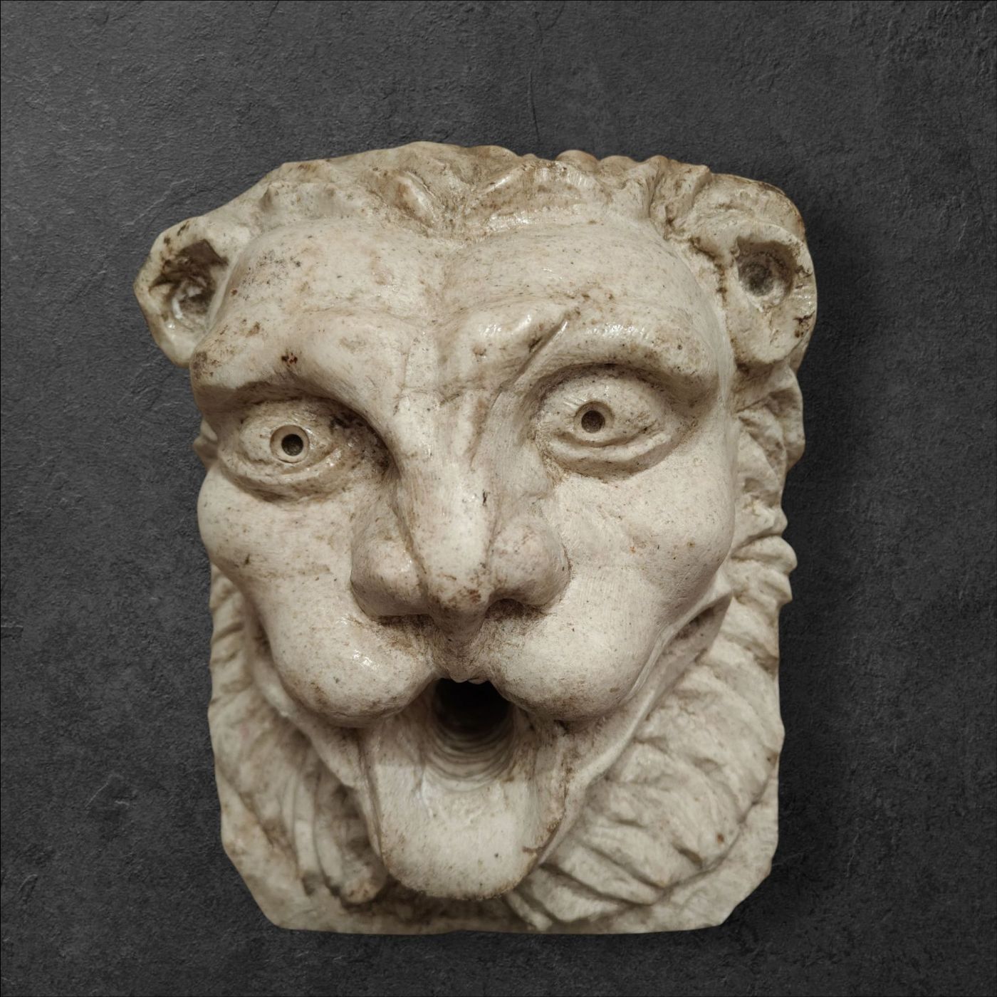 Bel mascherone di fontana in marmo a forma di testa di leone.