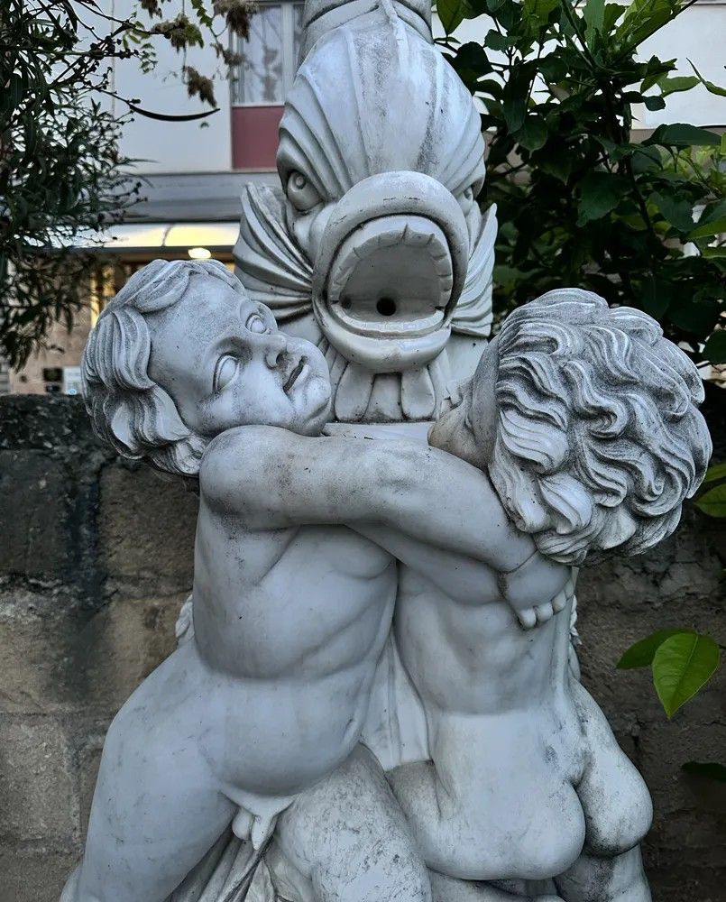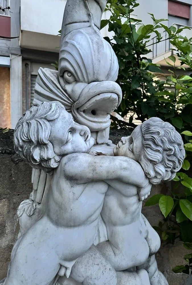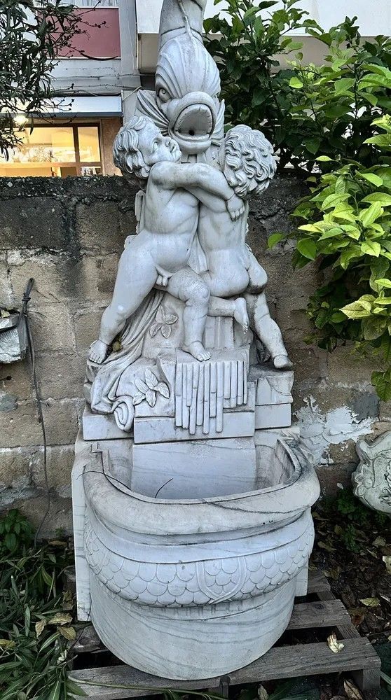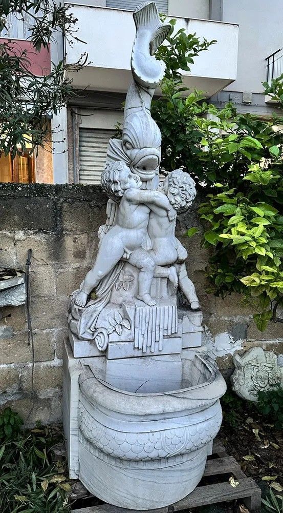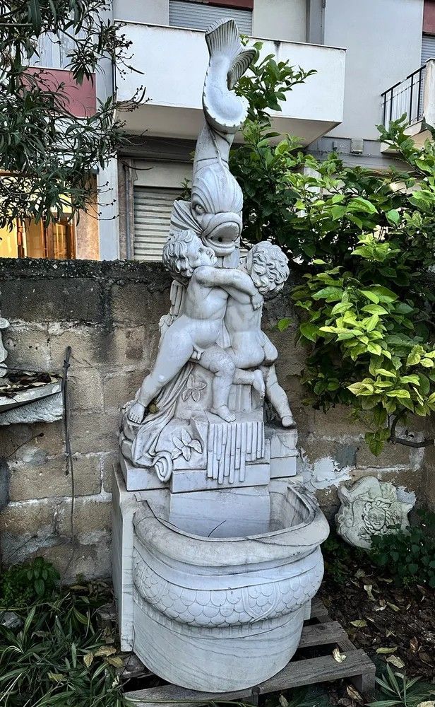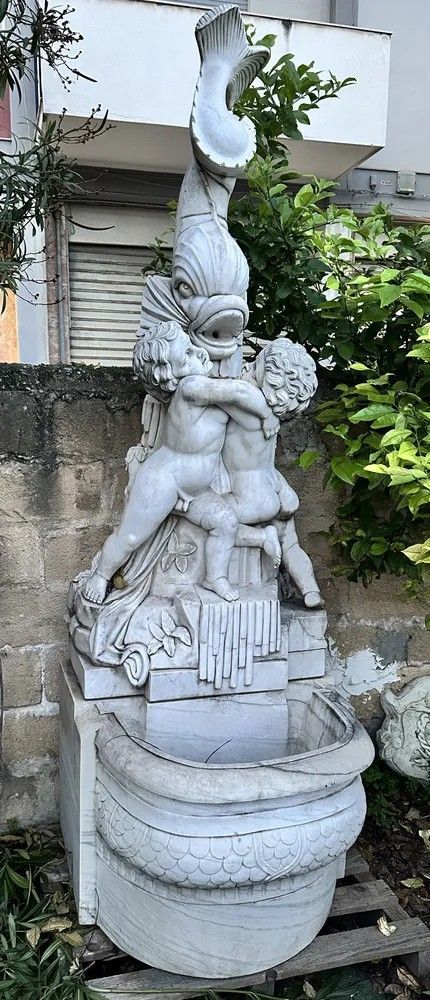 Un capolavoro di arte scultorea italiana del XX secolo: questa suggestiva fontana da muro è stata finemente scolpita a mano in marmo bianco di Carrara, materiale d’eccellenza per resistenza e lucentezza. Il gruppo scultoreo raffigura due putti che, avvinghiati tra loro, giocano attorno a un possente delfino la cui bocca funge da beccuccio per l’acqua, creando un gioco di zampilli di grande effetto scenografico.Origine: Italia, primi 1900.Materiale: marmo/pietra naturaleDestinazione: installazione a parete, ideale per cortili, giardini d’inverno o ingressi rappresentativi.Dettagli decorativi: squame cesellate sul bacino, canne d’organo e foglie scolpite alla base, anatomie infantili rese con grazia.Il bacino emisferico presenta un elegante decoro a scaglie tipico delle fontane rinascimentali, mentre la parte superiore, slanciata, aggiunge verticalità e movimento. Ogni angolo rivela maestria: dalle ciocche ricciolute dei putti alle venature naturali del marmo che riflettono la luce.Inserita in un contesto verde, la fontana diventa il punto focale del giardino, regalando un sottofondo musicale di acqua che scorre e un raffinato richiamo alla tradizione classica italiana. Un pezzo unico che unisce funzione e bellezza senza tempo, adatto a collezionisti, architetti paesaggisti e amanti dell’antiquariato di qualità.Materiale: Marmo/PietraAltezza (cm): 250Larghezza (cm): 84Profondità (cm): 95Epoca: XX Secolo - 1900
