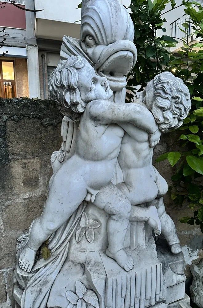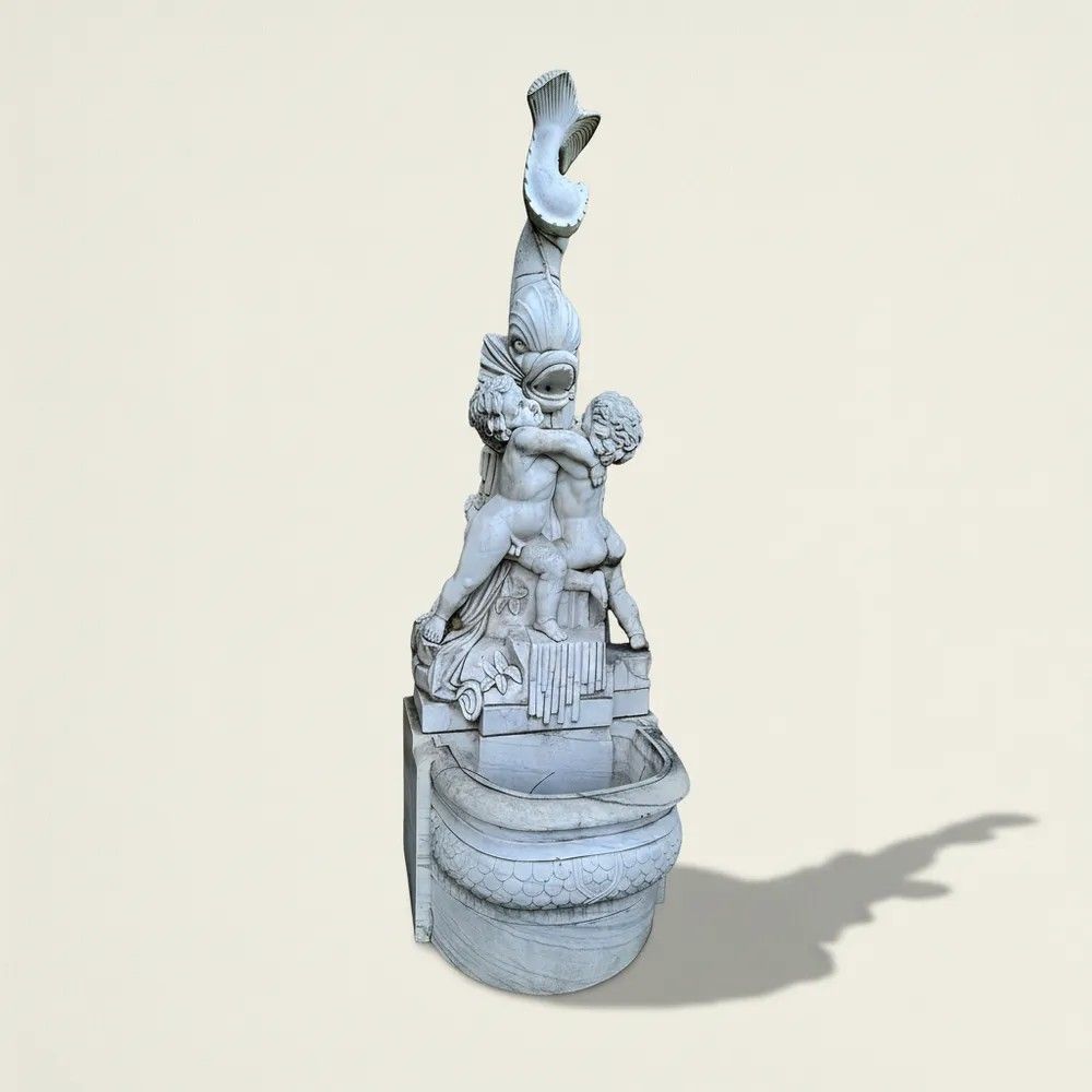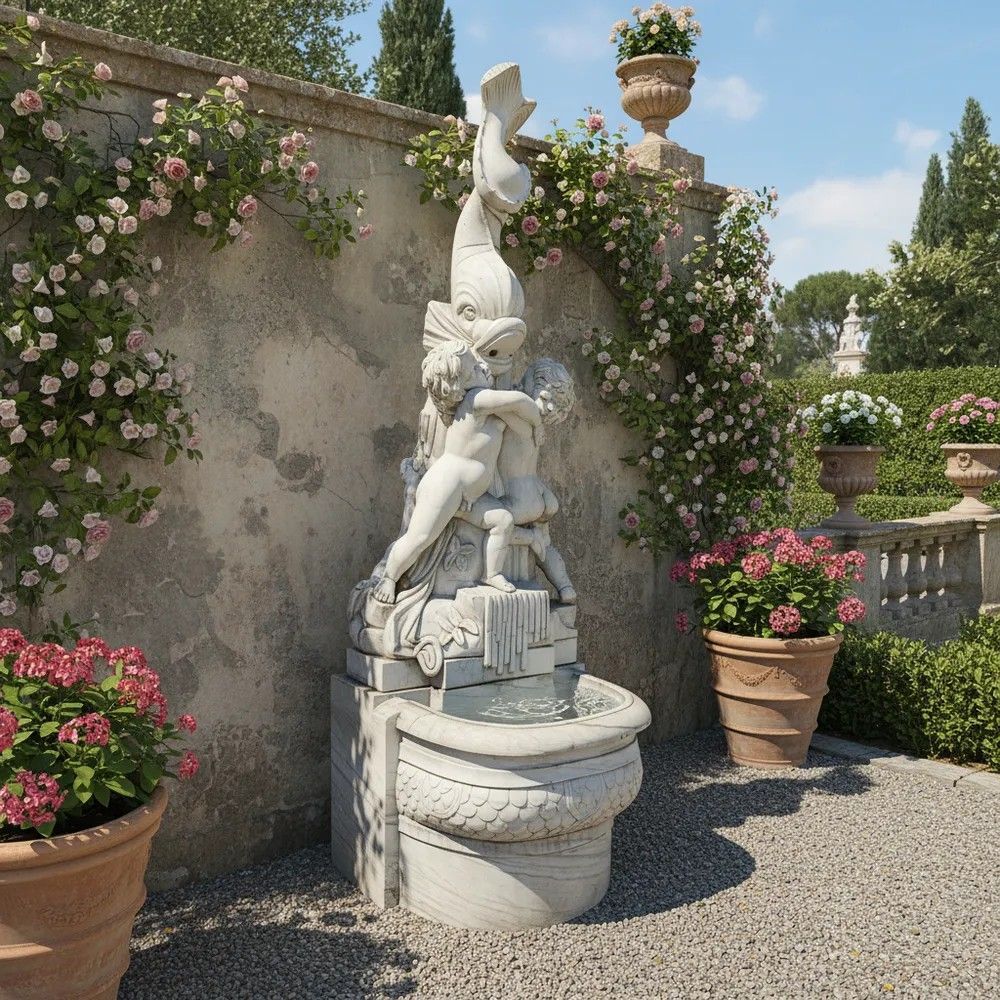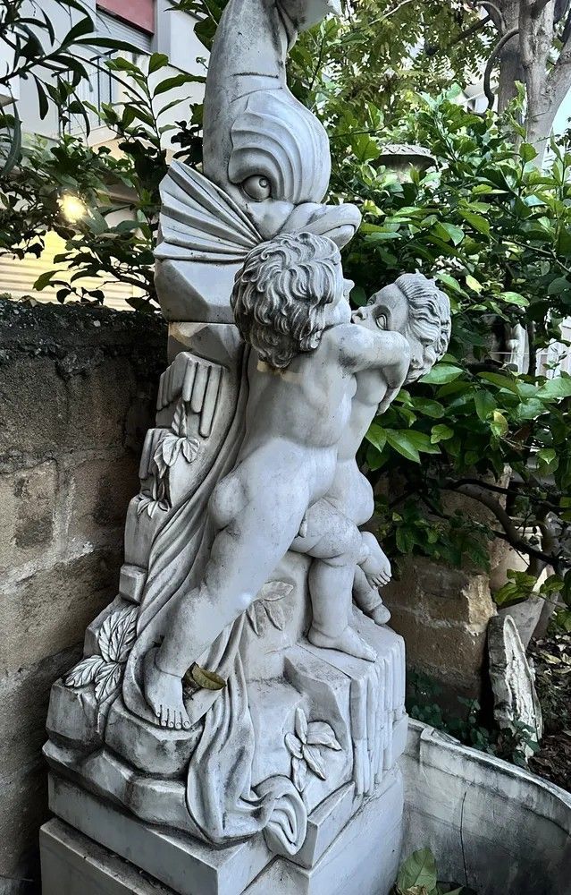 Un capolavoro di arte scultorea italiana del XX secolo: questa suggestiva fontana da muro è stata finemente scolpita a mano in marmo bianco di Carrara, materiale d’eccellenza per resistenza e lucentezza. Il gruppo scultoreo raffigura due putti che, avvinghiati tra loro, giocano attorno a un possente delfino la cui bocca funge da beccuccio per l’acqua, creando un gioco di zampilli di grande effetto scenografico.Origine: Italia, primi 1900.Materiale: marmo/pietra naturaleDestinazione: installazione a parete, ideale per cortili, giardini d’inverno o ingressi rappresentativi.Dettagli decorativi: squame cesellate sul bacino, canne d’organo e foglie scolpite alla base, anatomie infantili rese con grazia.Il bacino emisferico presenta un elegante decoro a scaglie tipico delle fontane rinascimentali, mentre la parte superiore, slanciata, aggiunge verticalità e movimento. Ogni angolo rivela maestria: dalle ciocche ricciolute dei putti alle venature naturali del marmo che riflettono la luce.Inserita in un contesto verde, la fontana diventa il punto focale del giardino, regalando un sottofondo musicale di acqua che scorre e un raffinato richiamo alla tradizione classica italiana. Un pezzo unico che unisce funzione e bellezza senza tempo, adatto a collezionisti, architetti paesaggisti e amanti dell’antiquariato di qualità.Materiale: Marmo/PietraAltezza (cm): 250Larghezza (cm): 84Profondità (cm): 95Epoca: XX Secolo - 1900