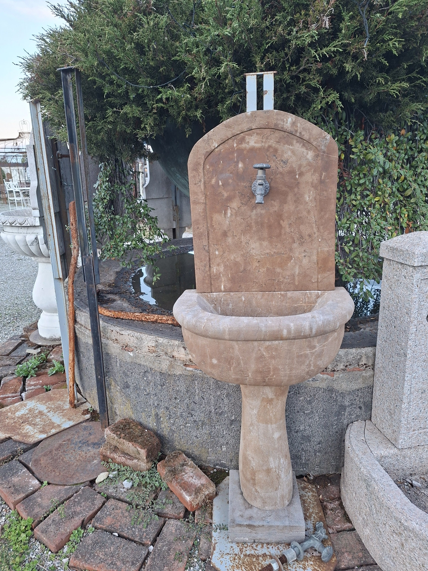 Fontana da parete in pietra calcarea, primi 900. Dimensioni: Altezza 140 cm – Larghezza 57 cm – Profondità 37 cm Spese di spedizione a carico cliente. Per maggiori informazioni: info@antichitadaziano.com
