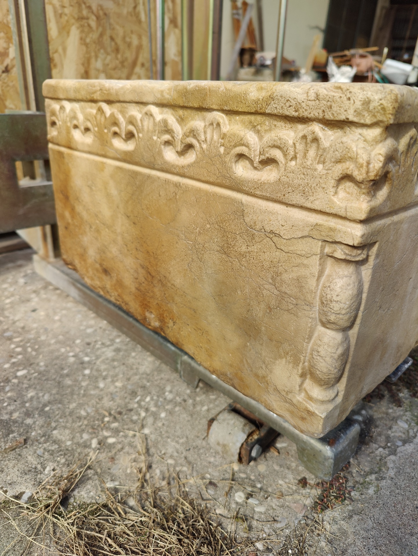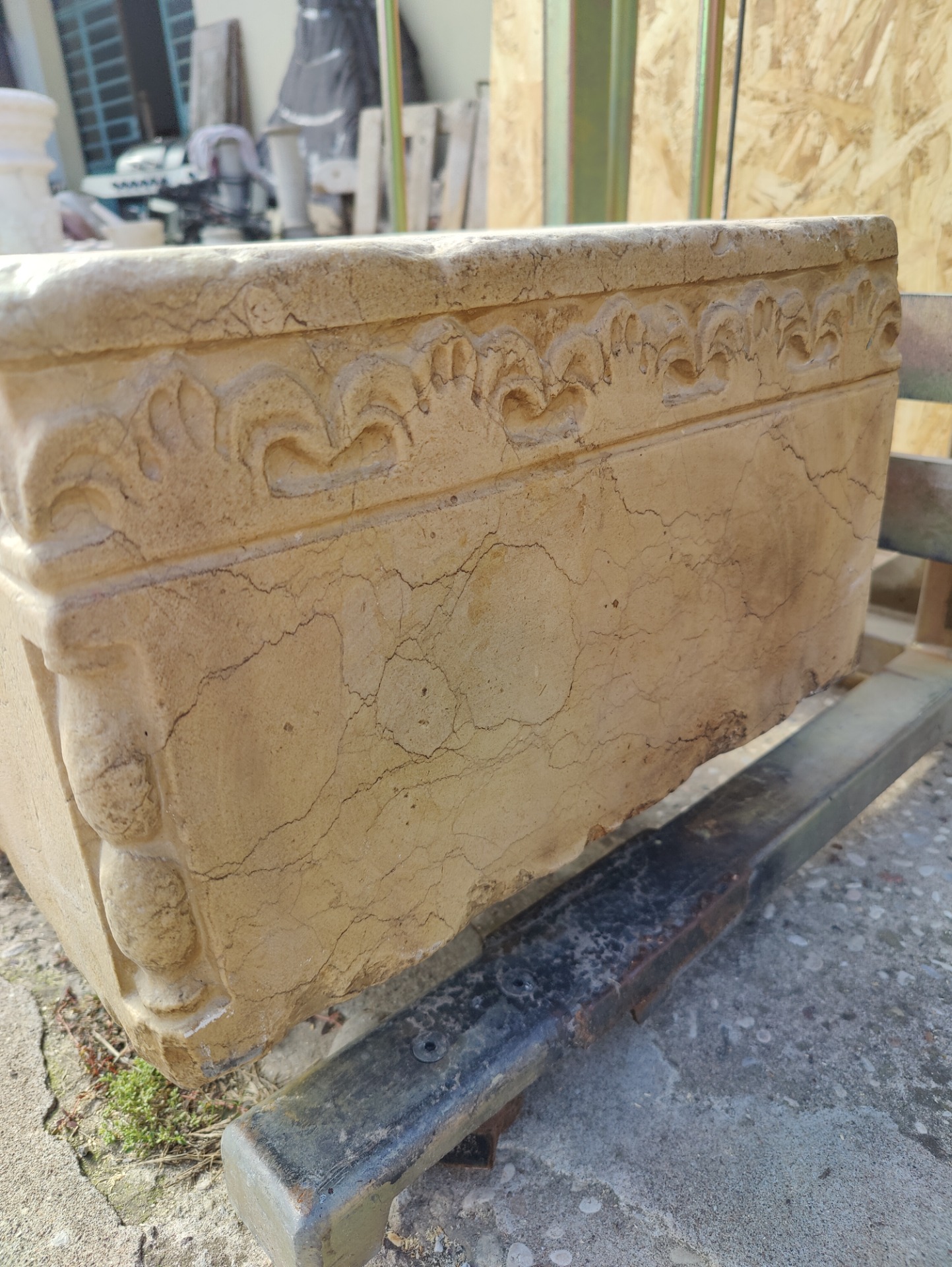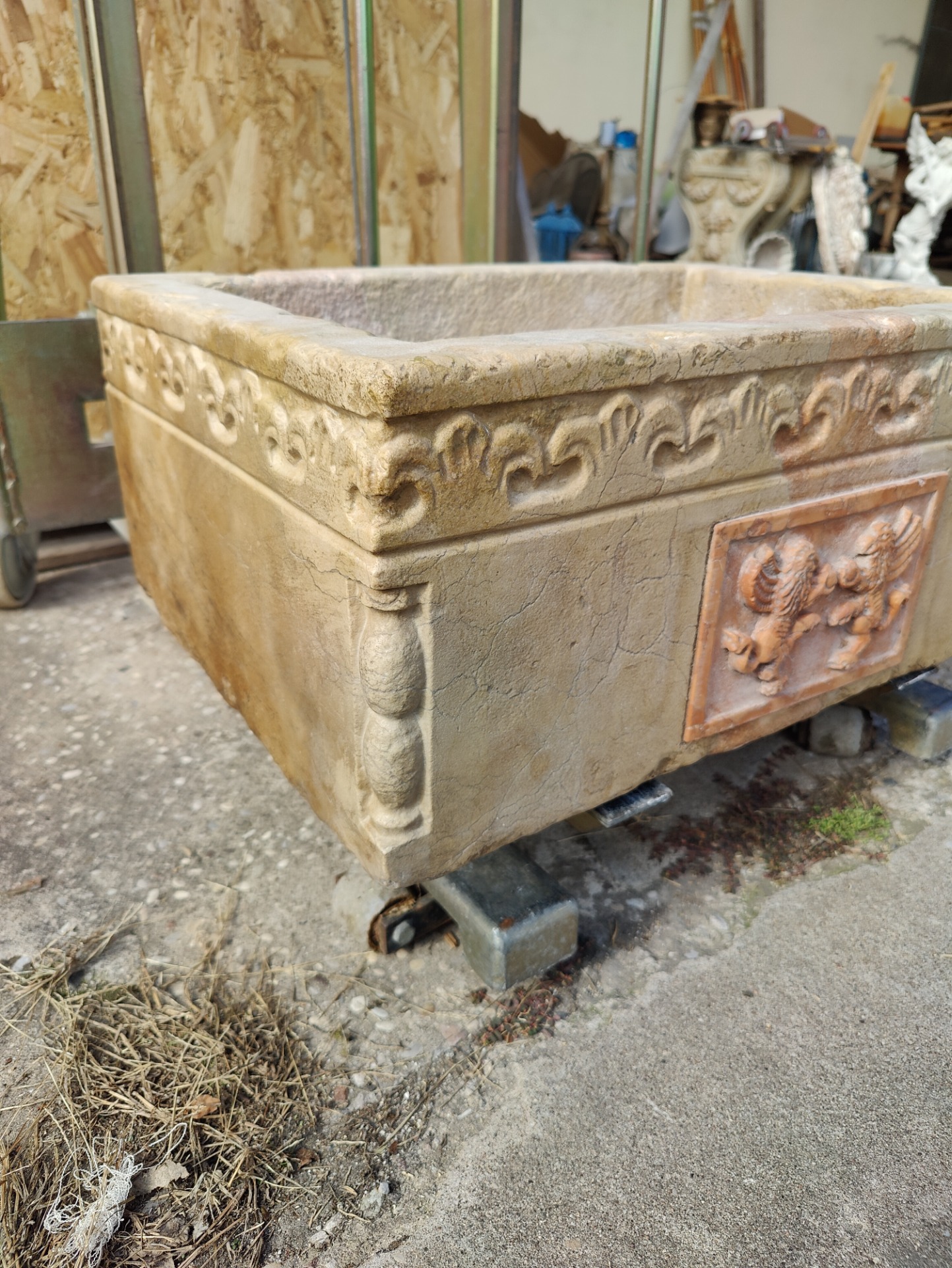 Favoloso Lavandino finemente scolpito in Marmo botticino con intarsio centrale in marmo rosso Verona, proveniente da Venezia, collezione privata. Magnifiche le decorazioni ed il particolare delle colonne sugli angoli. Oggetto di ottima fattura, raffinato ed elegante. Notevole l'intarsio che accompagna la particolare venatura rossa della parte frontale. Si predispone per essere adoperato come lavandino da esterno o anche da interno. Di medie/grandi dimensioni, proporzionato e di peso opportuno. E' già predisposto di foro. Bella la patina e la venatura del marmo. Si presenta in ottime condizioni, integro in tutte le sue parti. Sarà spedito con cassa di legno, spedizioni in tutto il Mondo a prezzi contenuti, in sicurezza e tracciabile. Disponibile anche il ritiro presso il nostro magazzino. Misure: - Larghezza 58 cm - Profondità 42 cm - Altezza 25 cm - Misure interne: 32 x 48 cm