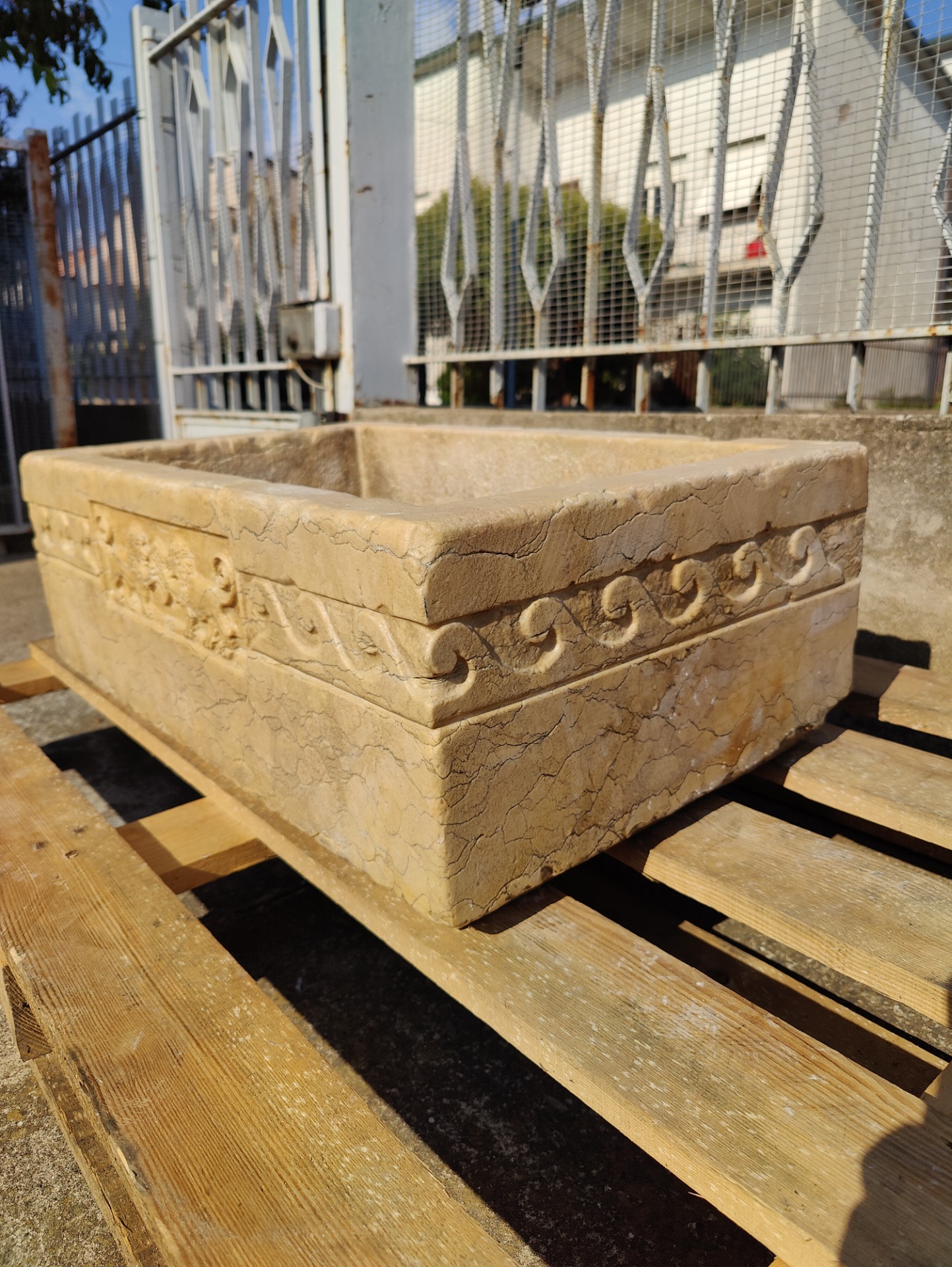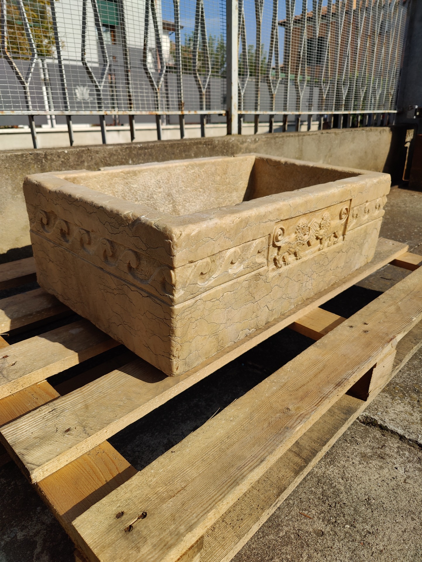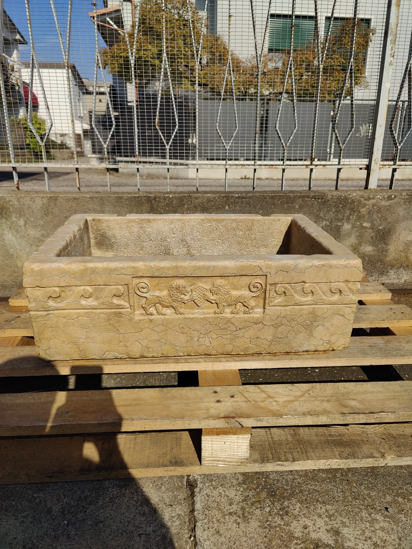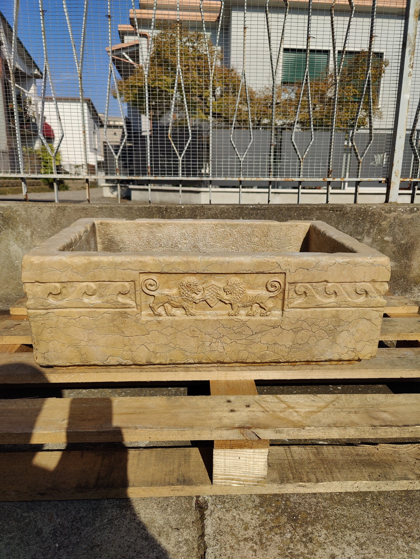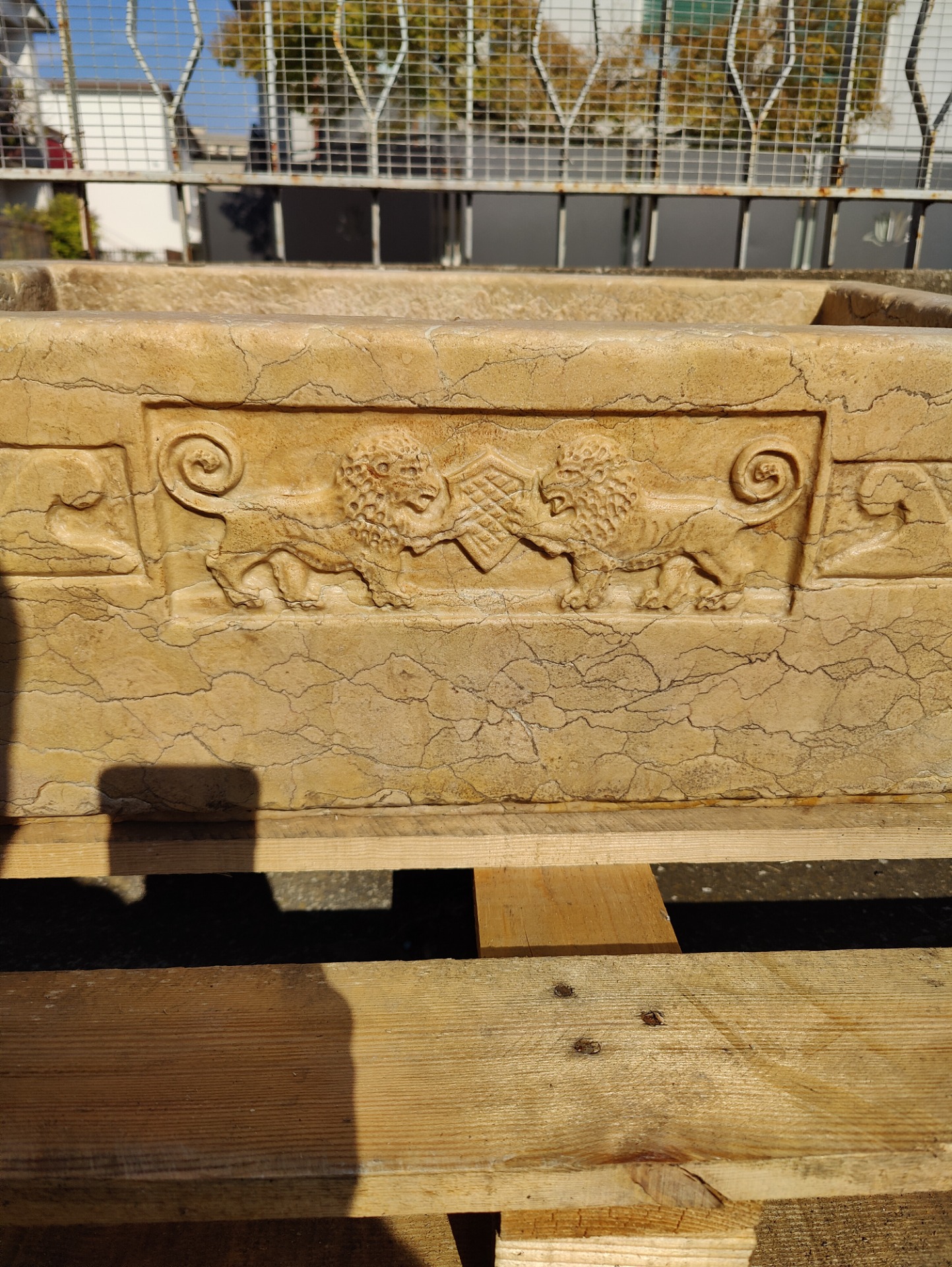 Meraviglioso lavandino in marmo botticino finemente decorato e con due leoni affrontati sulla parte frontale.