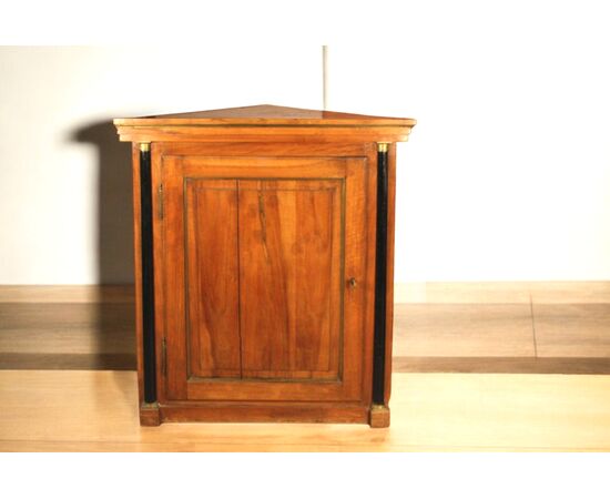 Particolare ed elegante angoliera impero, in noce biondo con mezza colonna ebanizzata e capitelli in metallo dorato.