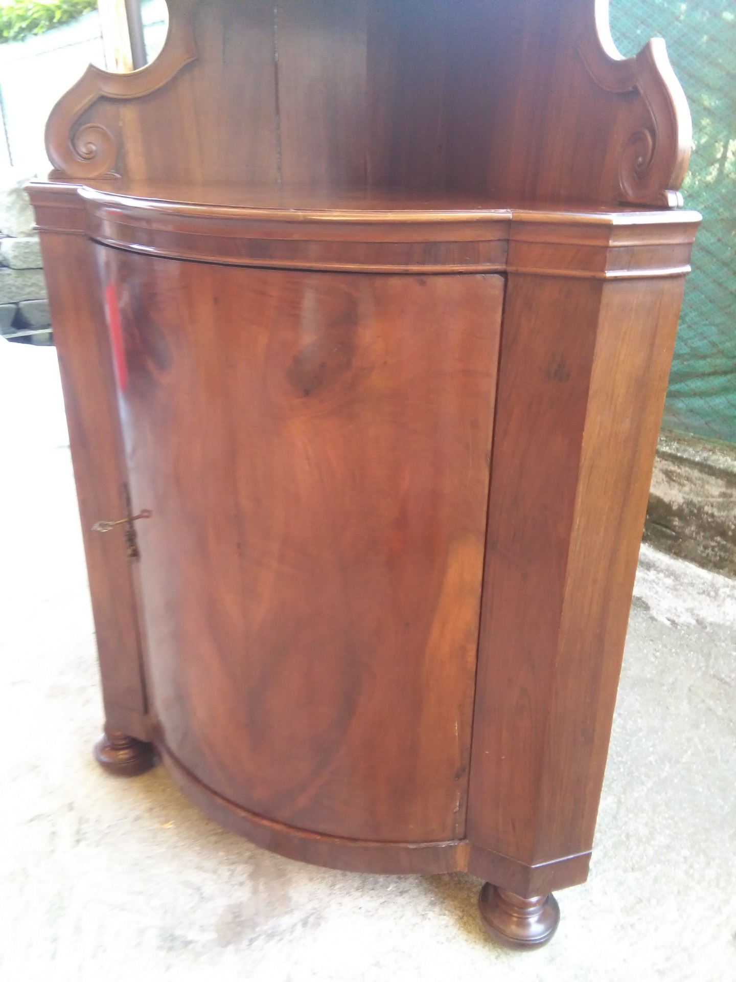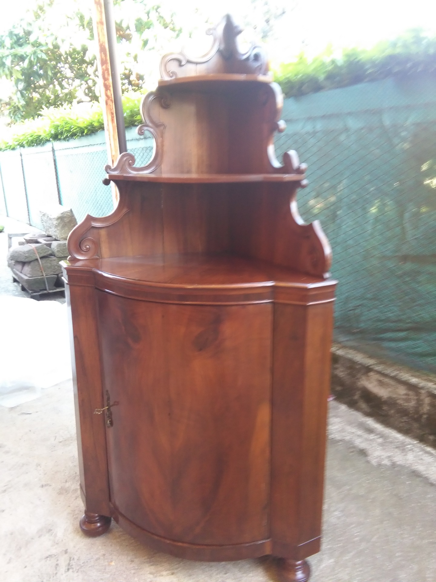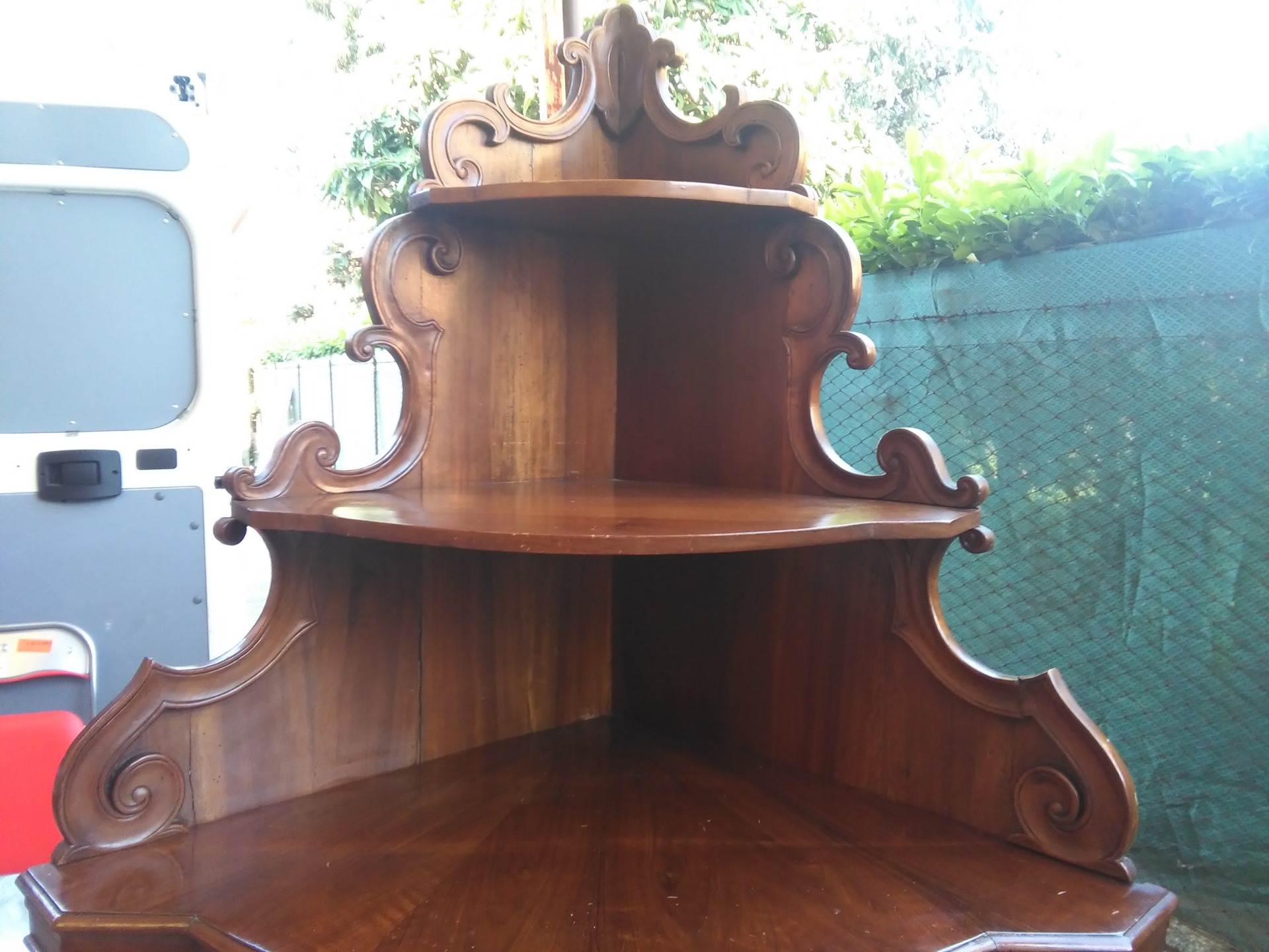 ANGOLIERA in noce mossa con alzatina,primi 800Lato 68x68 Altezza base 106 Altezza tot 192 Per info 3282493057. mi