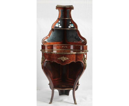 Angoliera francese di inizio 1800, stile Luigi XV, in legno di bois de rose con intarsi su fondo ebano. Presenta alzatina con specchio che termina con ringhierina in bronzo, ricche sono anche le applicazioni in bronzo su gambe piedini e su tutta la superficie dell'angoliera. L'intarsio centrale...