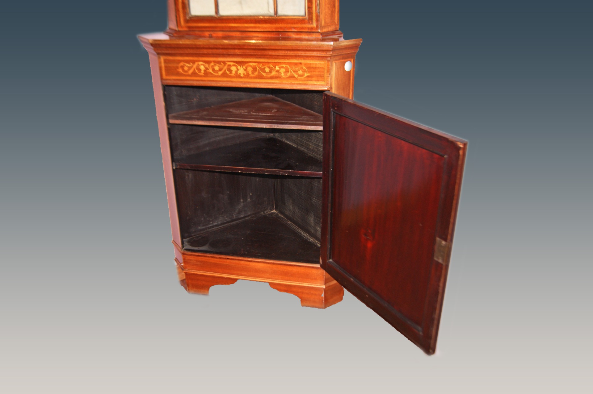 Coppia di graziosissime angoliere a vetrina inglesi della seconda metà del 1800, stile Vittoriano, in legno di mogano riccamente intarsiate. Presentano corpo superiore formato anta a vetrina e nell'estremità alta da elaborato cappello intarsiato, il corpo inferiore è dotato di antina chiusa intarsiata.