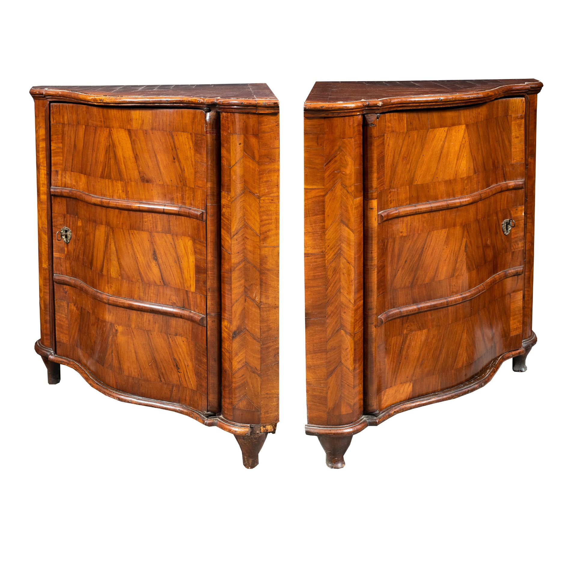 Coppia di angoliere lastronate in legno di noce. Venezia, XVIII secolo.
