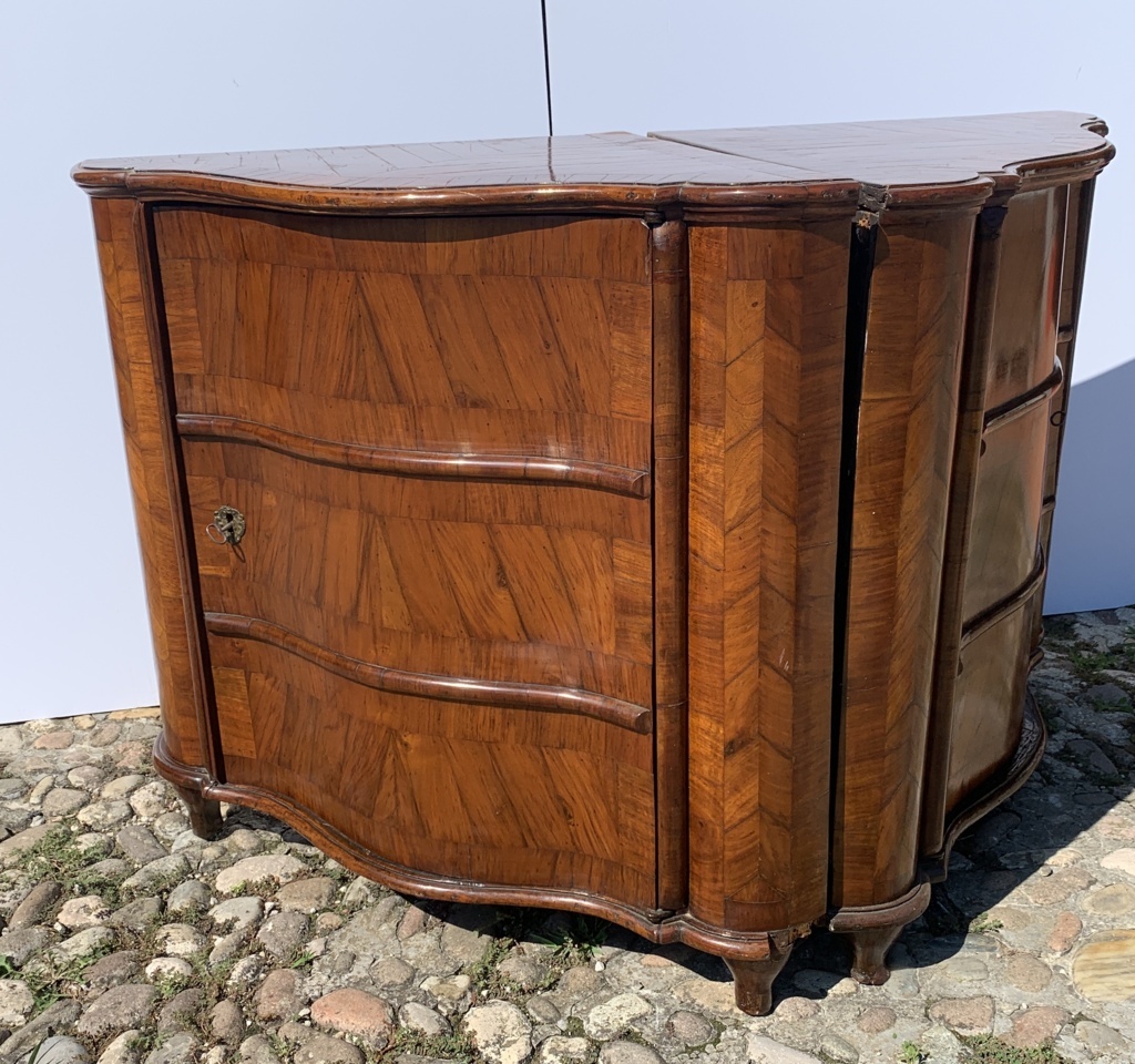 Manifattura veneziana della metà del XVIII secolo secondo lo stile Rococò/Luigi XV. Mosse sul fronte ad un anta centrale e piedini a ricciolo.