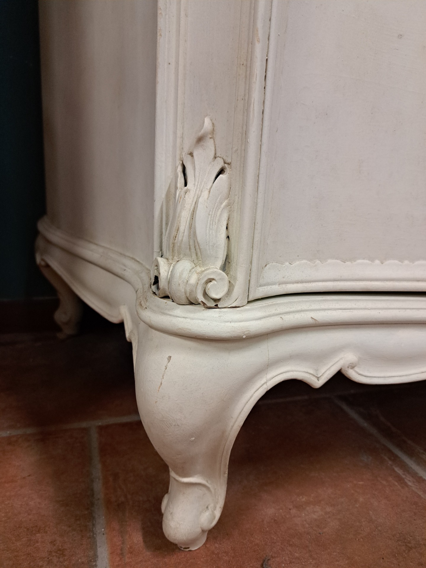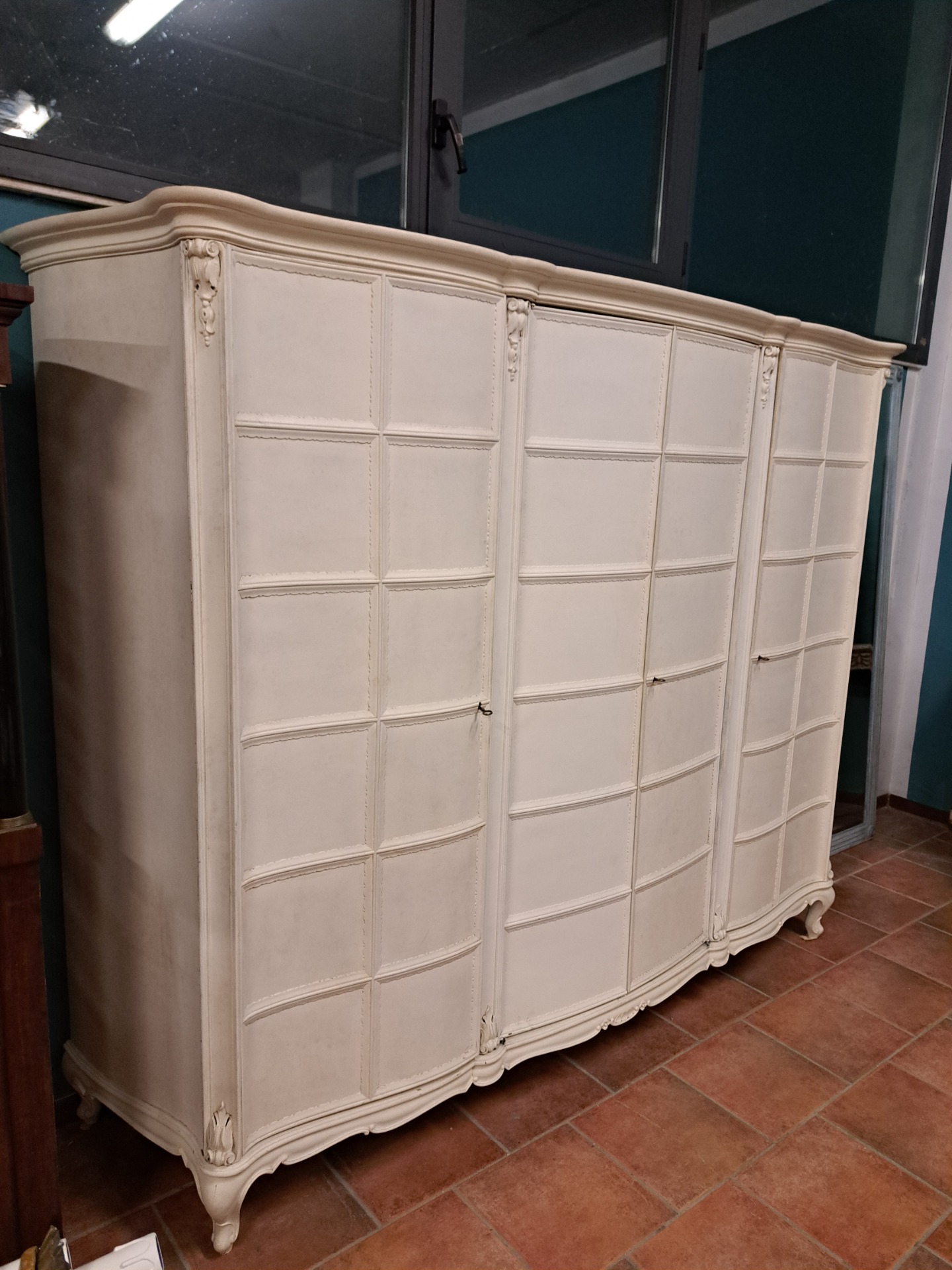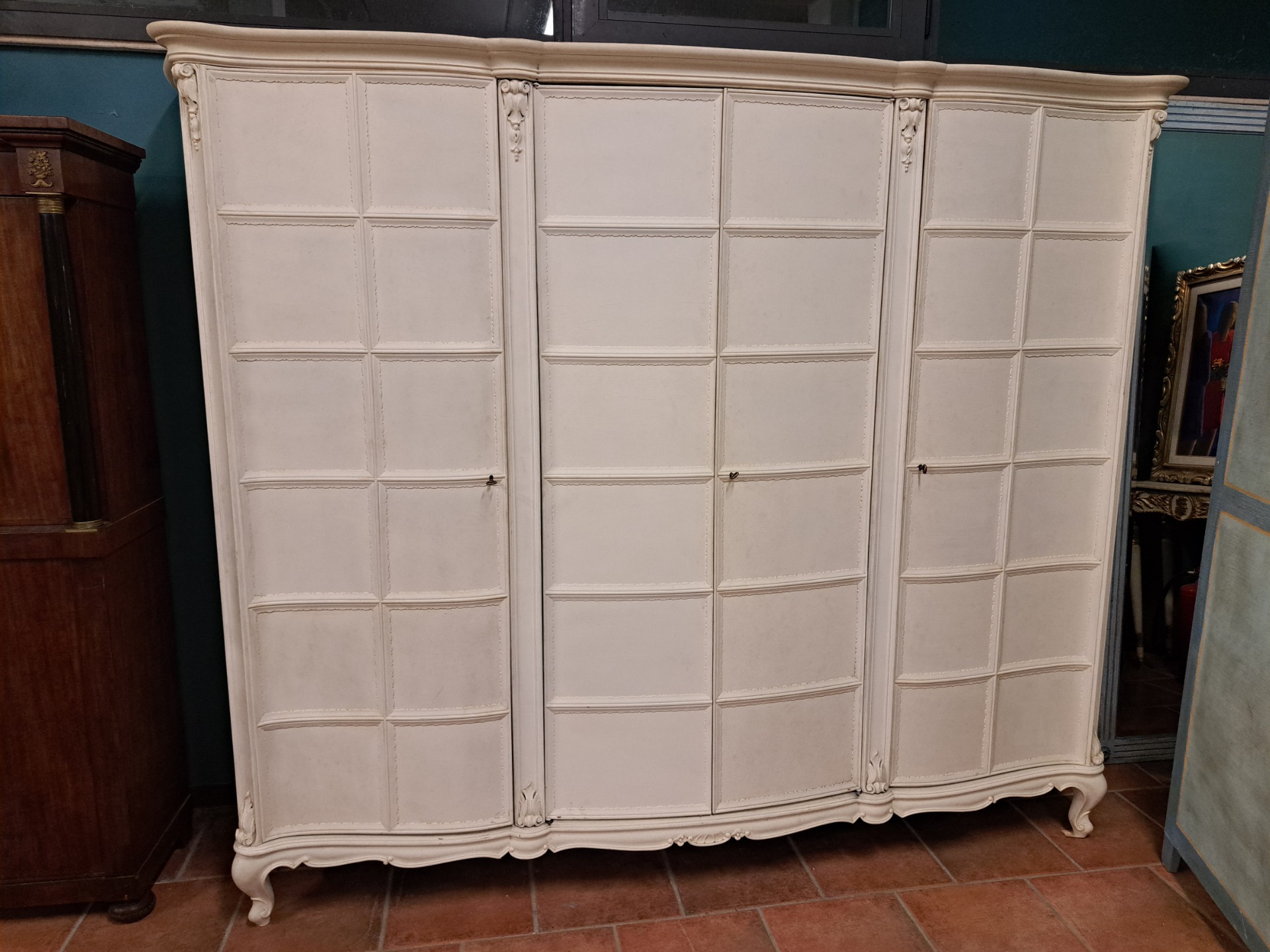 Delizioso armadio a 4 ante del XX° secolo dipinto nel tono dell'avorio.Interamente mosso sul fronte e sui fianchi, 2 specchi coevi montati internamente agli sportelli centrali, piedi e grembialina  elegantemente mossi. Completamente smontabile.