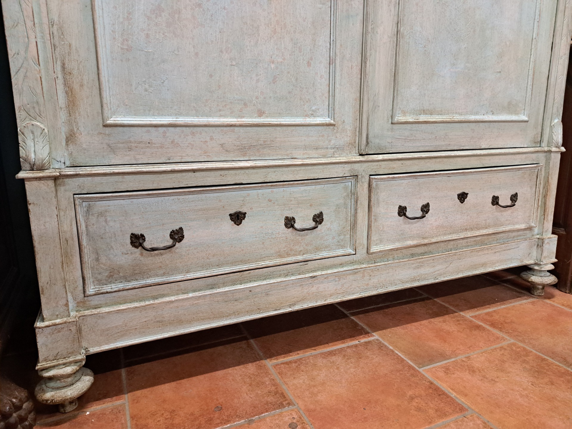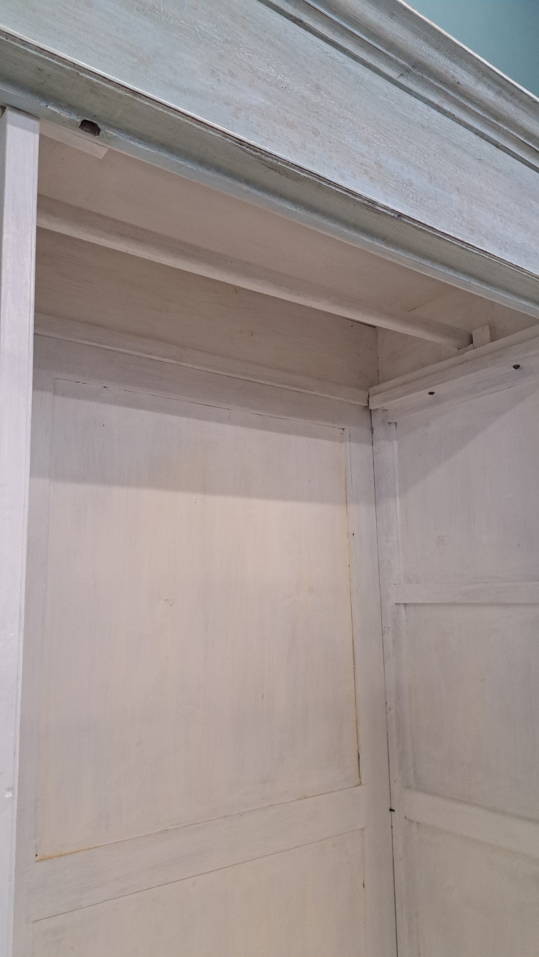 Bellissimo armadio della seconda metà dell'Ottocento laccato nei toni del celeste, due cassetti esterni, internamente suddiviso in una parte con palo per appenderia e una parte con tre ripiani. Possibilità di avere anche il palo dall'altra parte. completsmente smontabileMisure: 156 x 53, altezza 224