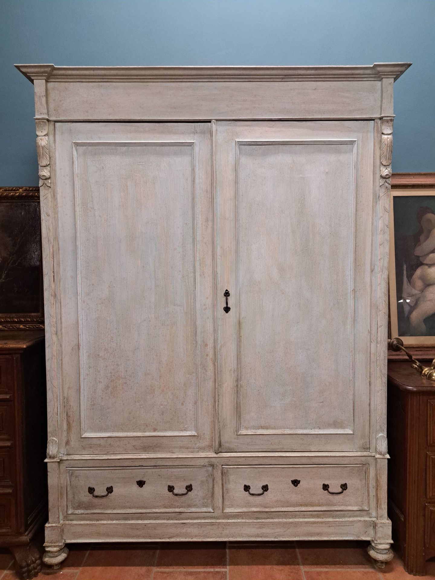 Bellissimo armadio della seconda metà dell'Ottocento laccato nei toni del celeste, due cassetti esterni, internamente suddiviso in una parte con palo per appenderia e una parte con tre ripiani. Possibilità di avere anche il palo dall'altra parte. completsmente smontabileMisure: 156 x 53, altezza 224