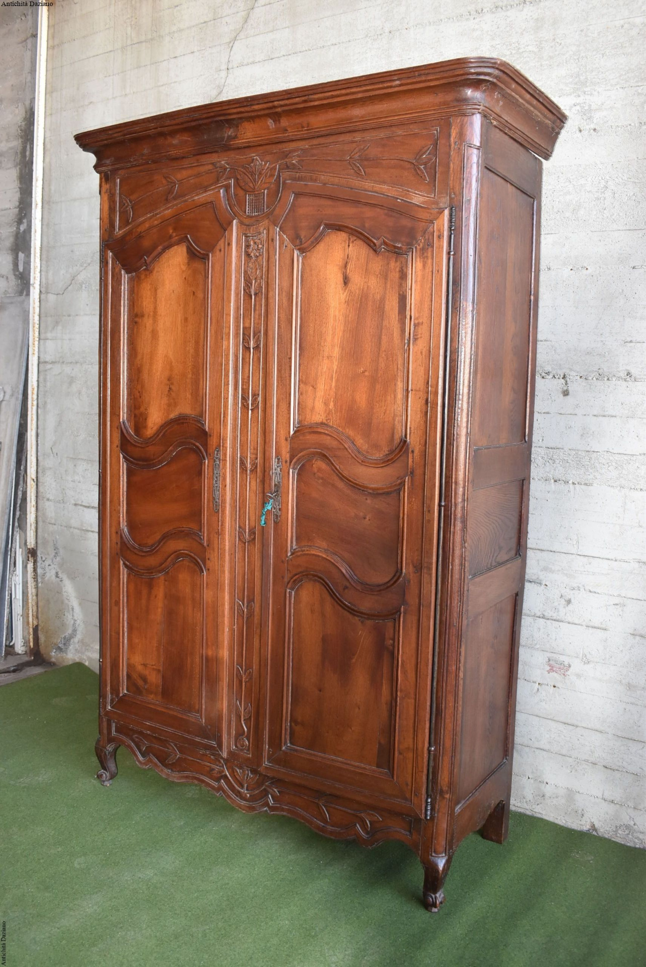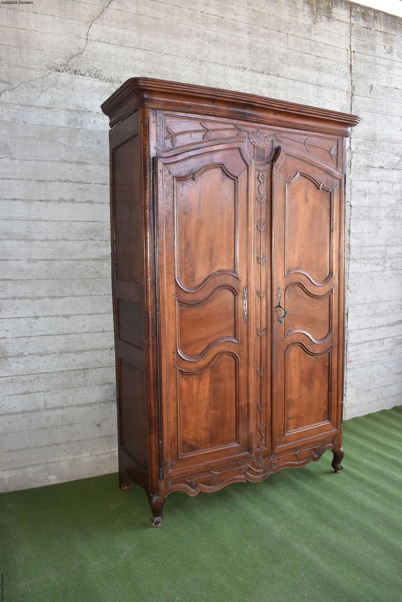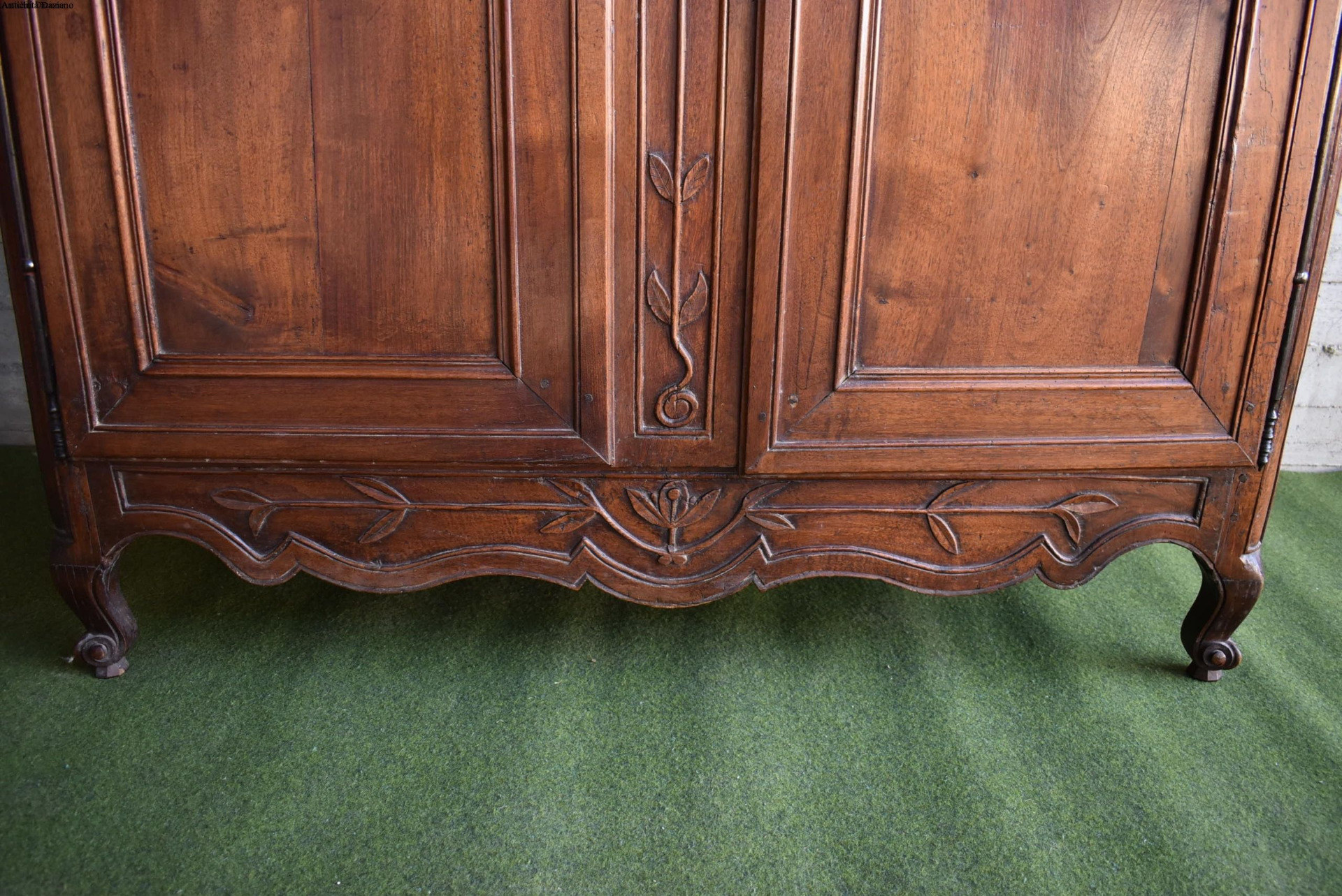 Armadio di ottima qualità, in noce a due ante, serramenti originali, con lavorazioni intagliate a mano all’ epoca con soggetti: foglie e fiori.