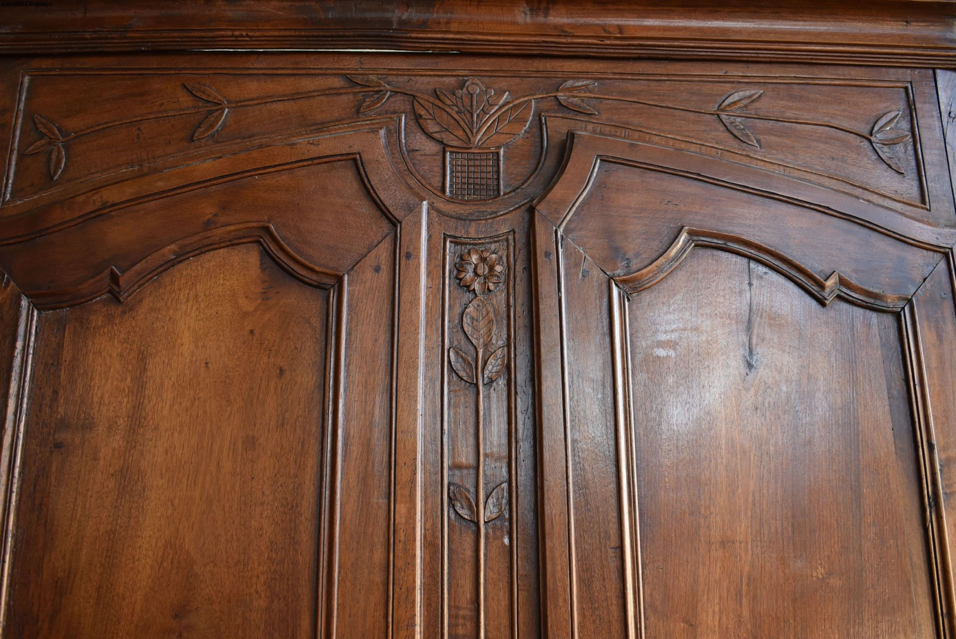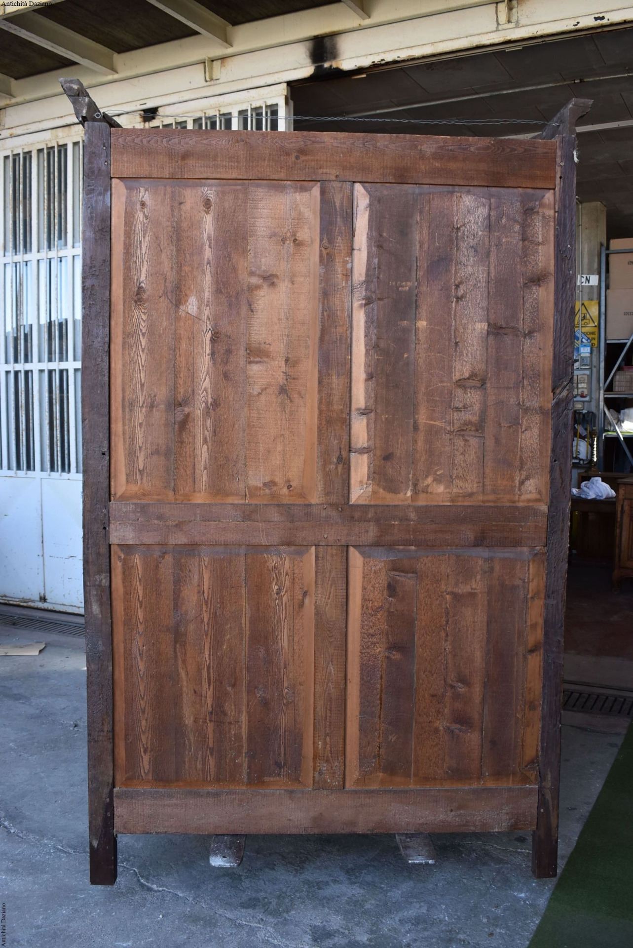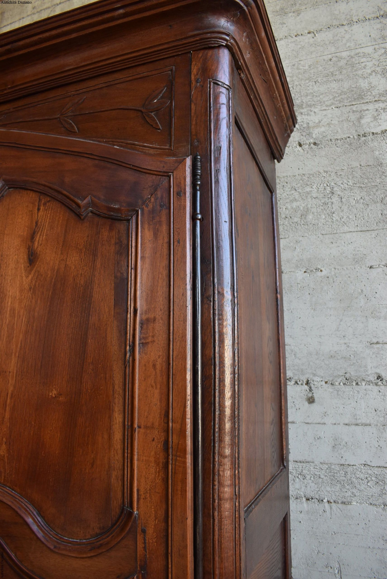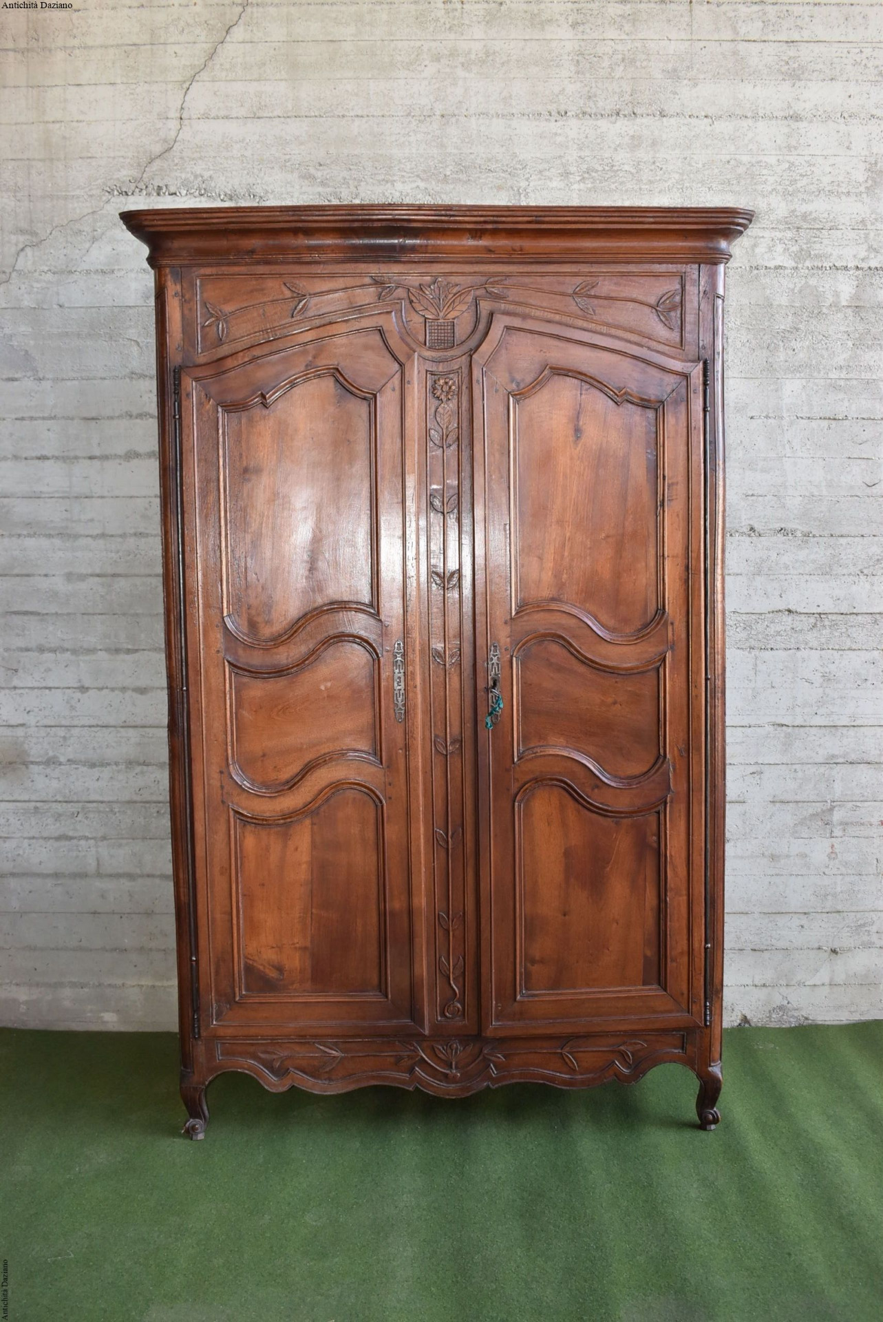 Armadio di ottima qualità, in noce a due ante, serramenti originali, con lavorazioni intagliate a mano all’ epoca con soggetti: foglie e fiori.