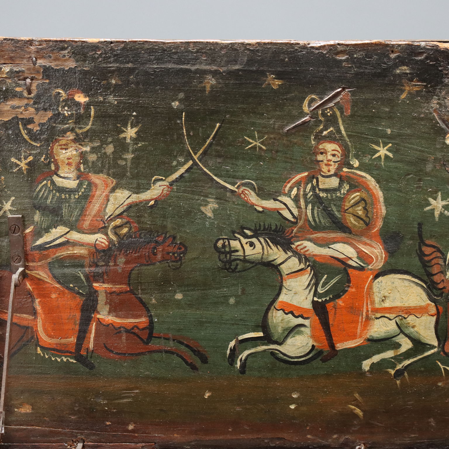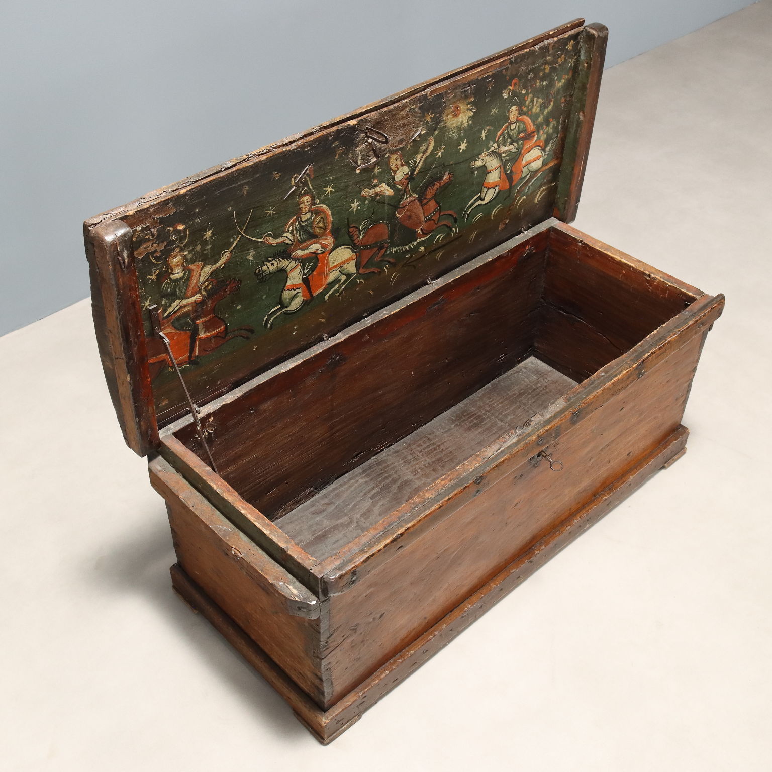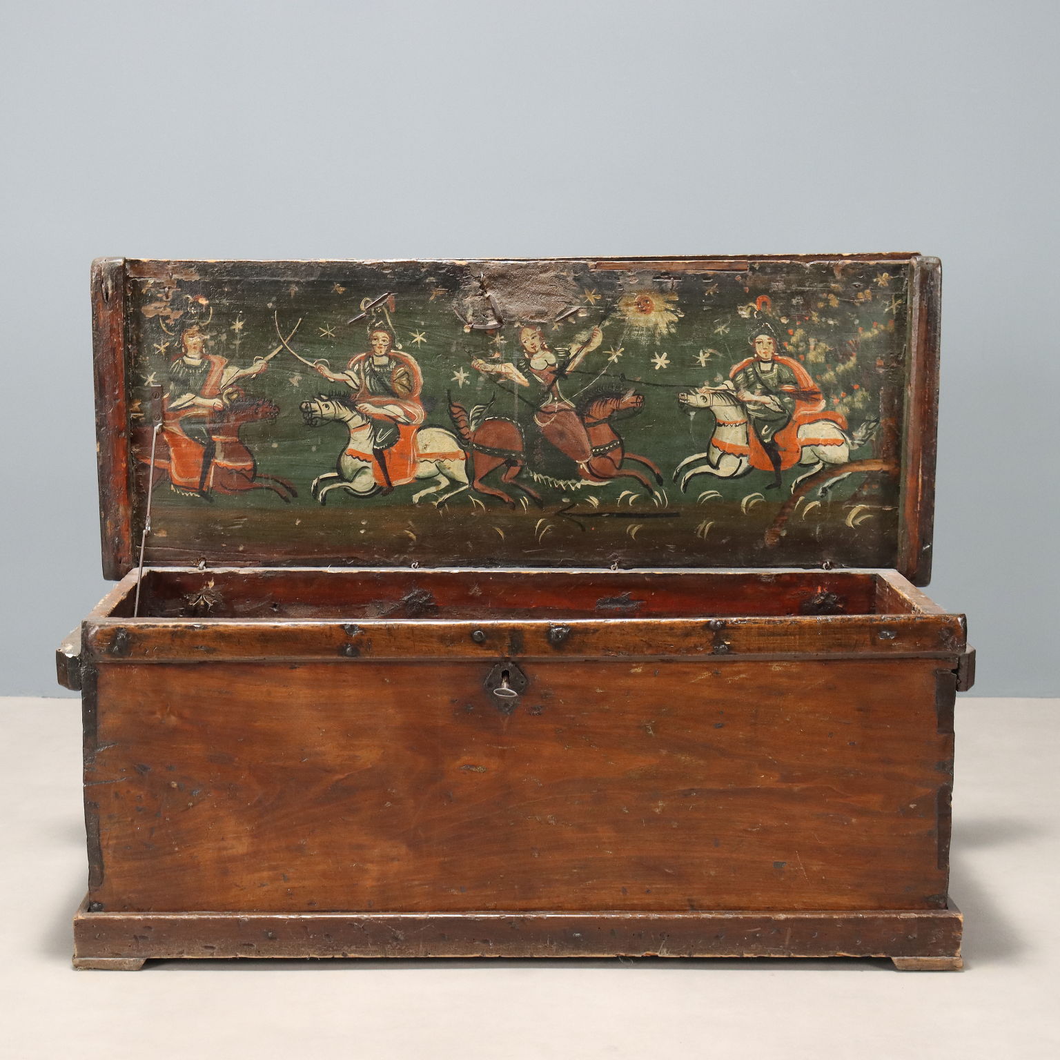 Baule in pioppo, fasce laterali con funzione di maniglie per il trasporto, piano superiore inarcuato esteriormente, impreziosito internamente da dipinto raffigurante cavalieri e dama. Italia, XVIII Secolo.