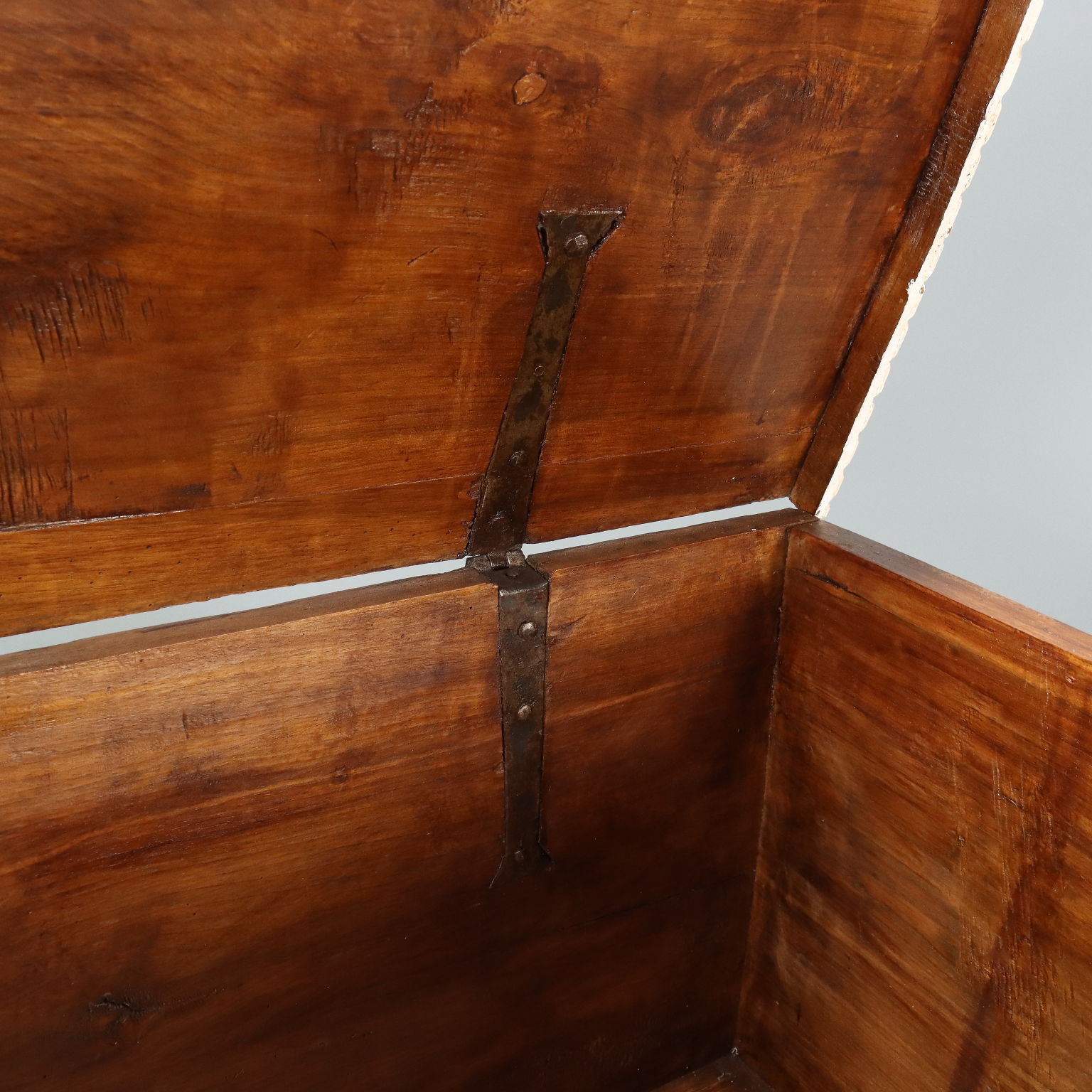 Cassapanca in noce, realizzata nella prima metà del XVIII secolo, con piedi intagliati a piede ferino, e fronte bipartito da cornici in rilievo, cerniere in ferro battuto. La superficie è stata laccata nei nostri laboratori con vernici naturali e preservando la reversibilità dell'arredo alle sue condizioni originali.