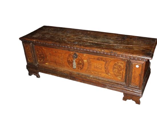 Grande cassapanca italiana veneta del 1600 in legno di noce. Presenta corpo frontale impreziosito da ricchi motivi di intarsio.