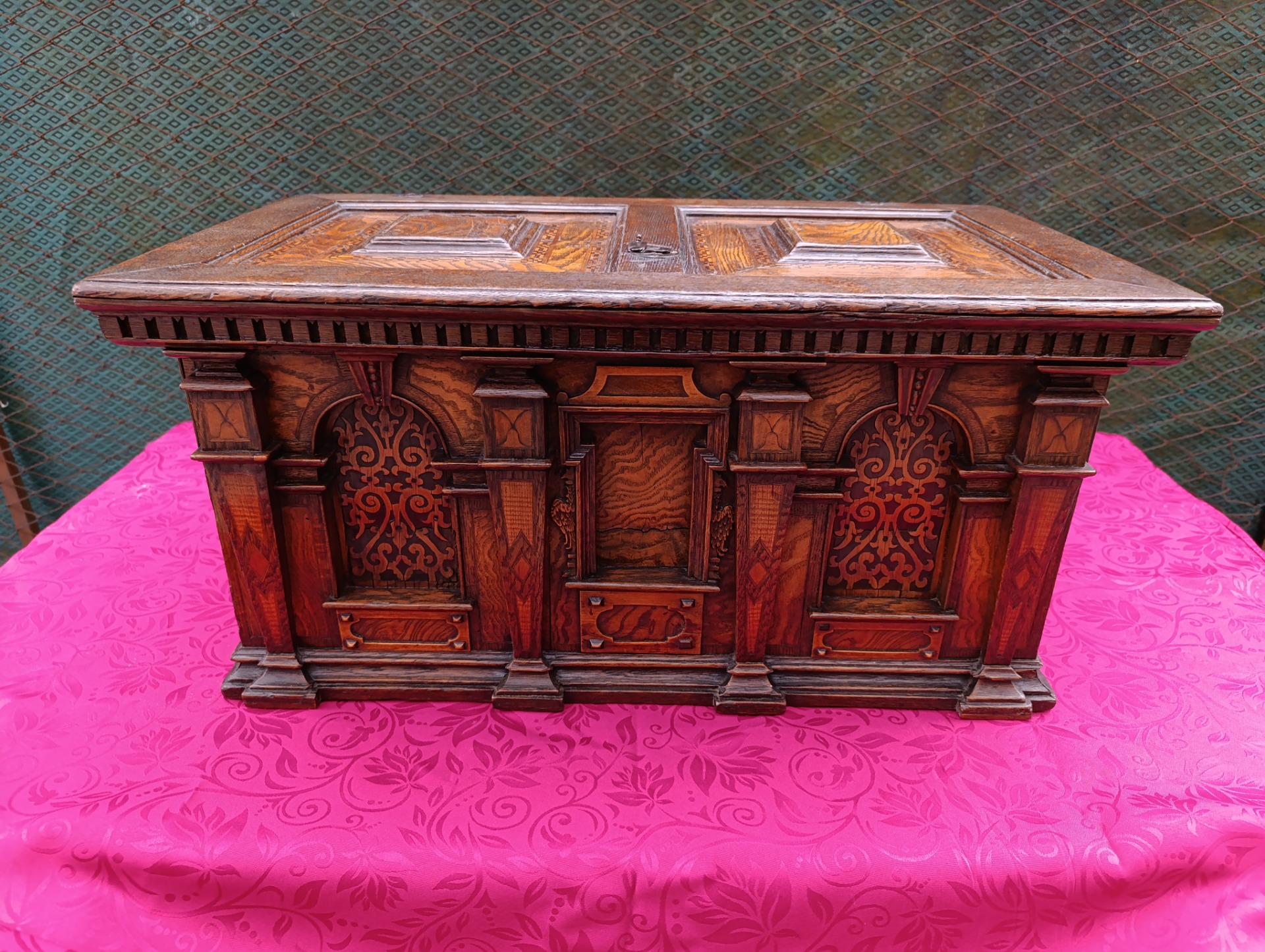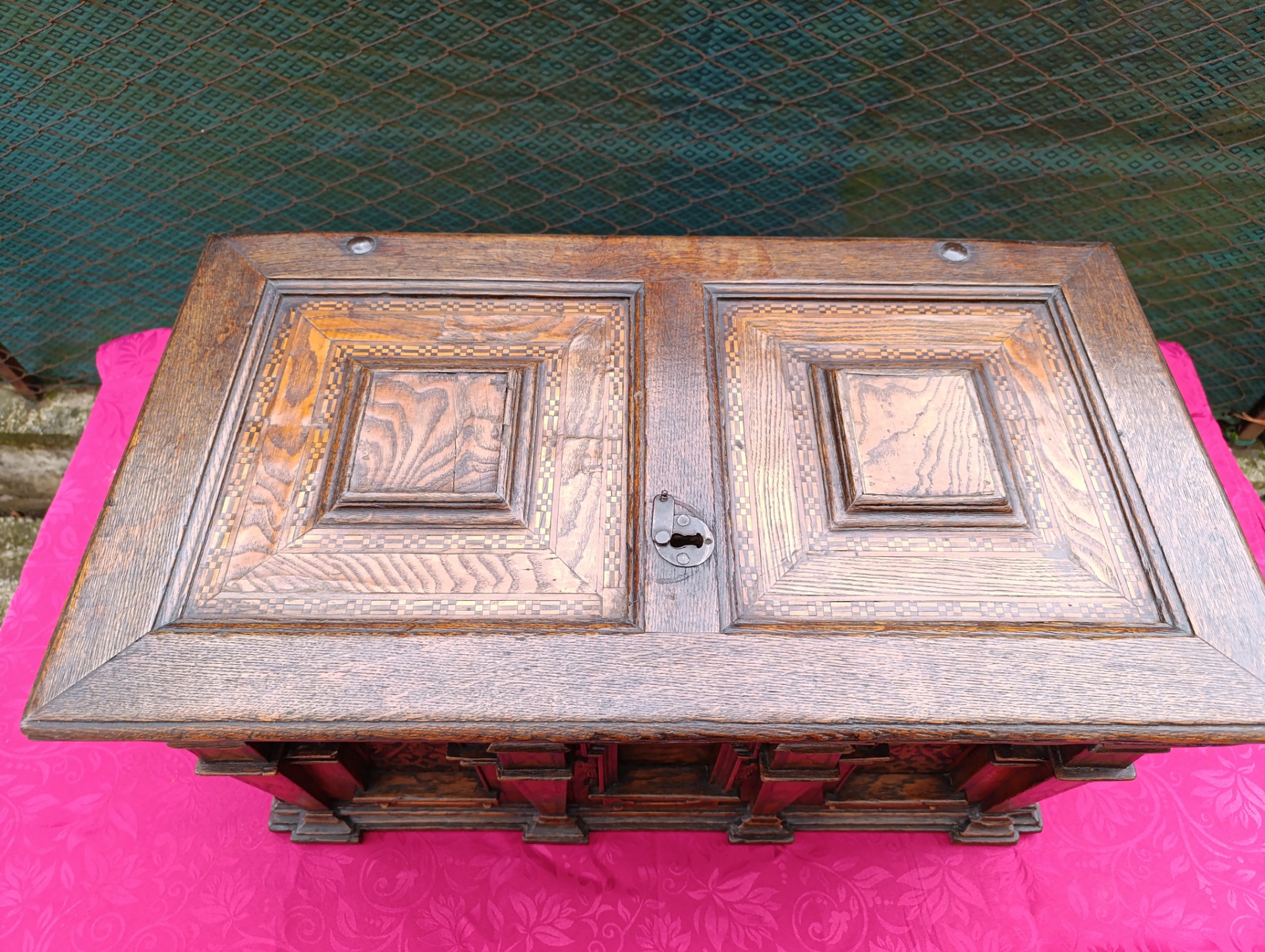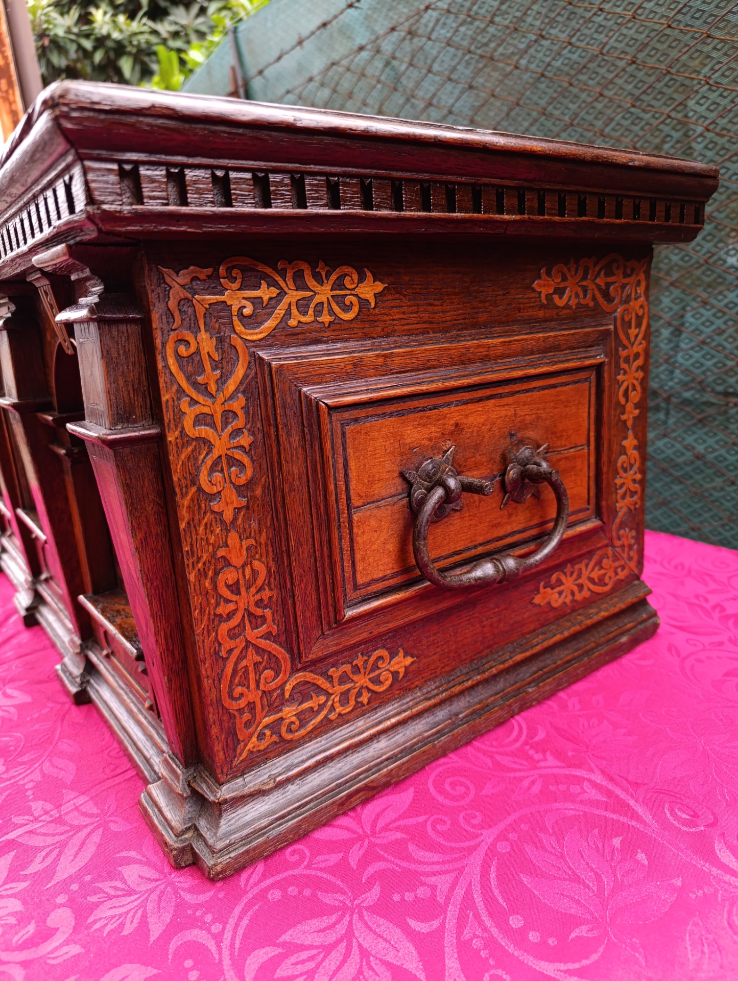 Piccola cassapanca epoca 800 intarsiata ferramenta originale ,come si vede dalle foto manca la serratura "siamo alla ricerca" il bello del nostro lavoro.Mis: