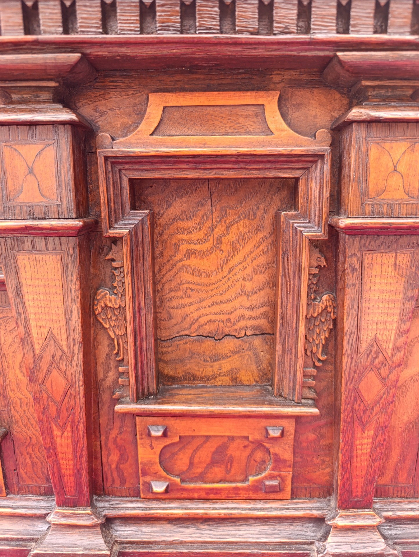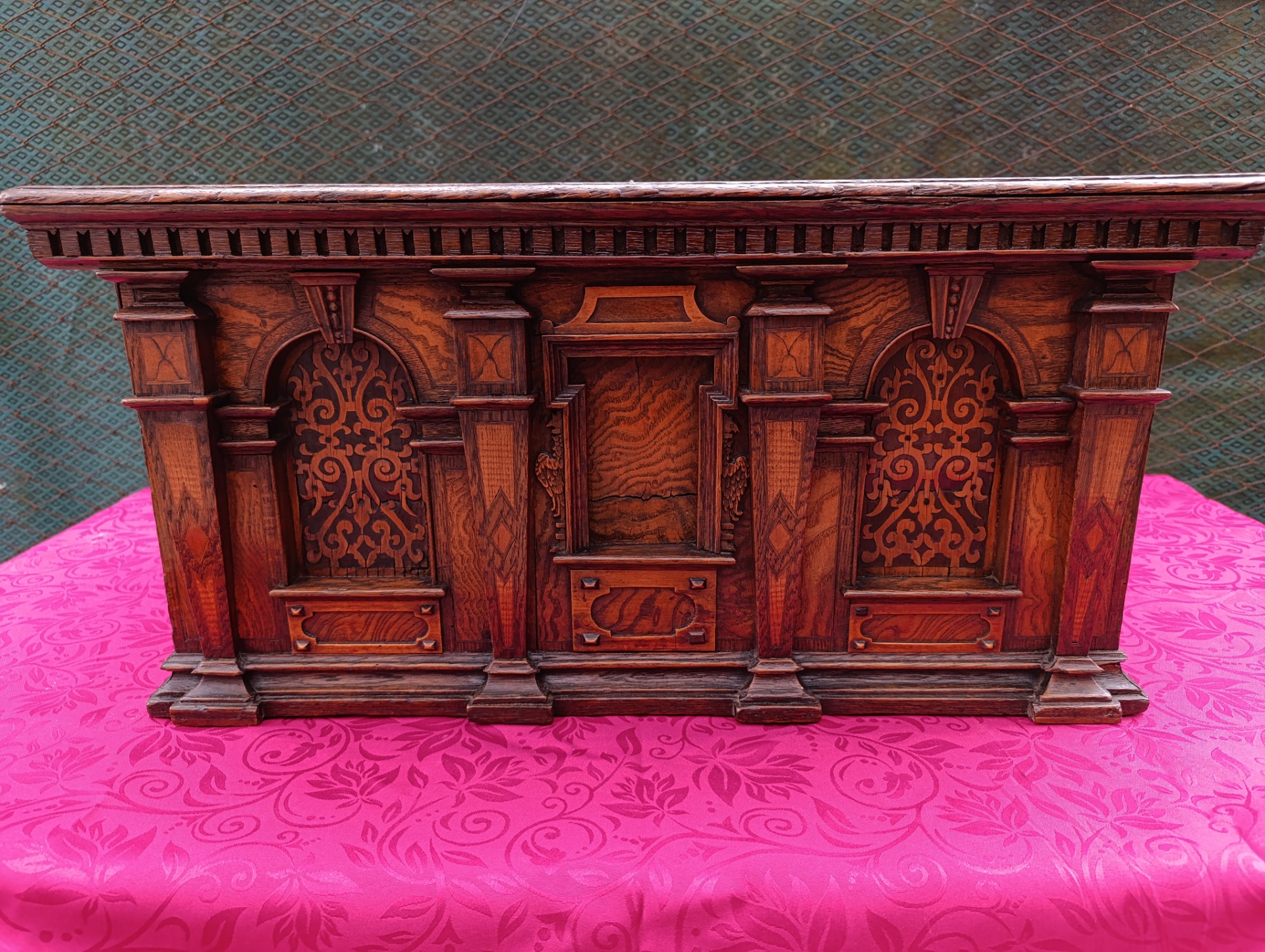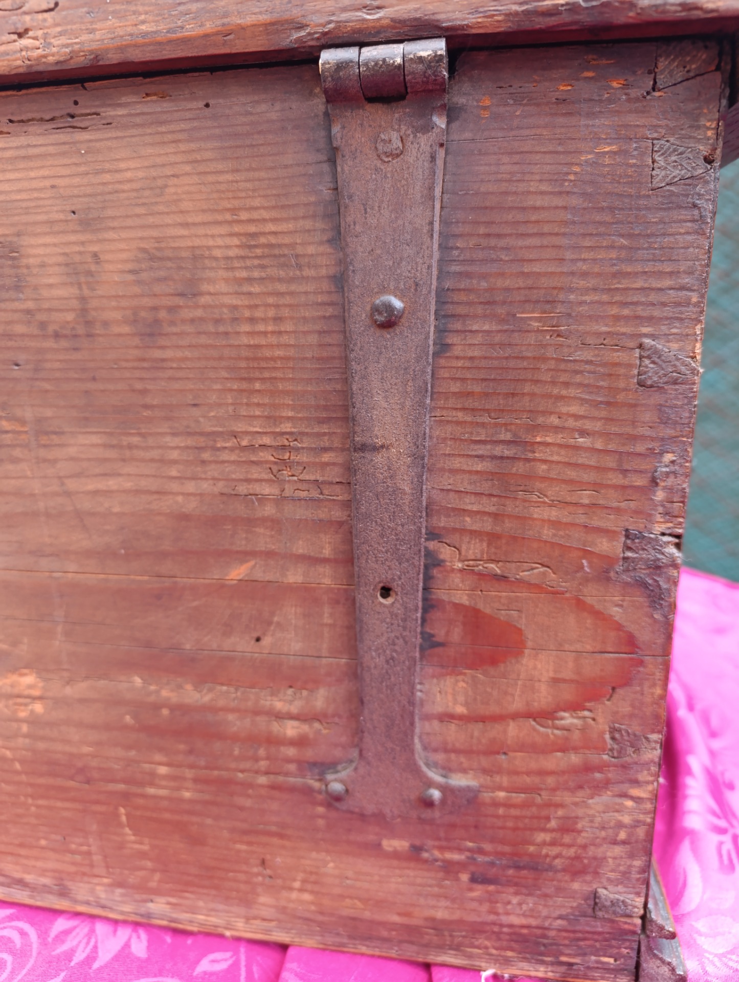 Piccola cassapanca epoca 800 intarsiata ferramenta originale ,come si vede dalle foto manca la serratura "siamo alla ricerca" il bello del nostro lavoro.Mis: