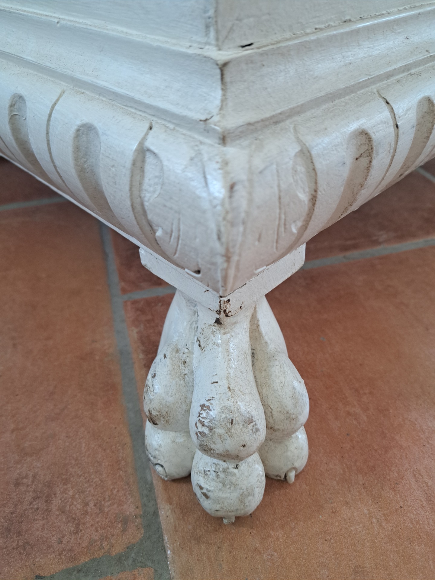 Deliziosa ed inusuale piccola cassapanca dell'Ottocento in stile neorinascimentale in noce laccato nei toni dell'avorio. Piedi a zampe di leone con mascheroni frontale e laterali. Misure: 76 x 53, altezza 74