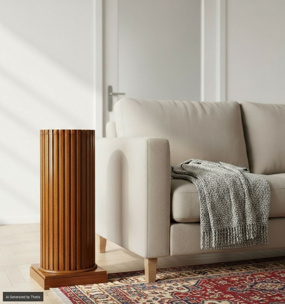 Colonna in noce, XIX secolo, il fusto privo di capitello è decorato da una fitta scanalatura e sul fronte è presente un'anta. Il fusto poggia su una sottile fascia stondata a sua volta su base quadrangolare, cm 110x47x47