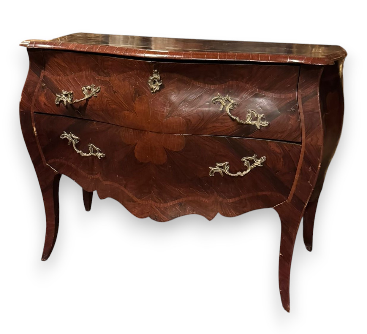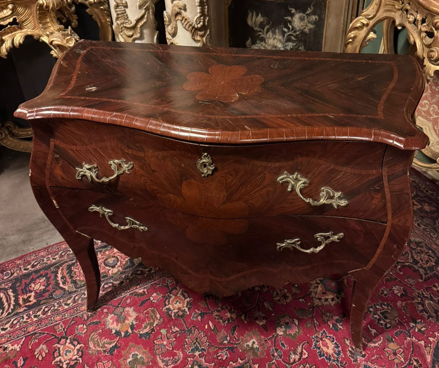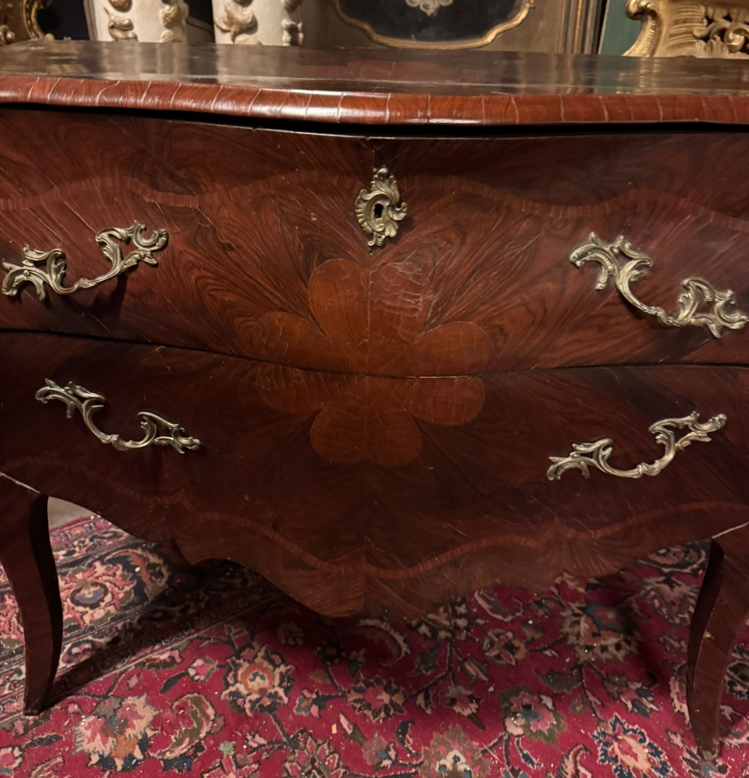 ARM256 - Comò bombato lastronato in noce, epoca '700, misure cm L 121 x P 55 x H 92