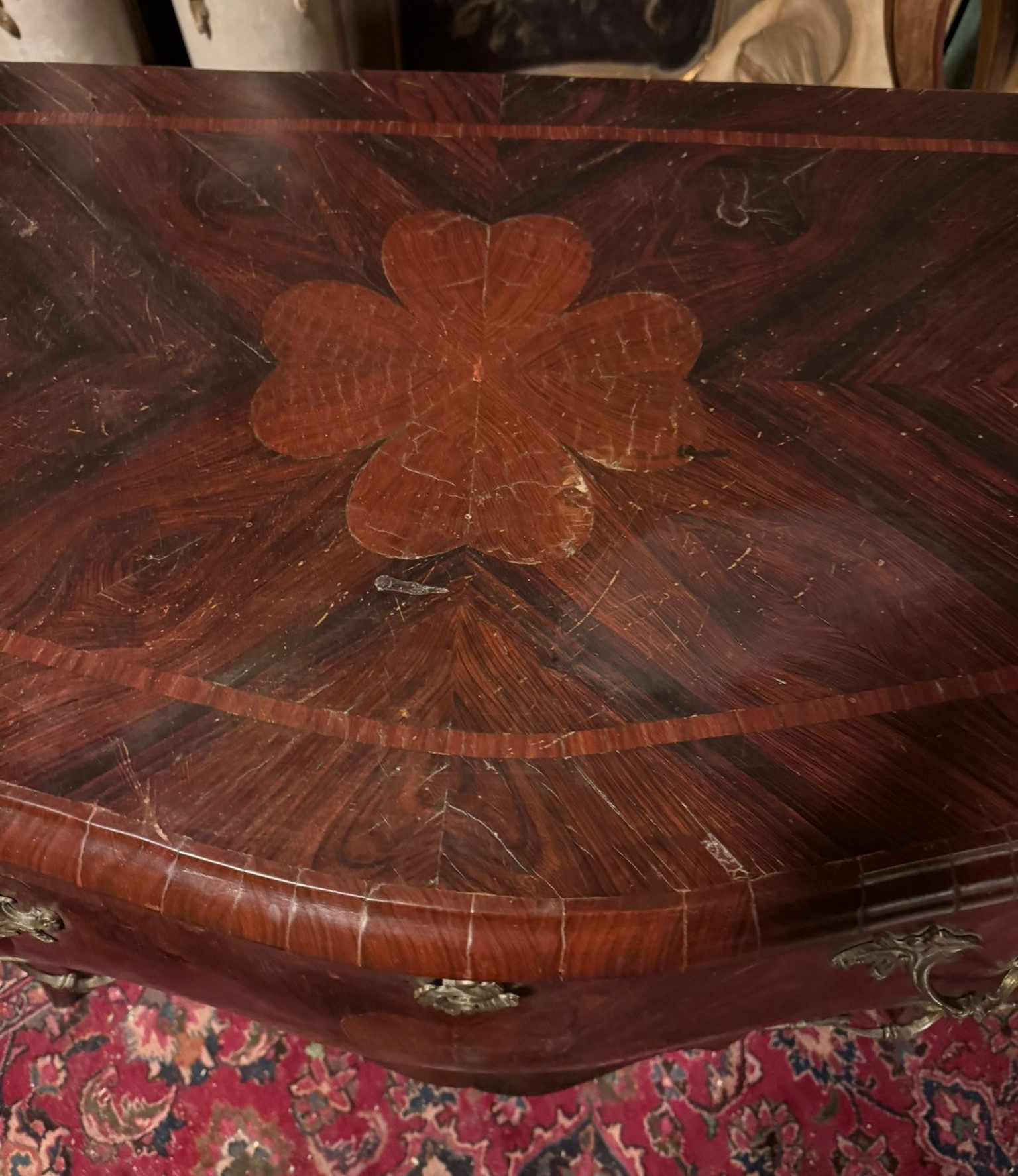 ARM256 - Comò bombato in legno di noce. E' lastronato con quadrifogli, presenta due cassetti completi di maniglie mosse in bronzo. Epoca '700. Misure cm L 121 x P 55 x H 92