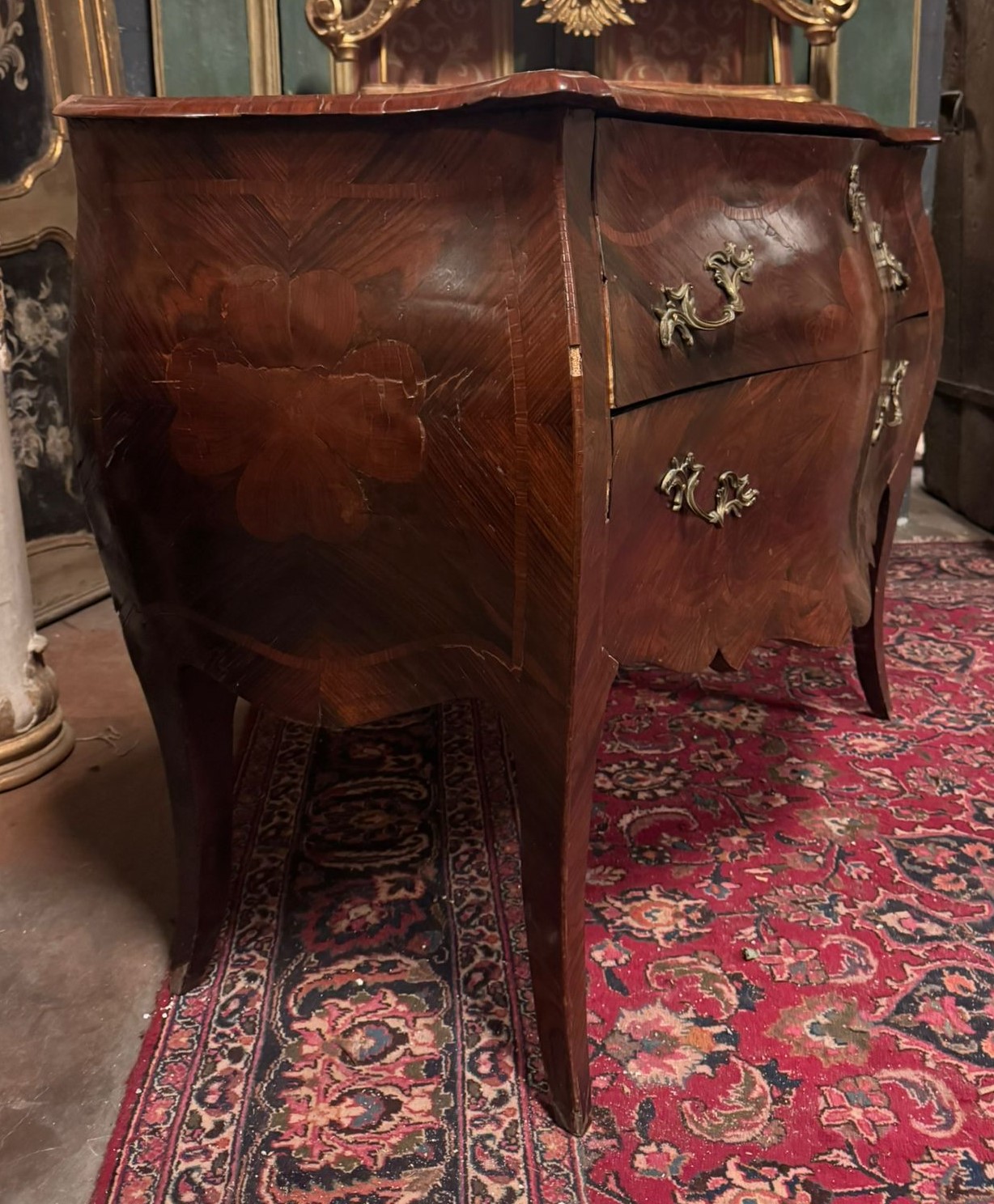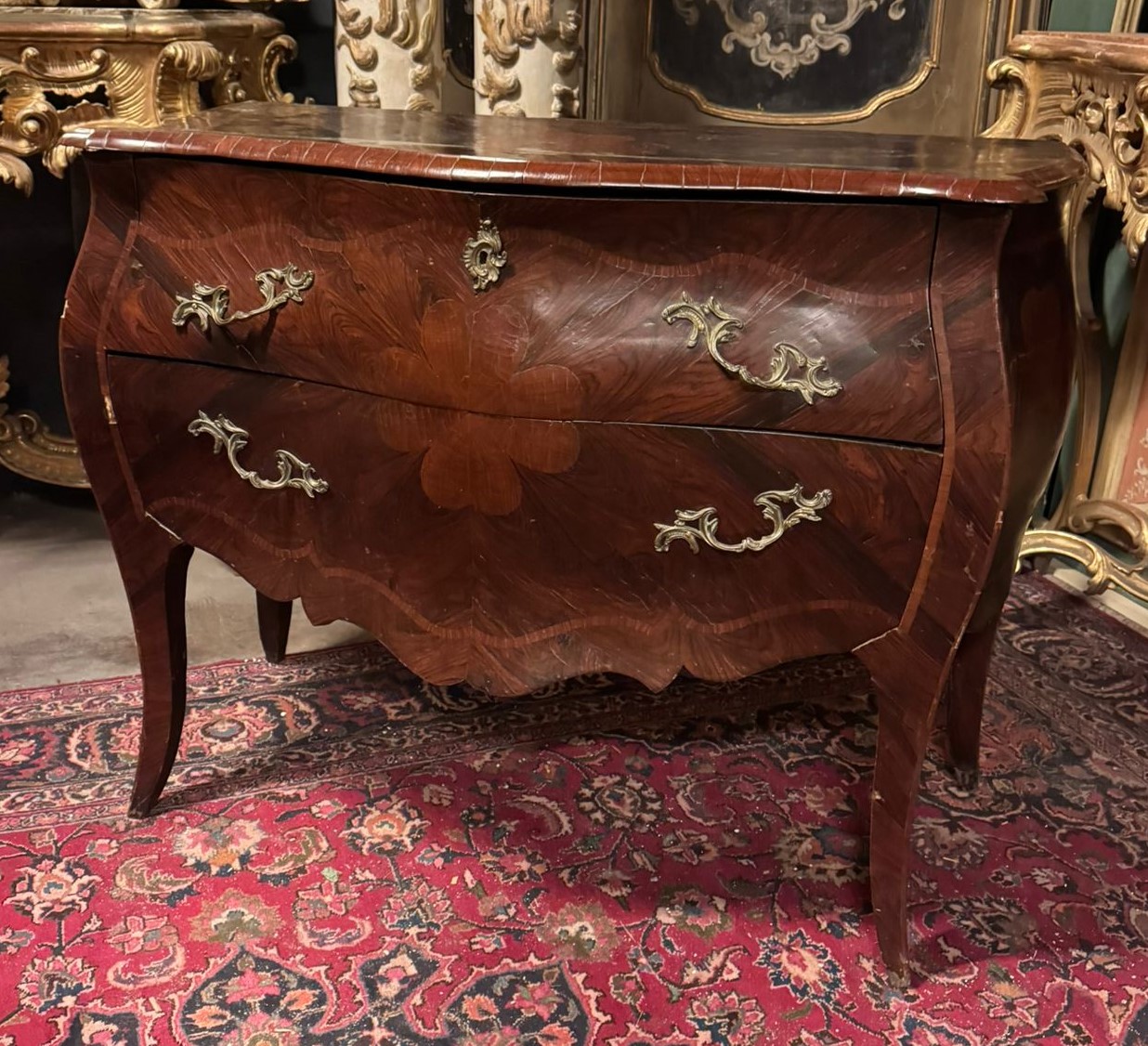 ARM256 - Comò bombato lastronato in noce, epoca '700, misure cm L 121 x P 55 x H 92
