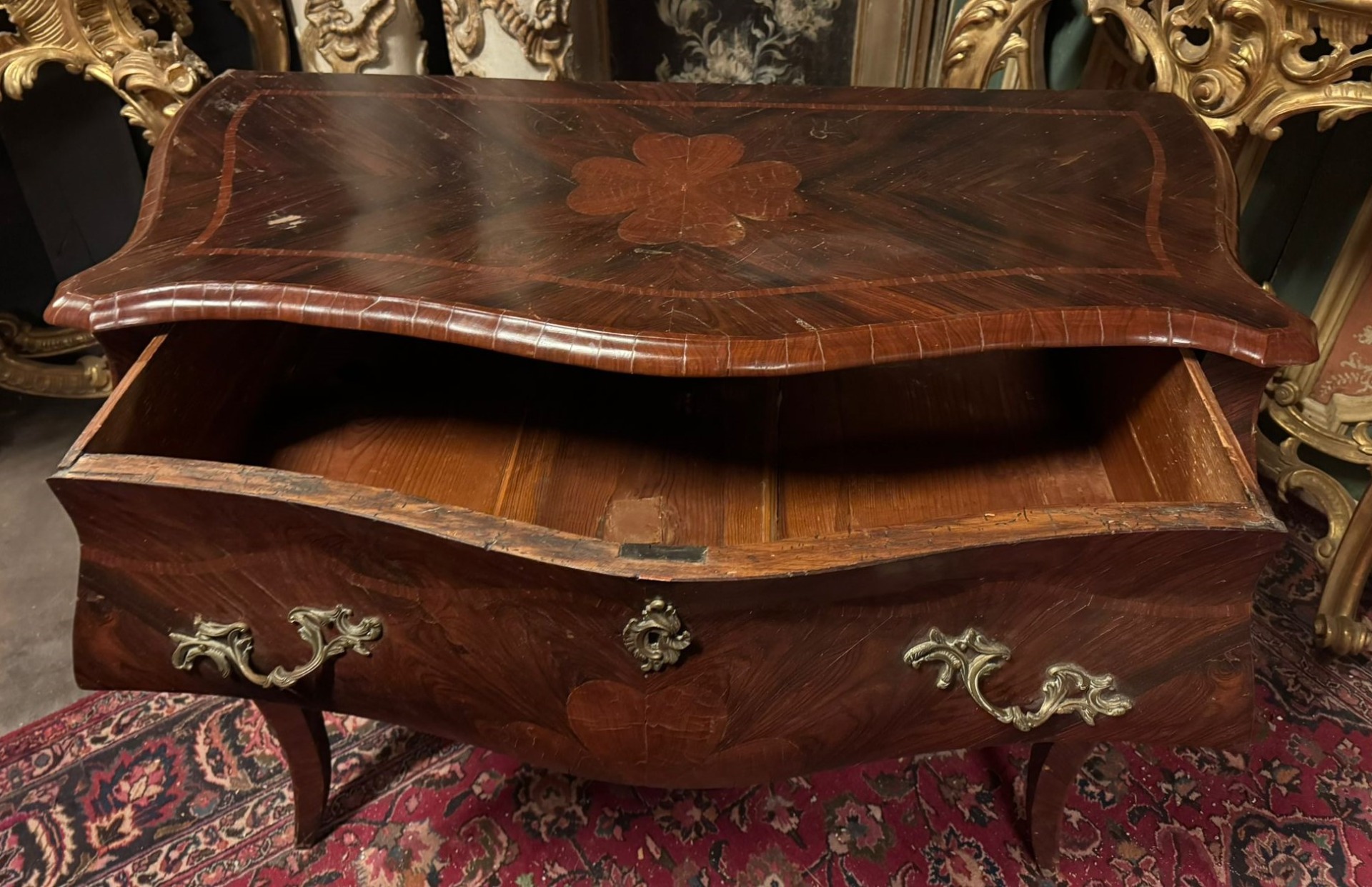 E' lastronato con quadrifogli, presenta due cassetti completi di maniglie mosse in bronzo.