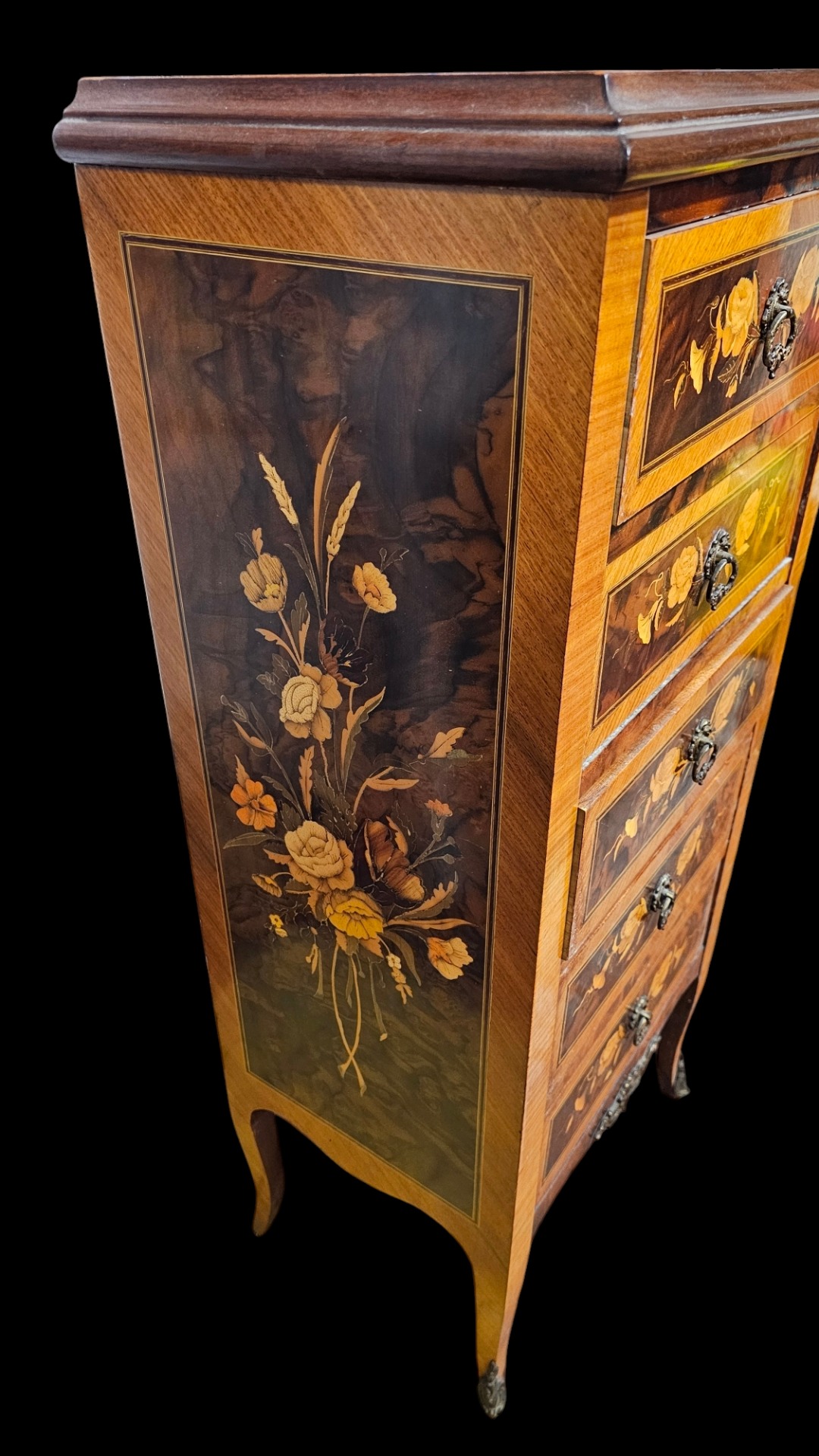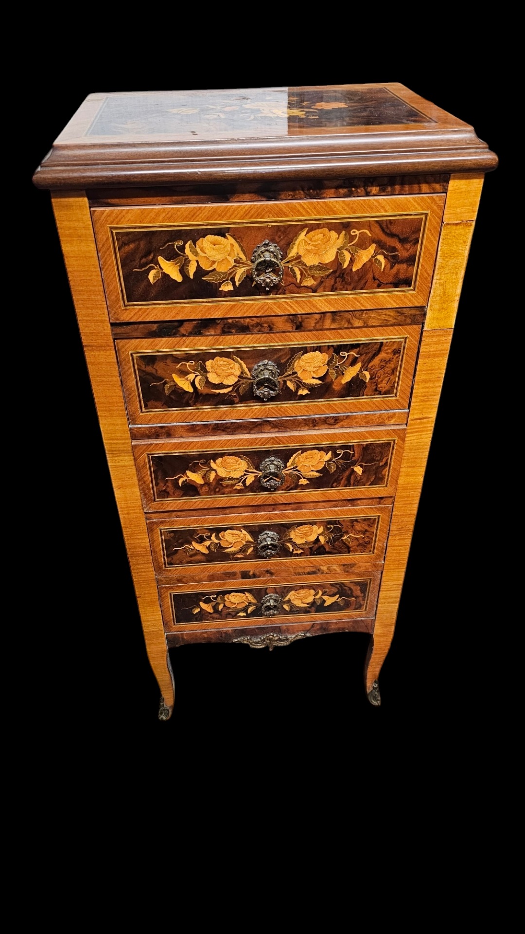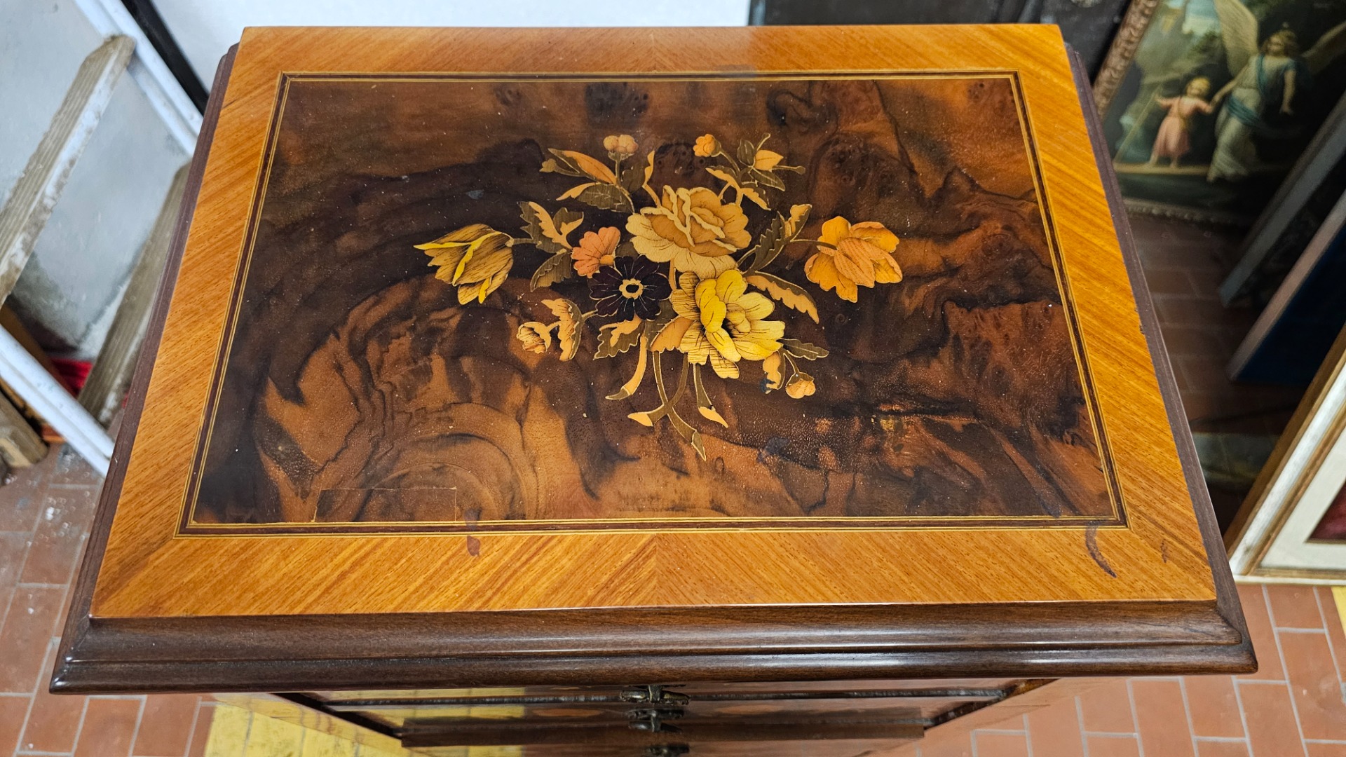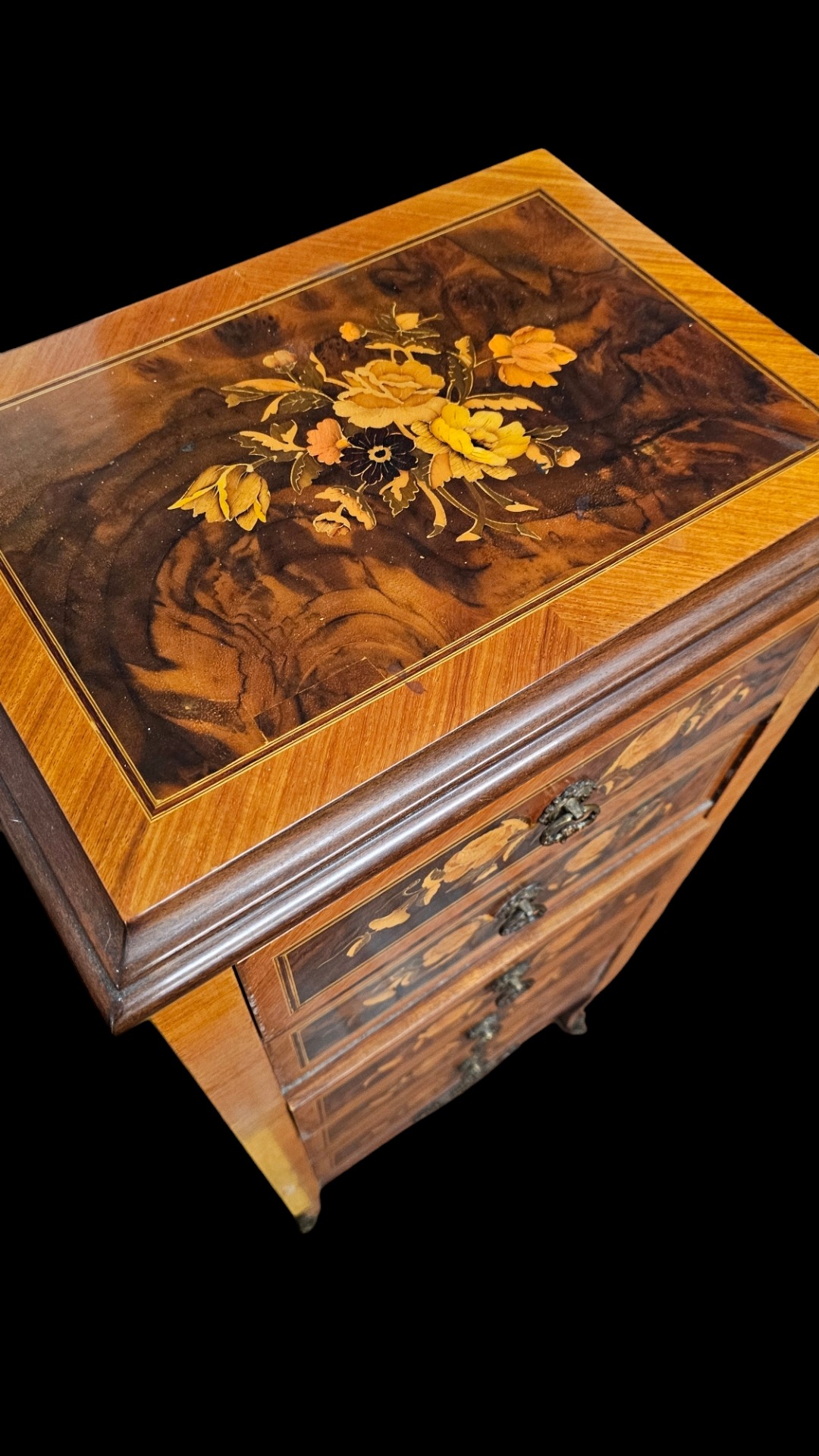 Bella caffettiera francese. In radica di noce radica di betulla e mogano. Con cassettini con maniglia in bronzo. Piedini mossi. Misura larghezza 40 profondità 30 al 3ª 1:20. Epoca anni venti