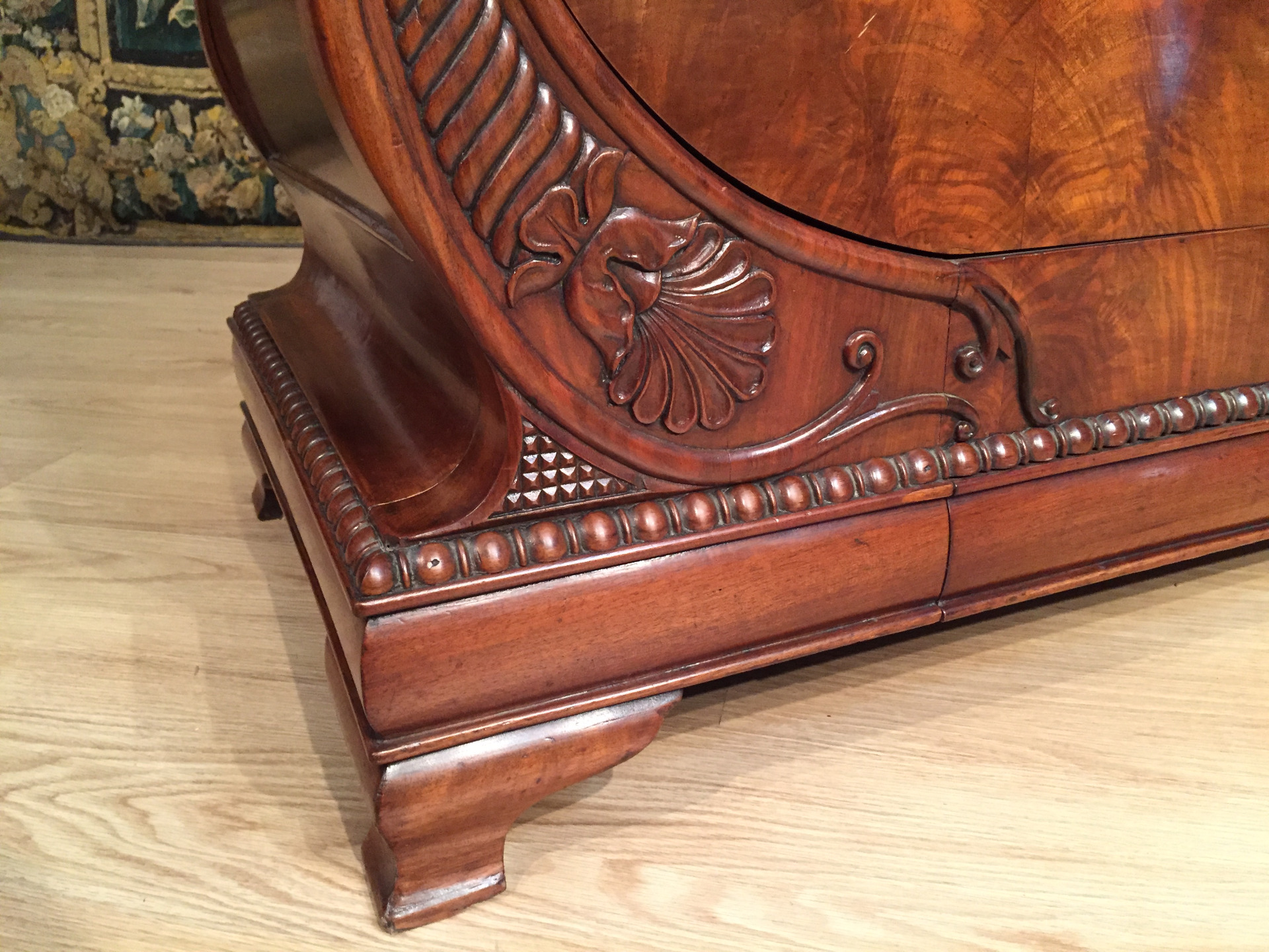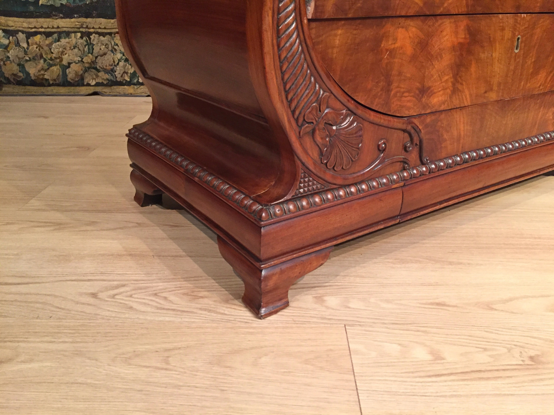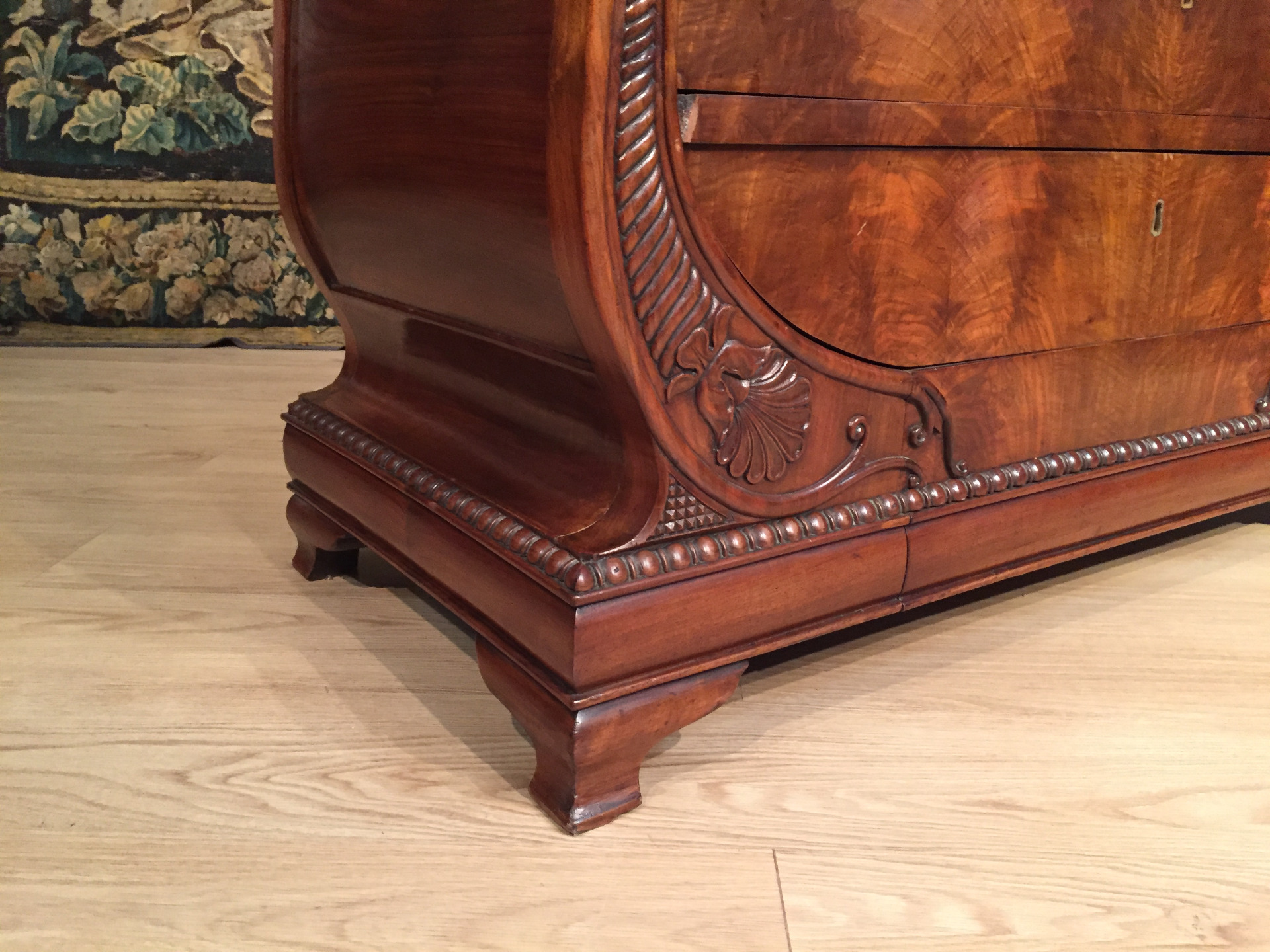 Il cassettone ha una forma molto particolare, con i fianchi mossi che ricordano la forma di una lira. La fascia sotto il piano, con cassetto al centro, è scolpita a formare delle cornici, una decorata a ovuli. Al di sotto tre grandi cassetti sono sagomati seguendo le linee curve dei fianchi e la decorazione dei montanti, scolpita a basso rilievo con elementi fitomorfi, fiori e cornucopie.