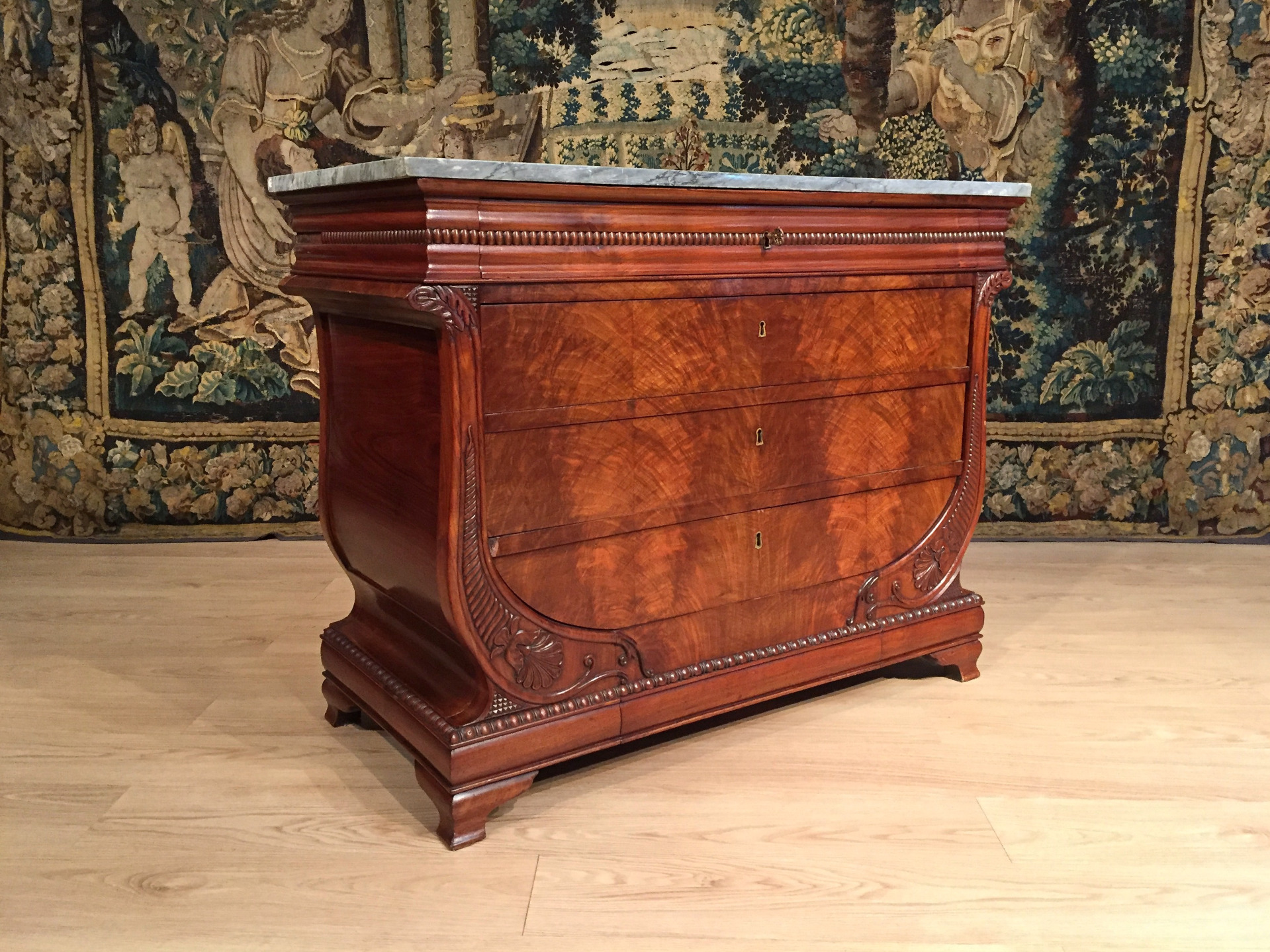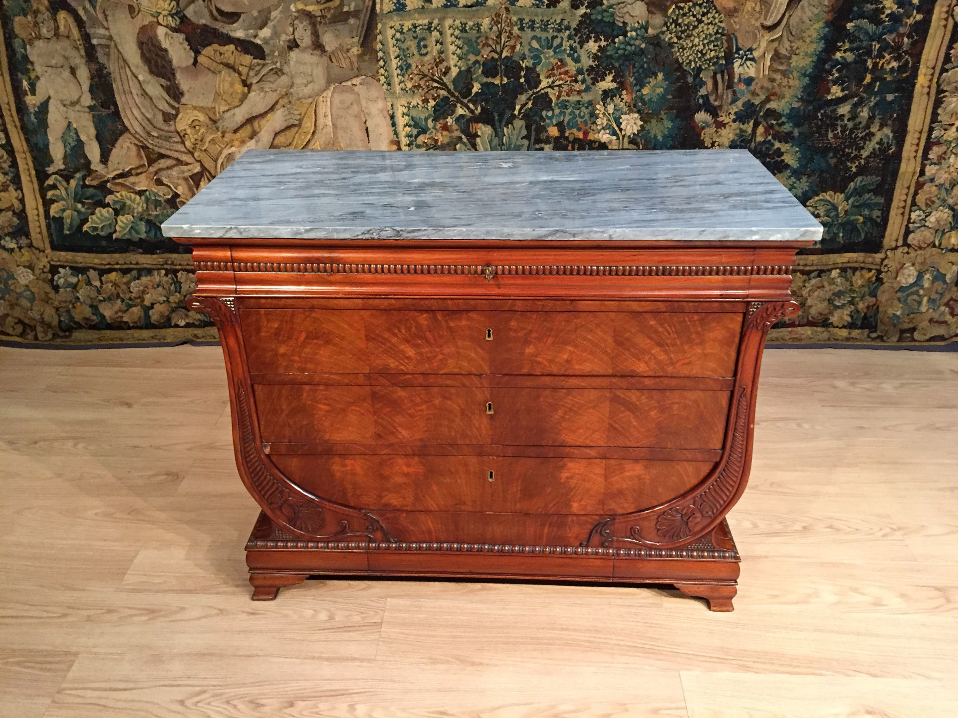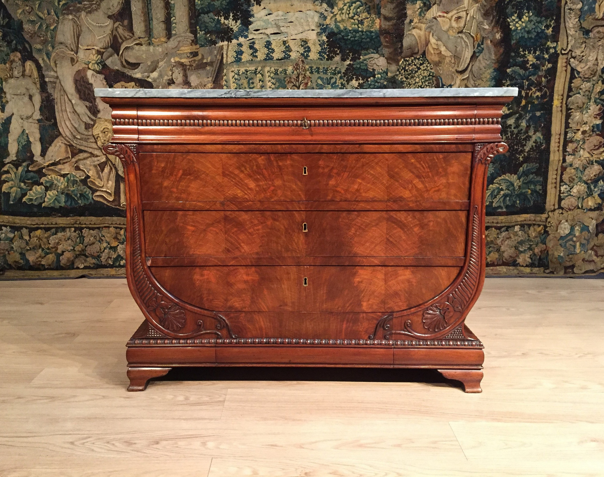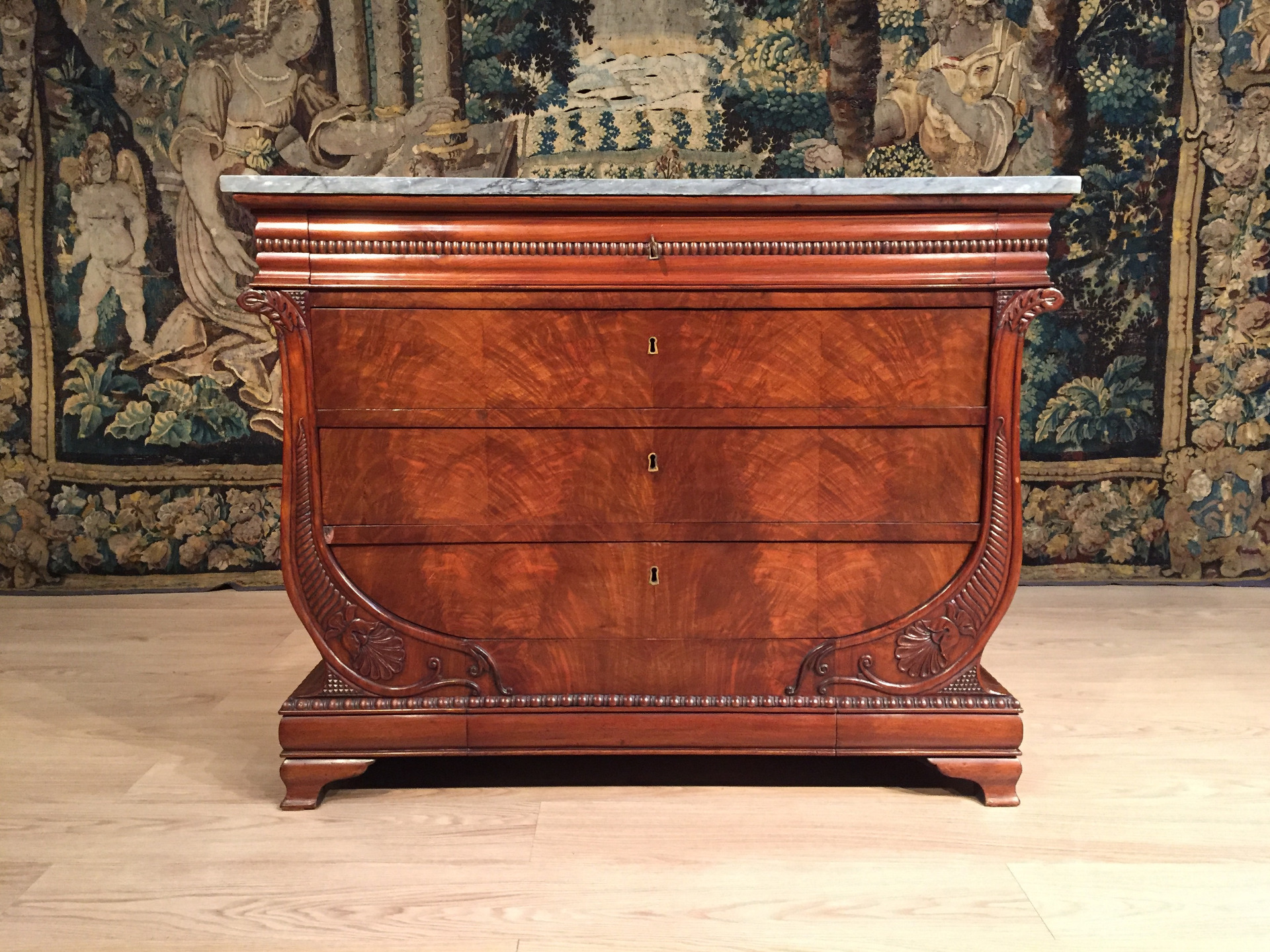 Il cassettone ha una forma molto particolare, con i fianchi mossi che ricordano la forma di una lira. La fascia sotto il piano, con cassetto al centro, è scolpita a formare delle cornici, una decorata a ovuli. Al di sotto tre grandi cassetti sono sagomati seguendo le linee curve dei fianchi e la decorazione dei montanti, scolpita a basso rilievo con elementi fitomorfi, fiori e cornucopie.