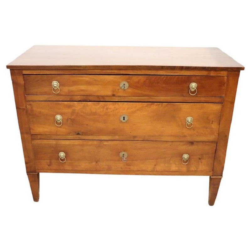 Questo cassettone italiano antico databile nella seconda metà del XVIII secolo presenta linee tipiche di epoca Luigi XVI. Realizzato in legno di noce massello è caratterizzato da linee pulite prive di eccessi ornamentali raggiungendo comunque con la sua semplicità una evidente raffinatezza. Le maniglie a testa di leone in bronzo dorato aggiungono un tocco regale, elevando il suo fascino estetico.