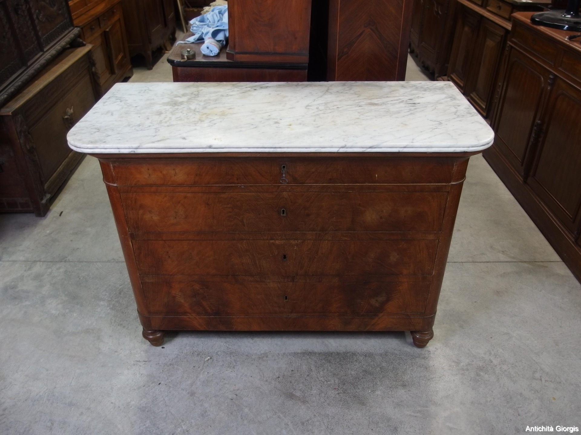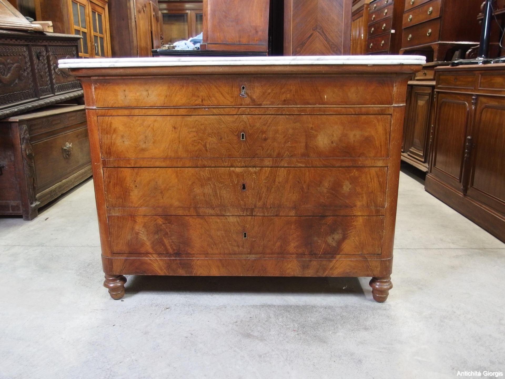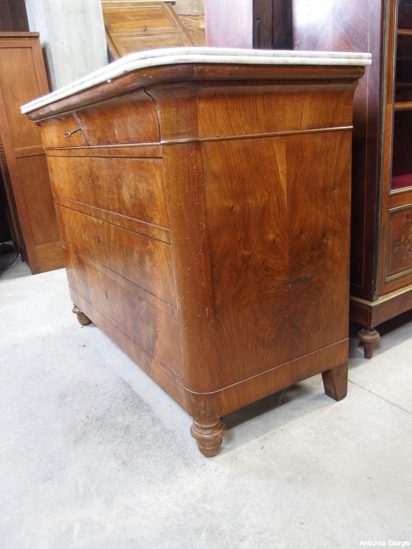 Bellissimo cassettone, con marmo bianco Carrara, in radica di noce stile Carlo X con piede a cipolla epoca primi 800 di provenienza Italia regione Piemonte.Il cassettone non necessita di molto restauro (vedi foto) è completamente originale il marmo non presenta rotture o riparazioni, completo di serrature, gli interni dei cassetti sono in noce.
