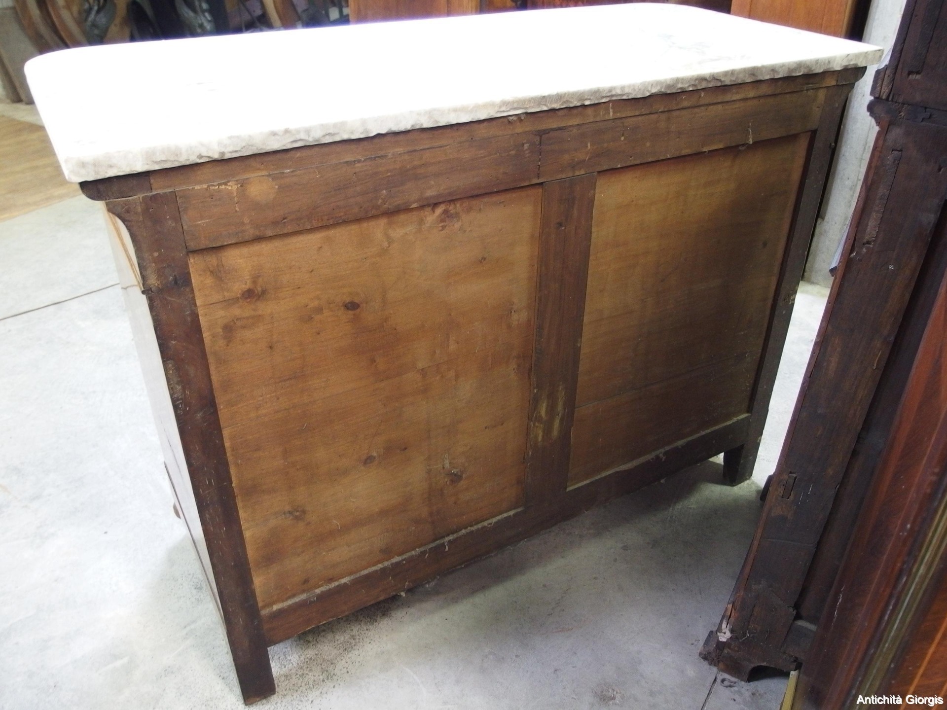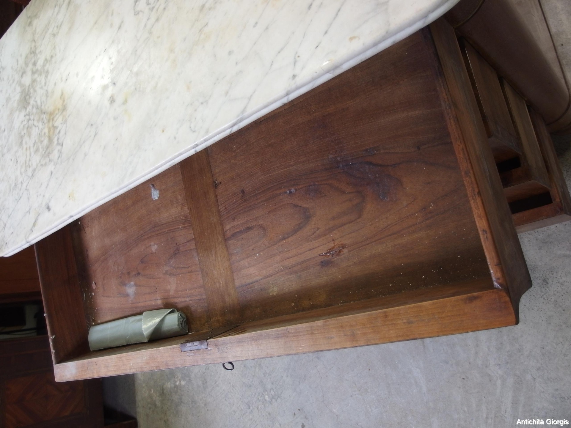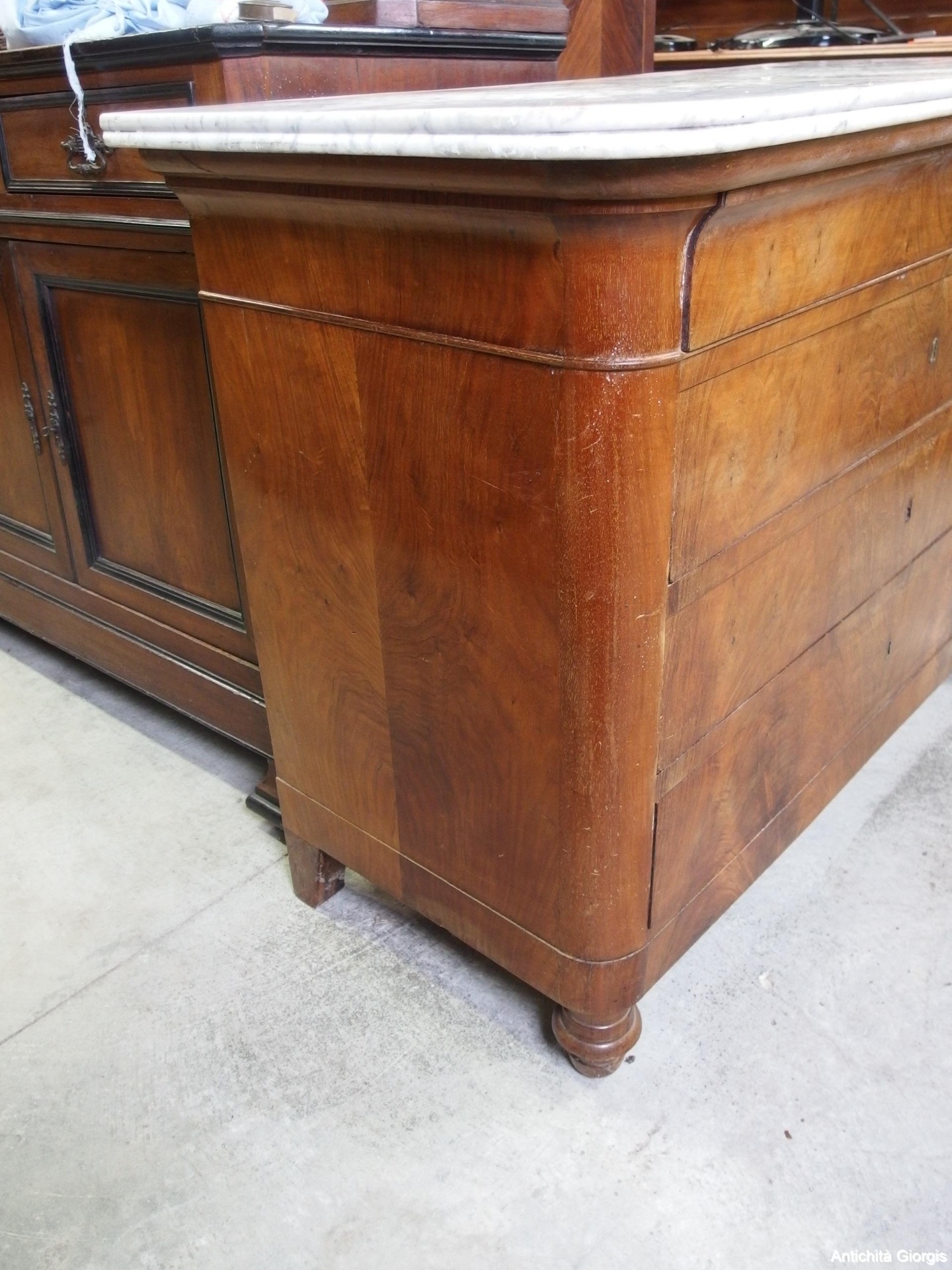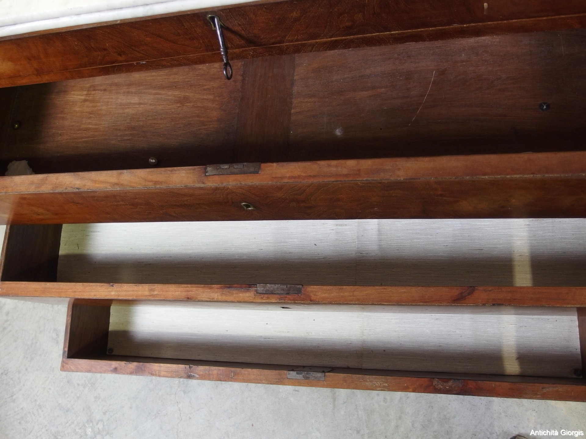Bellissimo cassettone, con marmo bianco Carrara, in radica di noce stile Carlo X con piede a cipolla epoca primi 800 di provenienza Italia regione Piemonte.Il cassettone non necessita di molto restauro (vedi foto) è completamente originale il marmo non presenta rotture o riparazioni, completo di serrature, gli interni dei cassetti sono in noce.