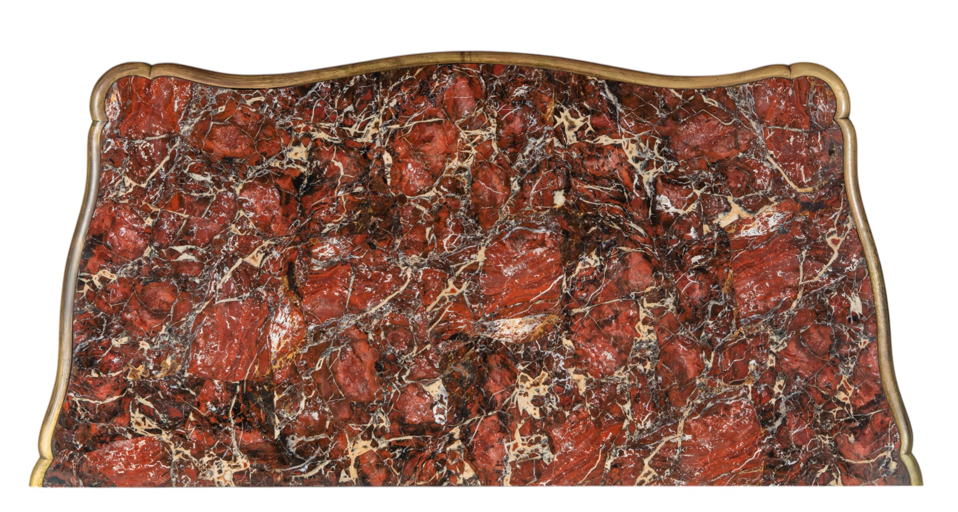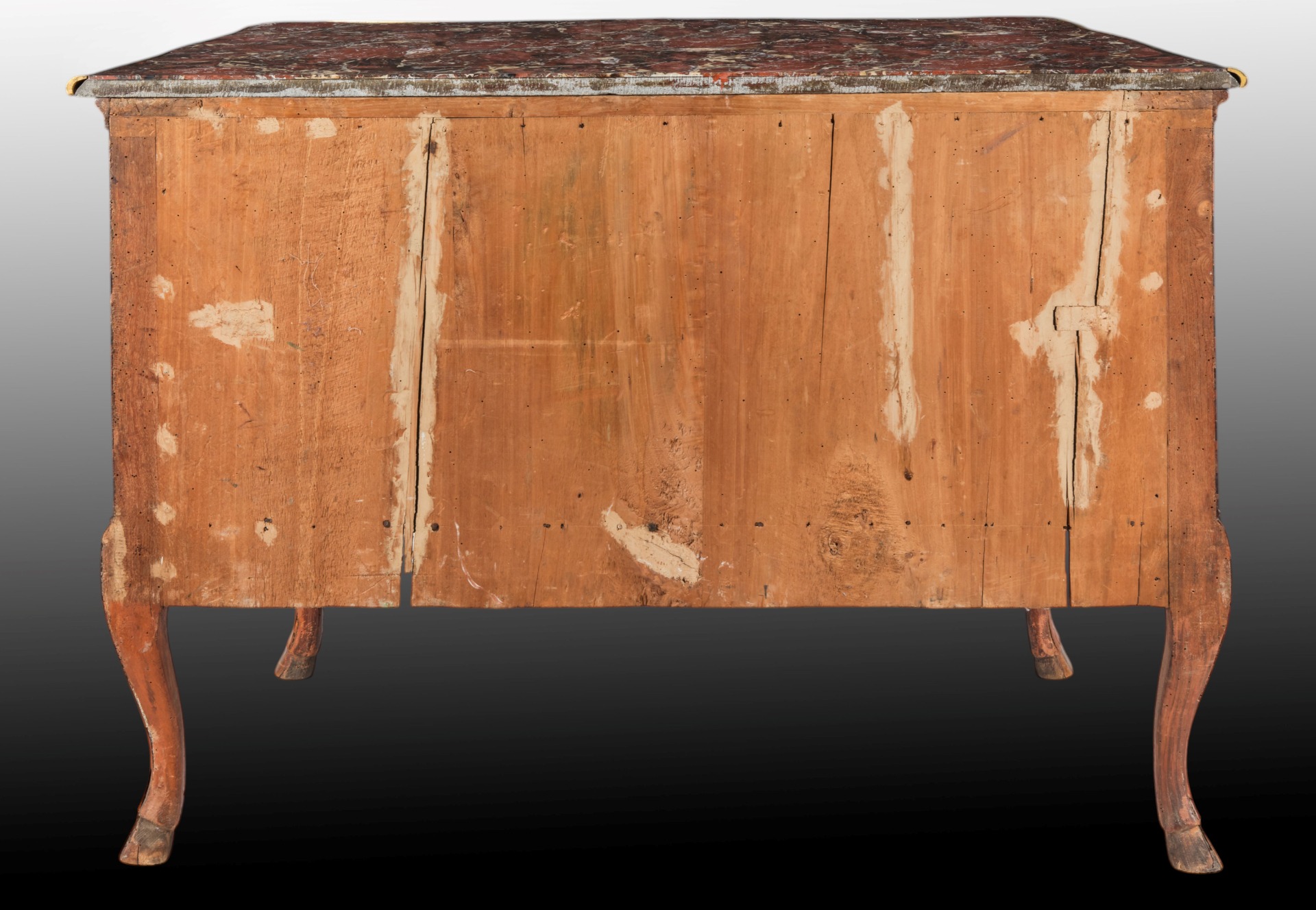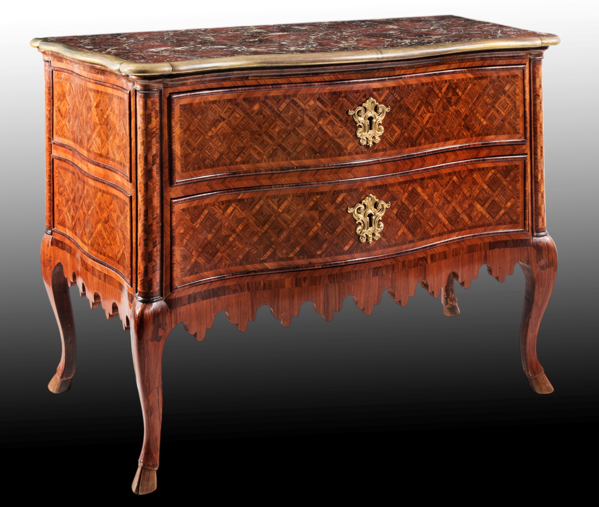 Cassettone intarsiato a marqueterie in legni diversi, Roma, terzo quarto del XVIII secolo, corpo lievemente mosso sul fronte e sui fianchi, fronte a due cassetti separati da traversa e profilati da un piccolo bordo, motivo che si ripete sui fianchi, pilastri angolari stondati e grembiale a lambrequin, gambe arcuate su piede a zoccolo, piano lastronato in marmo Levanto, cm 93,5x140x70