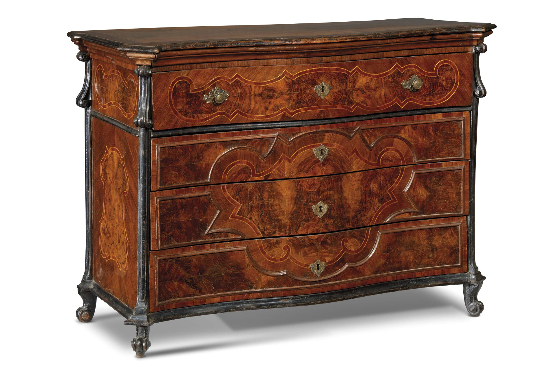 in noce e legno ebanizzato e lastronato in radica di noce e altre, cm h107x60x146