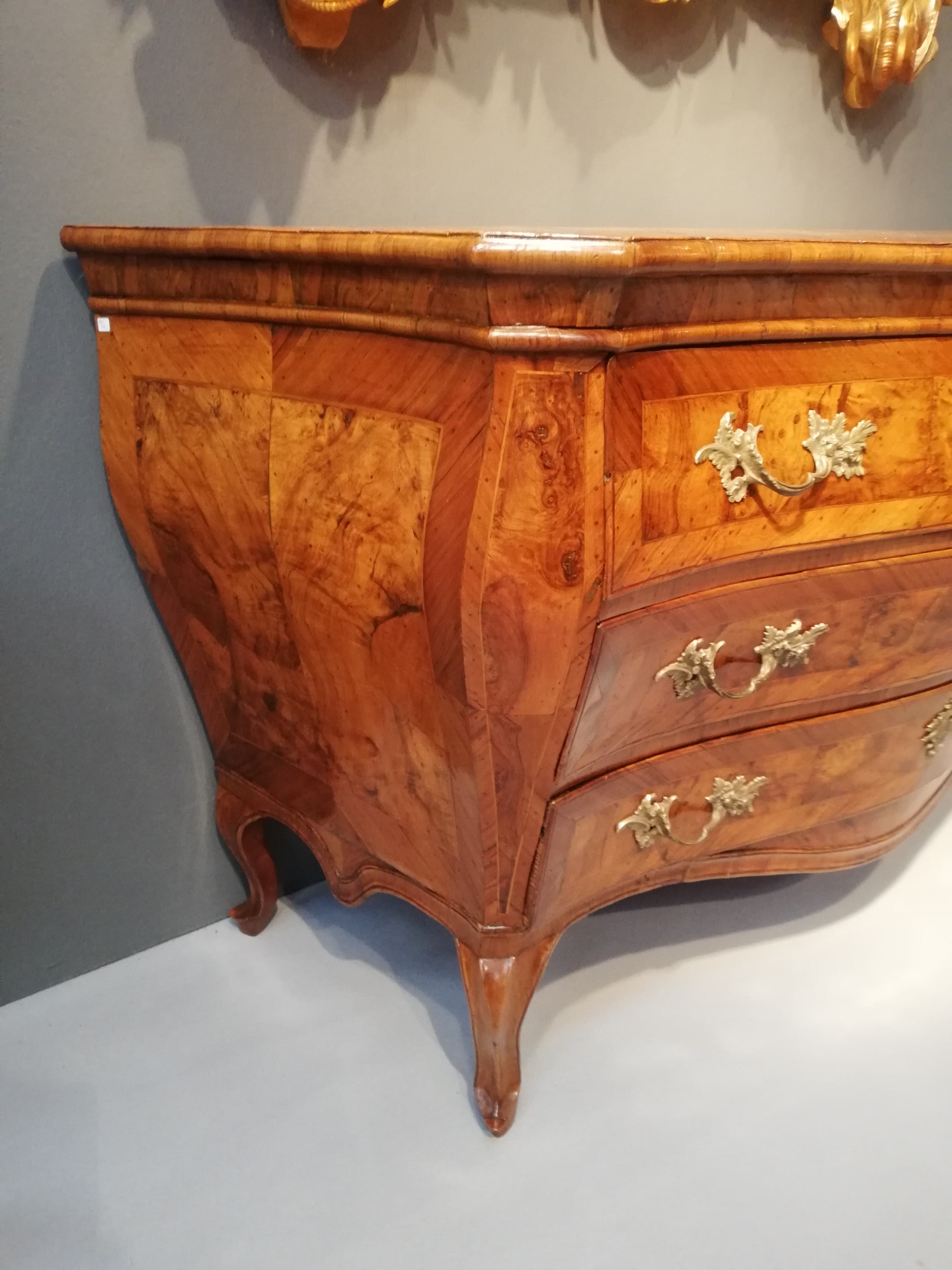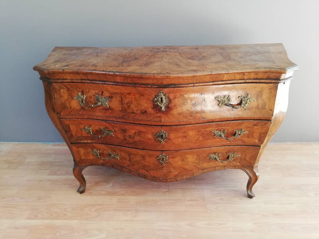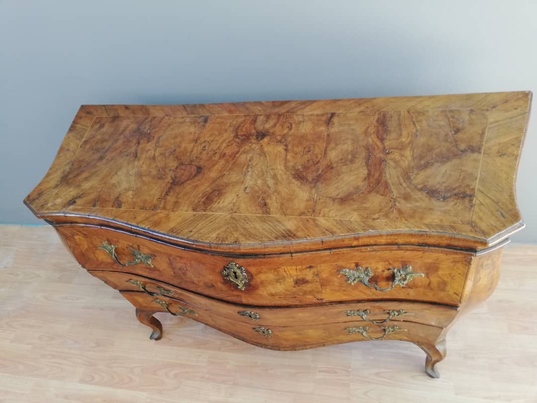 Cassettone prima metà 700 lastronato in noce, mosso fianchi e fronte.Mobile originale. Troverete nell' annuncio foto prima lucidaturaMis :