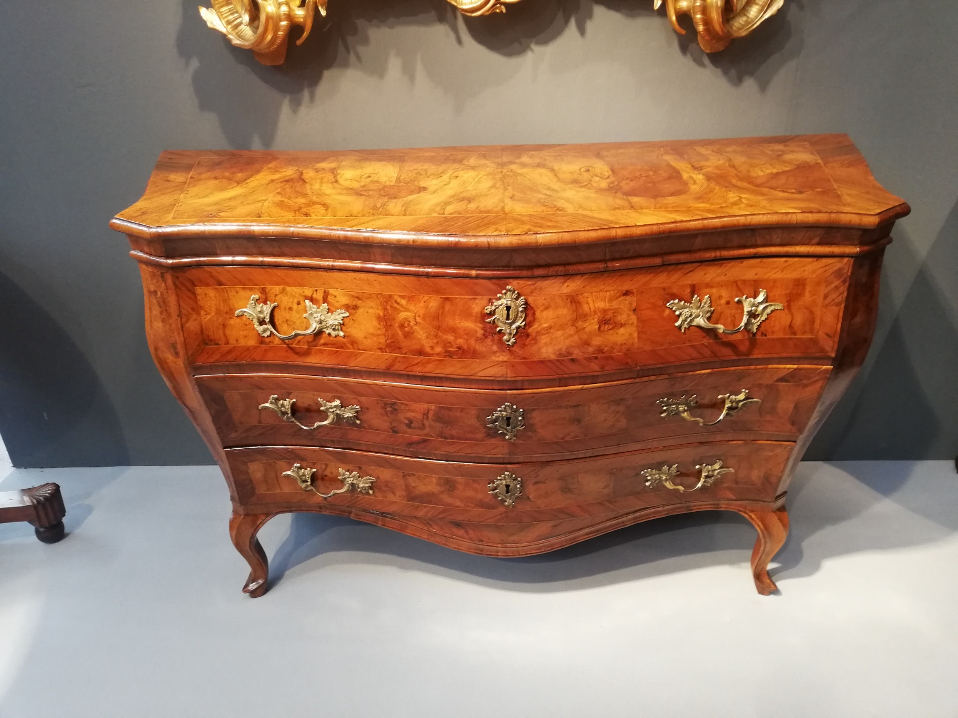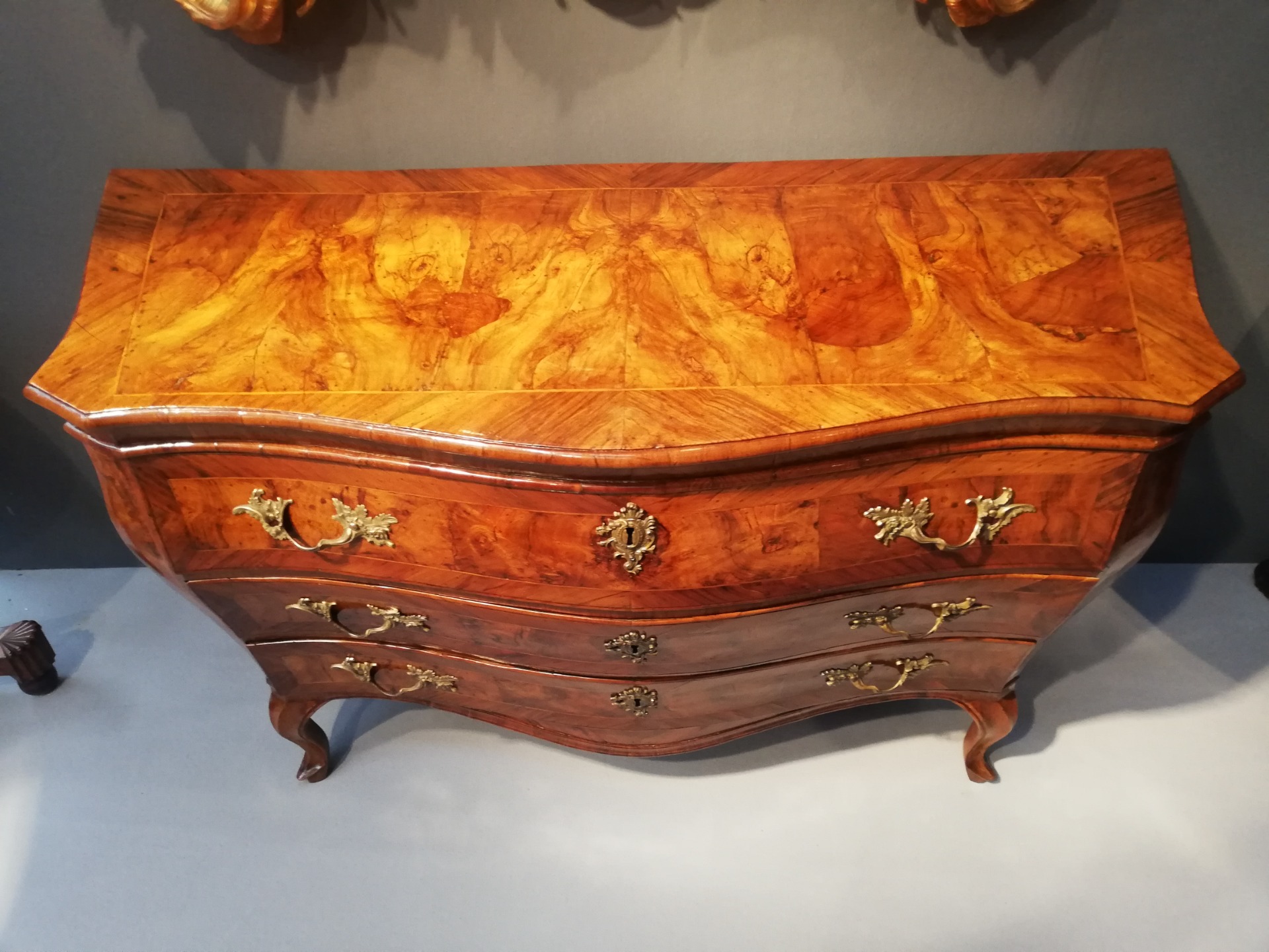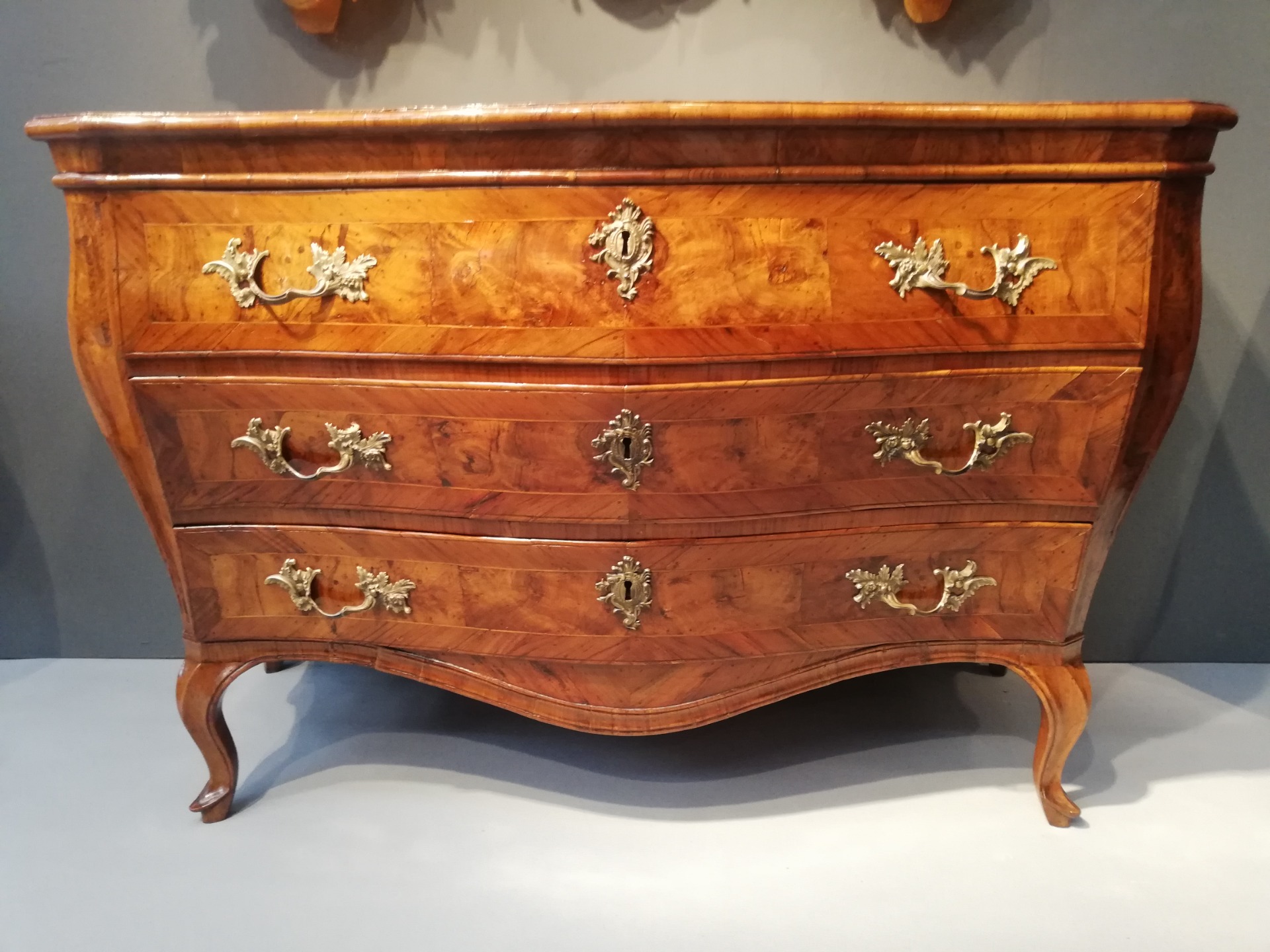 Cassettone prima metà 700 lastronato in noce, mosso fianchi e fronte.Mobile originale. Troverete nell' annuncio foto prima lucidaturaMis :
