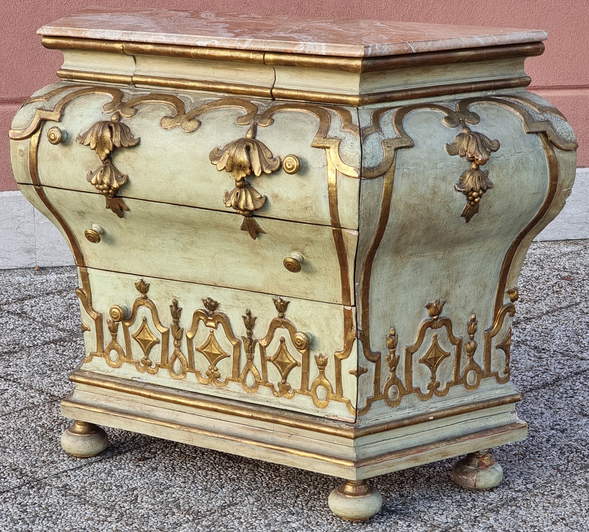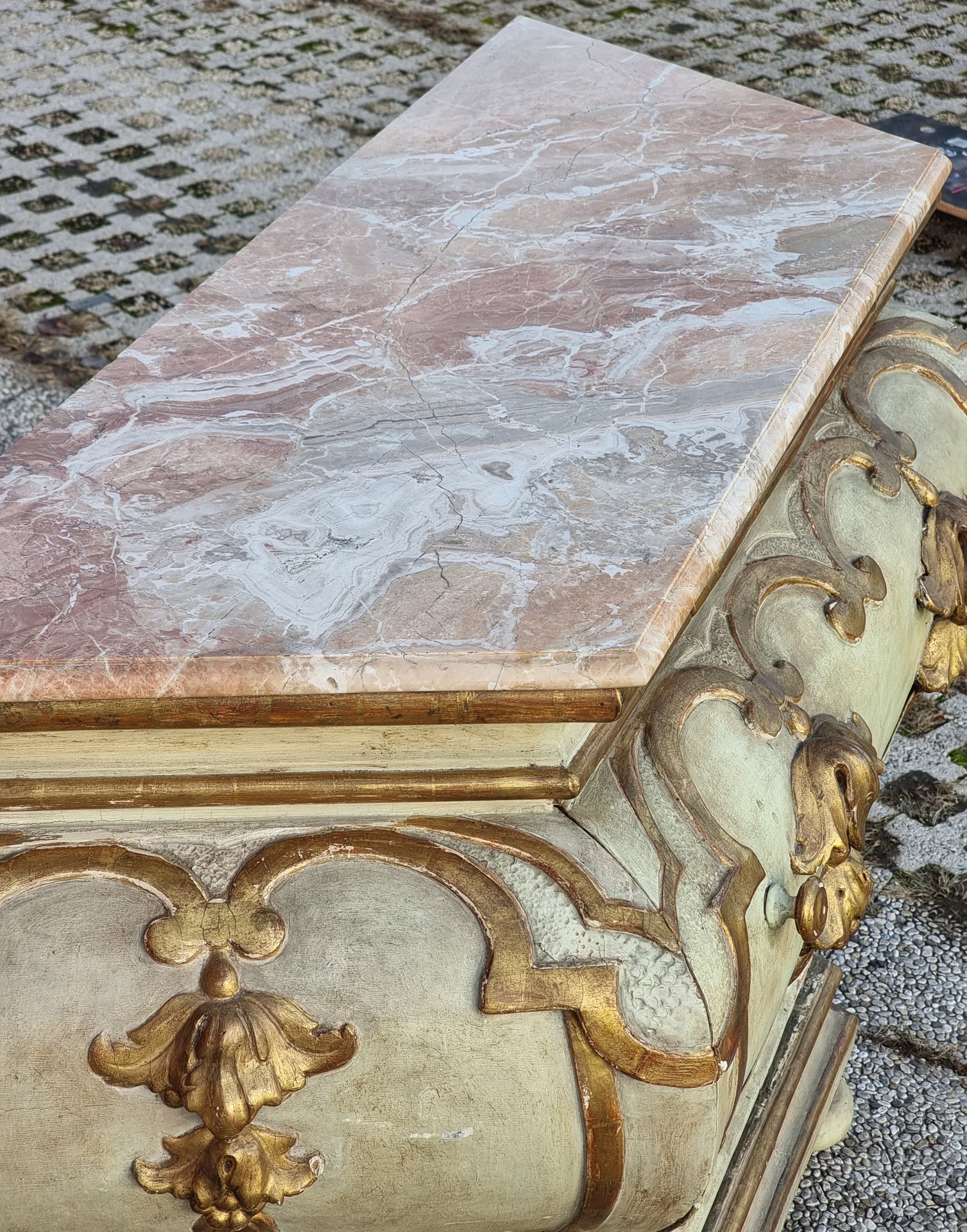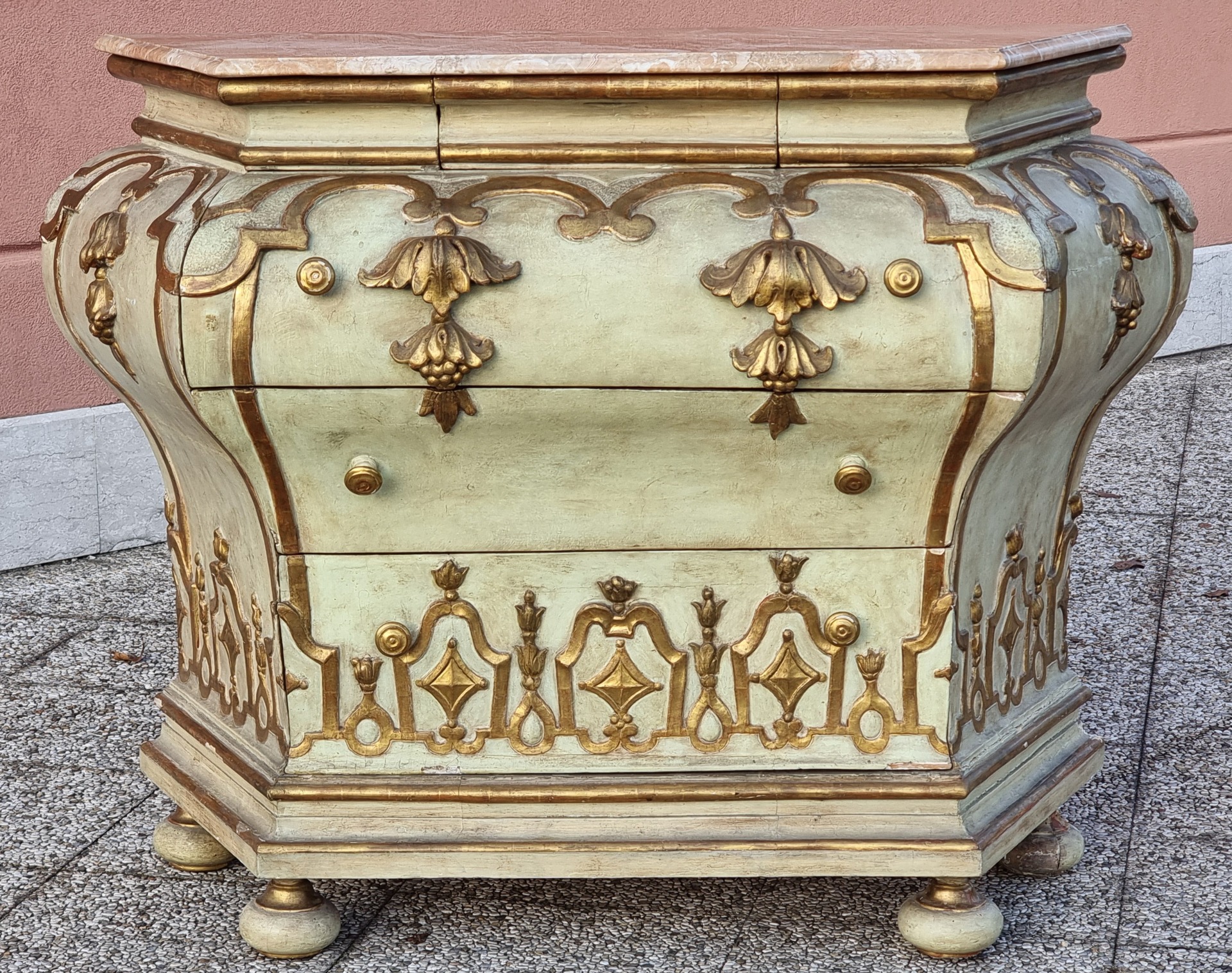 Importante commode bombée in legno di abete, riccamente sagomata, laccata e dorata, proveniente con ogni probabilità dall’area veneta e databile al XVIII secolo. Il mobile presenta un fronte mosso a tre cassetti e fianchi parimenti sagomati, con una linea fluida e ornamentale. La decorazione costituisce uno degli elementi più affascinanti del pezzo: nella parte superiore scendono grandi motivi a fiocco intagliati e dorati, mentre nella fascia inferiore corre un elaborato fregio con elementi vegetali stilizzati, anch’essi dorati. L’insieme restituisce un effetto scenografico di notevole impatto, tipico della produzione veneta più fantasiosa e teatrale del Settecento. La laccatura, nei toni chiari tendenti al verde-grigio, presenta riprese e restauri storici; la doratura conserva in larga parte la sua integrità originaria, con piccoli interventi nel tempo. Alcune modifiche antiche interessano la struttura, tra cui la probabile sostituzione delle gambe, eseguita comunque con coerenza stilistica. Il piano è in marmo breccia rosata, armonioso rispetto all’insieme, ma con buona probabilità aggiunto in epoca successiva. Nel complesso, la commode mantiene un carattere ricco, una presenza scenica importante e una struttura solida. Materiali e tecnica– Legno di abete scolpito e sagomato– Laccatura con ritocchi e rimaneggiamenti storici– Doratura in gran parte originale– Piano in marmo breccia rosata (aggiunto in epoca successiva) Epoca e provenienza– Area veneta, XVIII secolo Dimensioni– Larghezza massima: 131 cm– Altezza: 96 cm– Profondità massima: 52 cm Stato di conservazioneBuono per l’epoca: restauri diffusi alla laccatura, piccole riprese alla doratura, modifiche antiche alla struttura. Mobile solido, affascinante e pienamente leggibile. Per ulteriori informazioni, foto o dettagli tecnici, non esitate a contattarci. Spedizioni disponibili in tutto il mondo con imballaggio professionale.