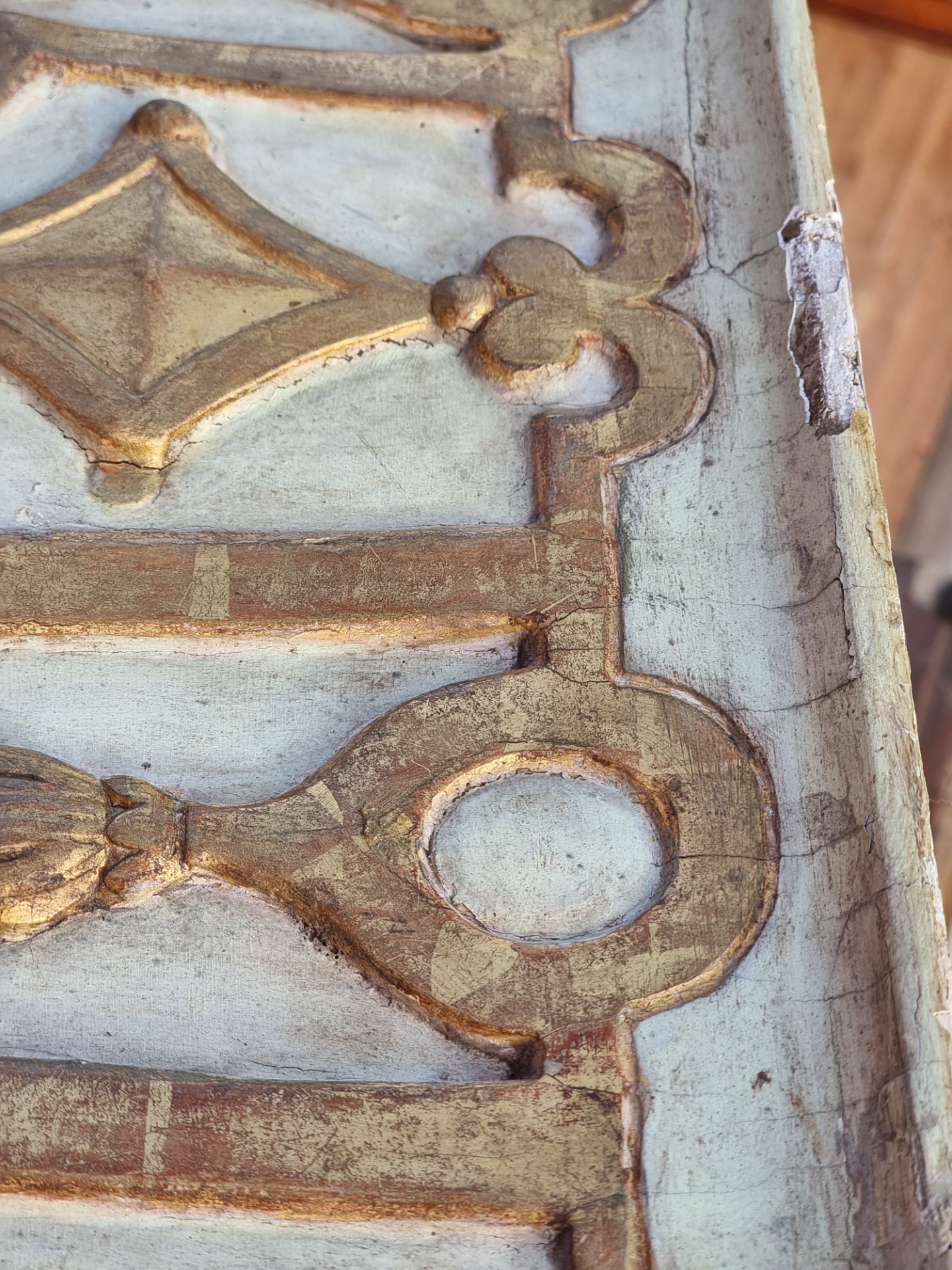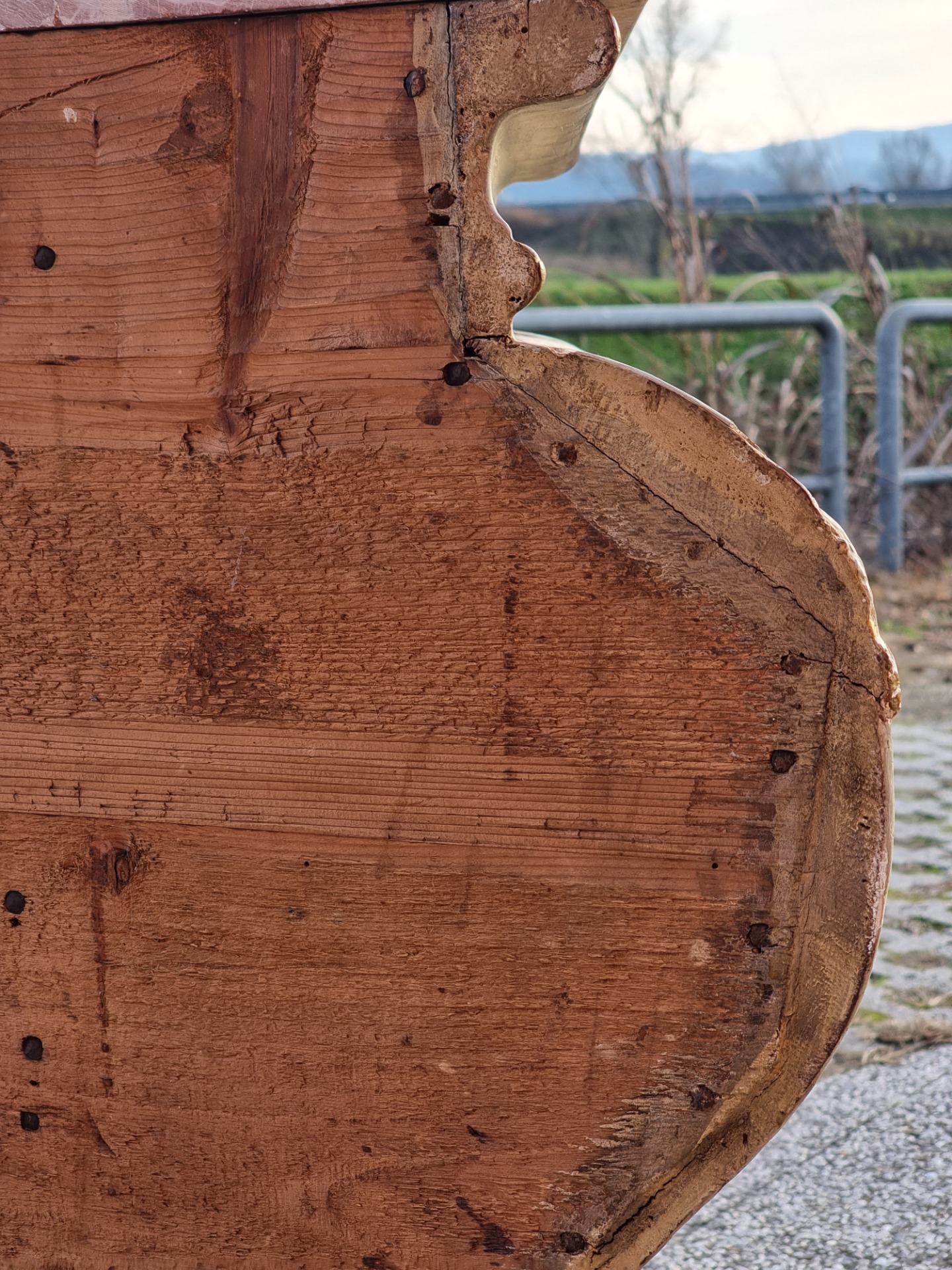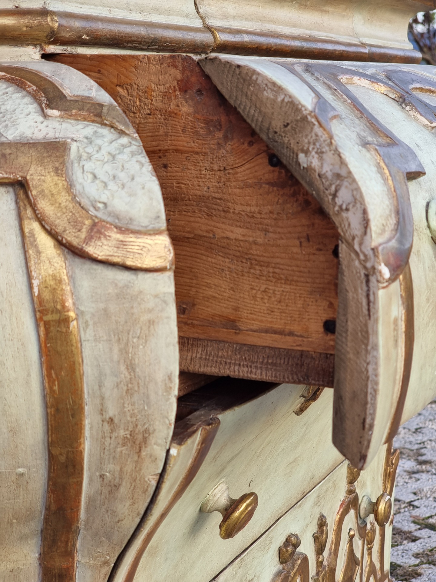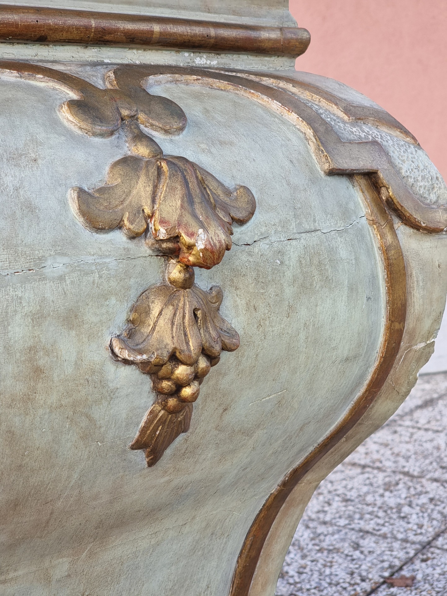 Importante commode bombée in legno di abete, riccamente sagomata, laccata e dorata, proveniente con ogni probabilità dall’area veneta e databile al XVIII secolo. Il mobile presenta un fronte mosso a tre cassetti e fianchi parimenti sagomati, con una linea fluida e ornamentale. La decorazione costituisce uno degli elementi più affascinanti del pezzo: nella parte superiore scendono grandi motivi a fiocco intagliati e dorati, mentre nella fascia inferiore corre un elaborato fregio con elementi vegetali stilizzati, anch’essi dorati. L’insieme restituisce un effetto scenografico di notevole impatto, tipico della produzione veneta più fantasiosa e teatrale del Settecento. La laccatura, nei toni chiari tendenti al verde-grigio, presenta riprese e restauri storici; la doratura conserva in larga parte la sua integrità originaria, con piccoli interventi nel tempo. Alcune modifiche antiche interessano la struttura, tra cui la probabile sostituzione delle gambe, eseguita comunque con coerenza stilistica. Il piano è in marmo breccia rosata, armonioso rispetto all’insieme, ma con buona probabilità aggiunto in epoca successiva. Nel complesso, la commode mantiene un carattere ricco, una presenza scenica importante e una struttura solida. Materiali e tecnica– Legno di abete scolpito e sagomato– Laccatura con ritocchi e rimaneggiamenti storici– Doratura in gran parte originale– Piano in marmo breccia rosata (aggiunto in epoca successiva) Epoca e provenienza– Area veneta, XVIII secolo Dimensioni– Larghezza massima: 131 cm– Altezza: 96 cm– Profondità massima: 52 cm Stato di conservazioneBuono per l’epoca: restauri diffusi alla laccatura, piccole riprese alla doratura, modifiche antiche alla struttura. Mobile solido, affascinante e pienamente leggibile. Per ulteriori informazioni, foto o dettagli tecnici, non esitate a contattarci. Spedizioni disponibili in tutto il mondo con imballaggio professionale.