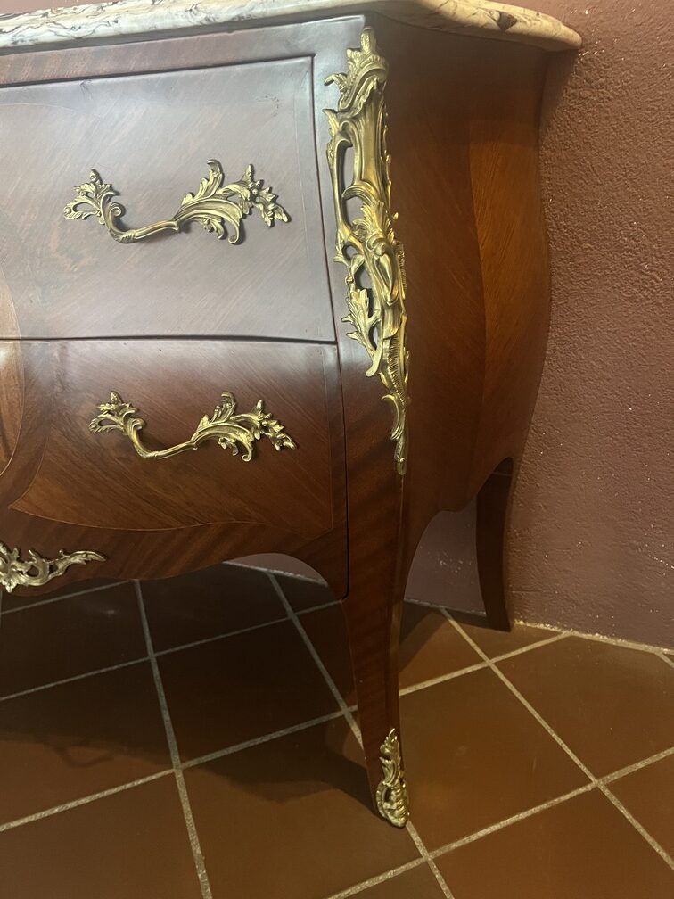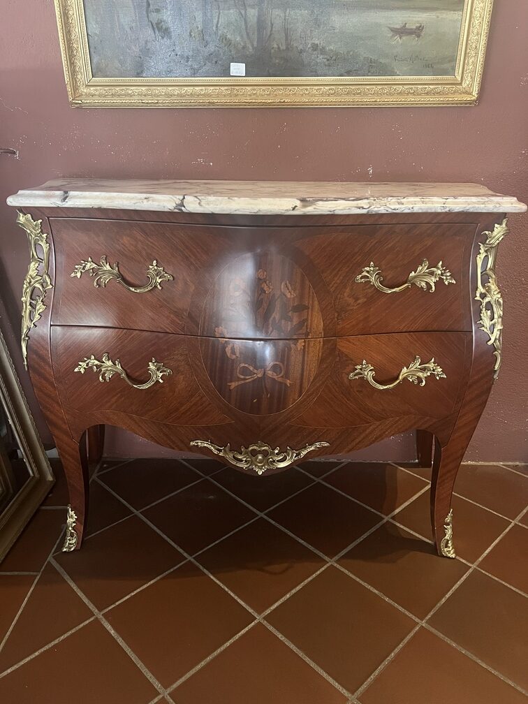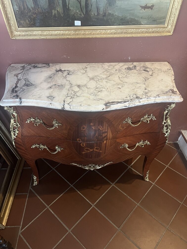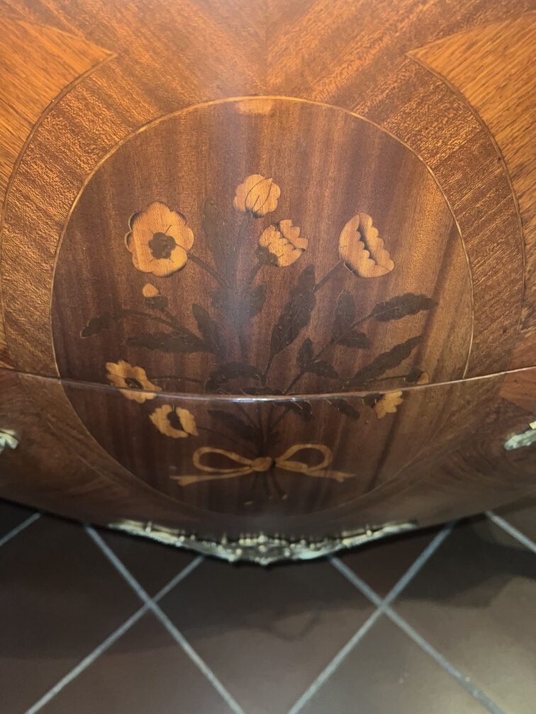 Comò bombato stile Luigi XV in legno di palissandro e bois de rose con intarsio floreale centrale.