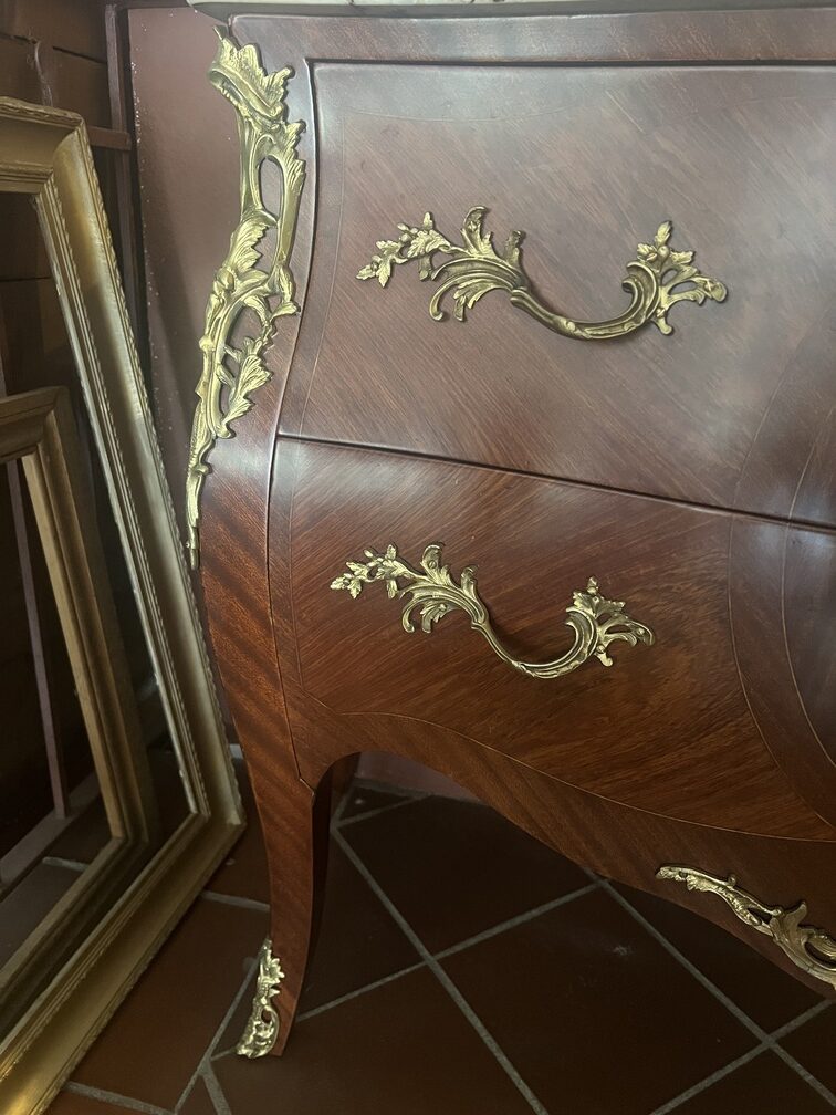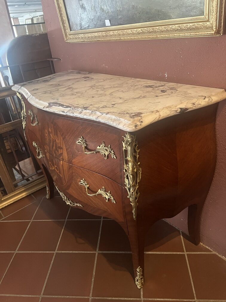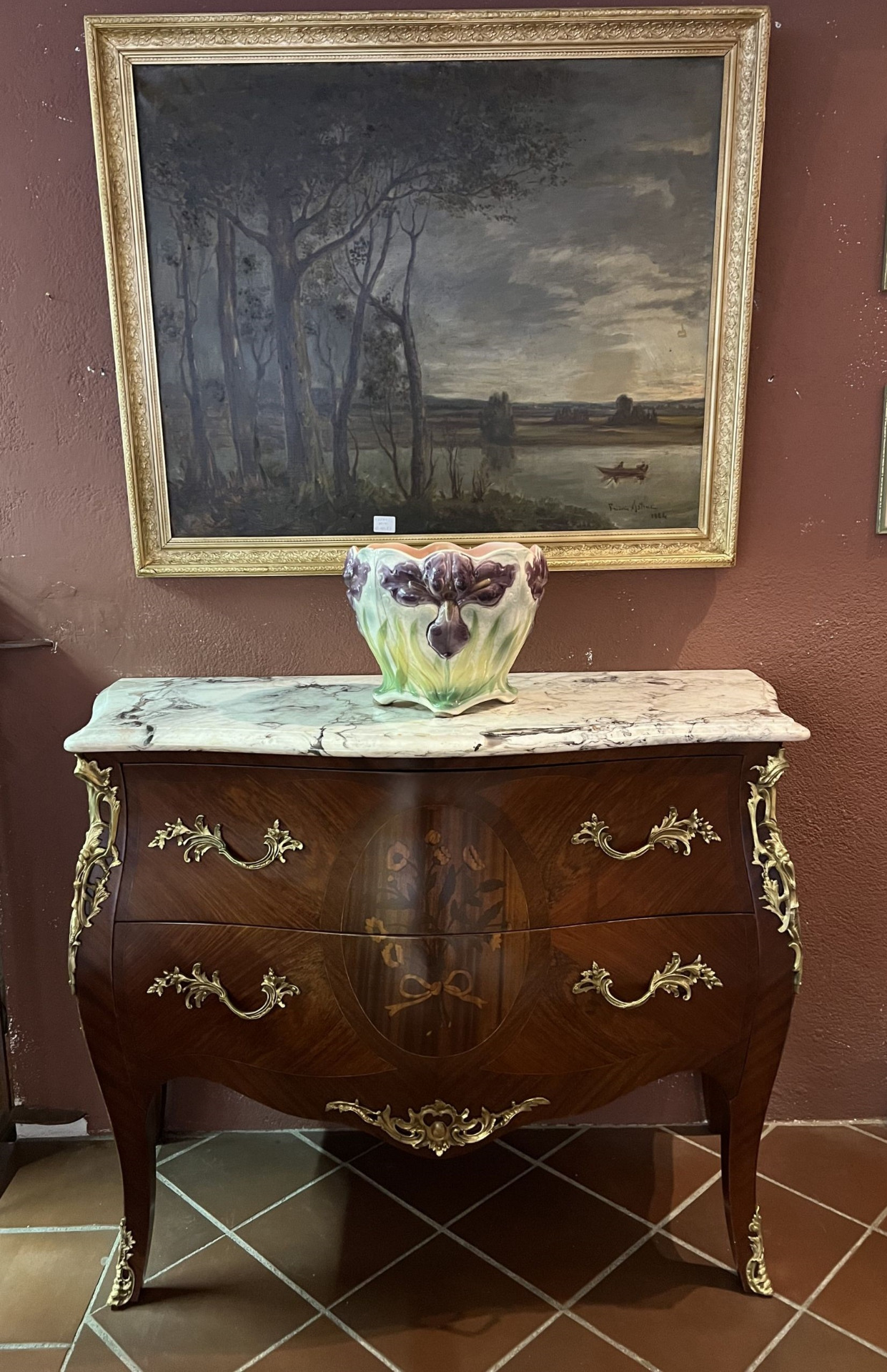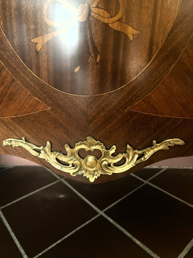 Comò bombato stile Luigi XV in legno di palissandro e bois de rose con intarsio floreale centrale.