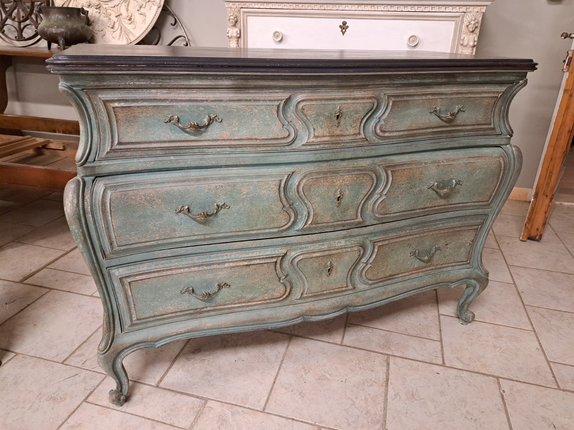 Delizioso comò a tre cassetti, mosso sul fronte e sui fianchi, in perfetto stile Luigi XV.Il comò, in perfette condizioni, è dipinto nei toni del verde salvia e del nero con una patina veramente gradevole.