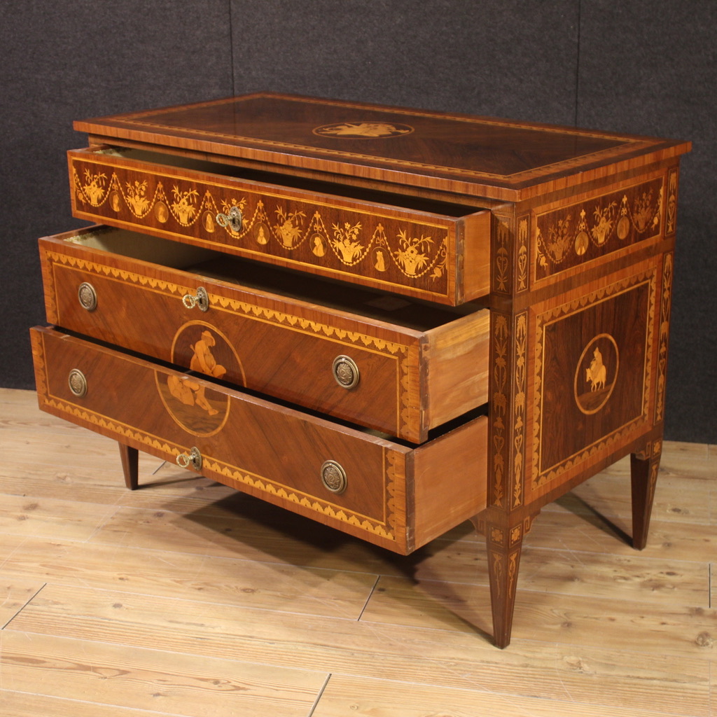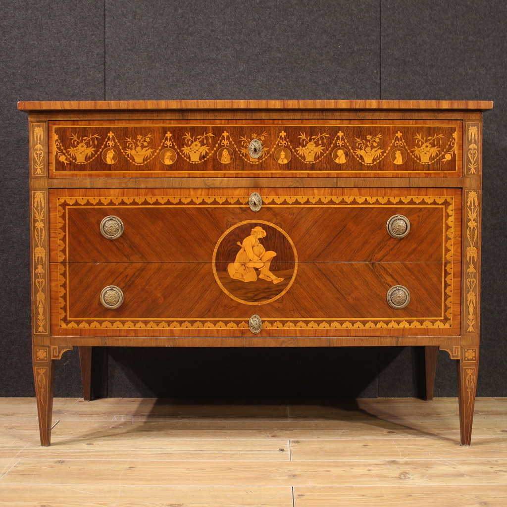 Elegante comò italiano della metà del XX secolo. Mobile in stile Luigi XVI riccamente intarsiato in legni di noce, bois de rose, acero, palissandro e legni da frutto. Cassettone di grande qualità e di bella misura, ideale da inserire in un salone o camera da letto. Mobile sostenuto da quattro solide gambe a tronco di piramide rovesciata, anch'esse intarsiate. Piano superiore arricchito da intarsio centrale con strumenti musicali e carte da gioco. Fianchi, decoro dei due cassetti inferiori e fascia del primo cassetto adornato da figure popolari, decori floreali e festoni (vedi foto). Comò completo di tre chiavi funzionanti, di buona capacità e servizio. In buone condizioni.