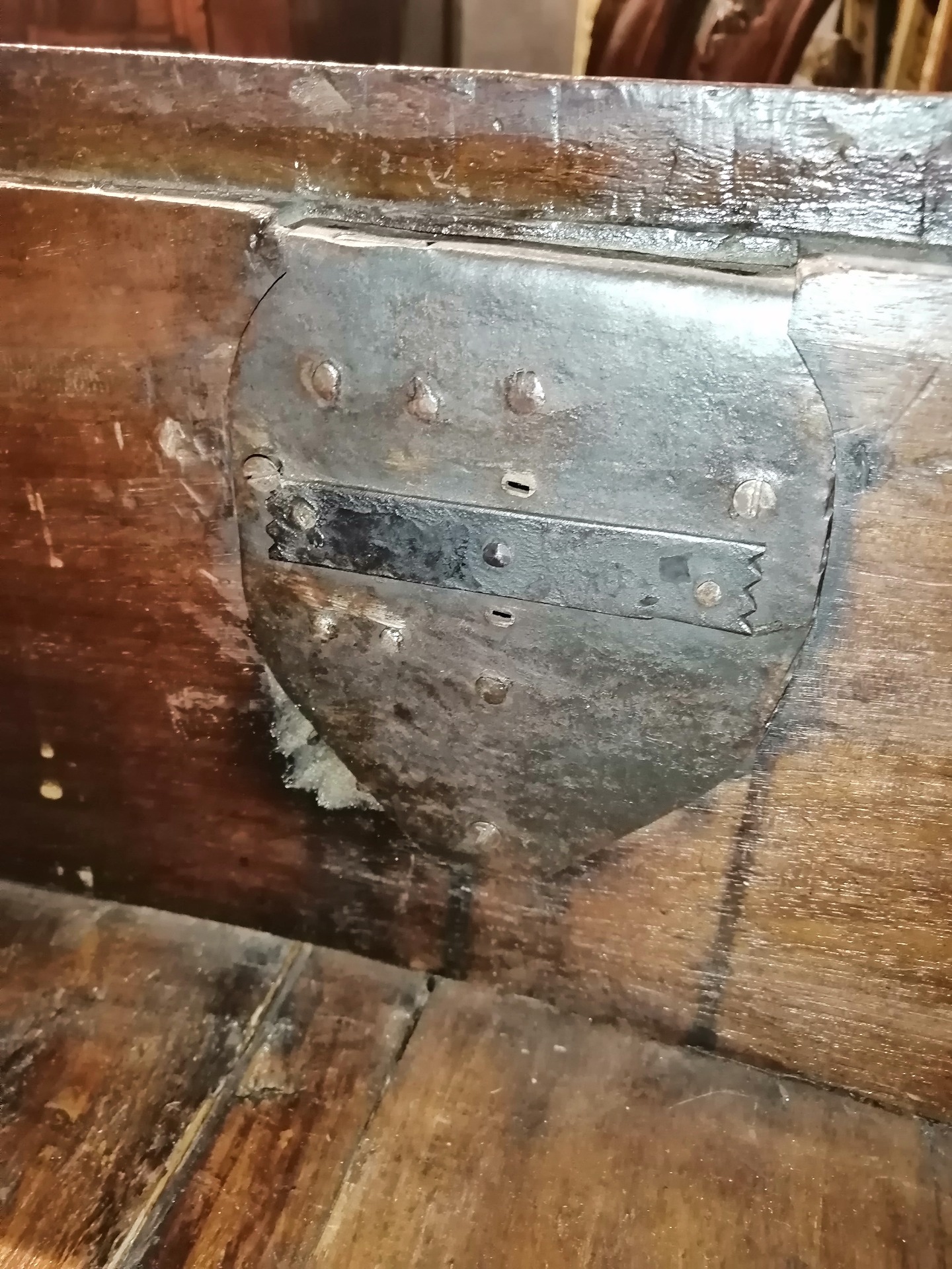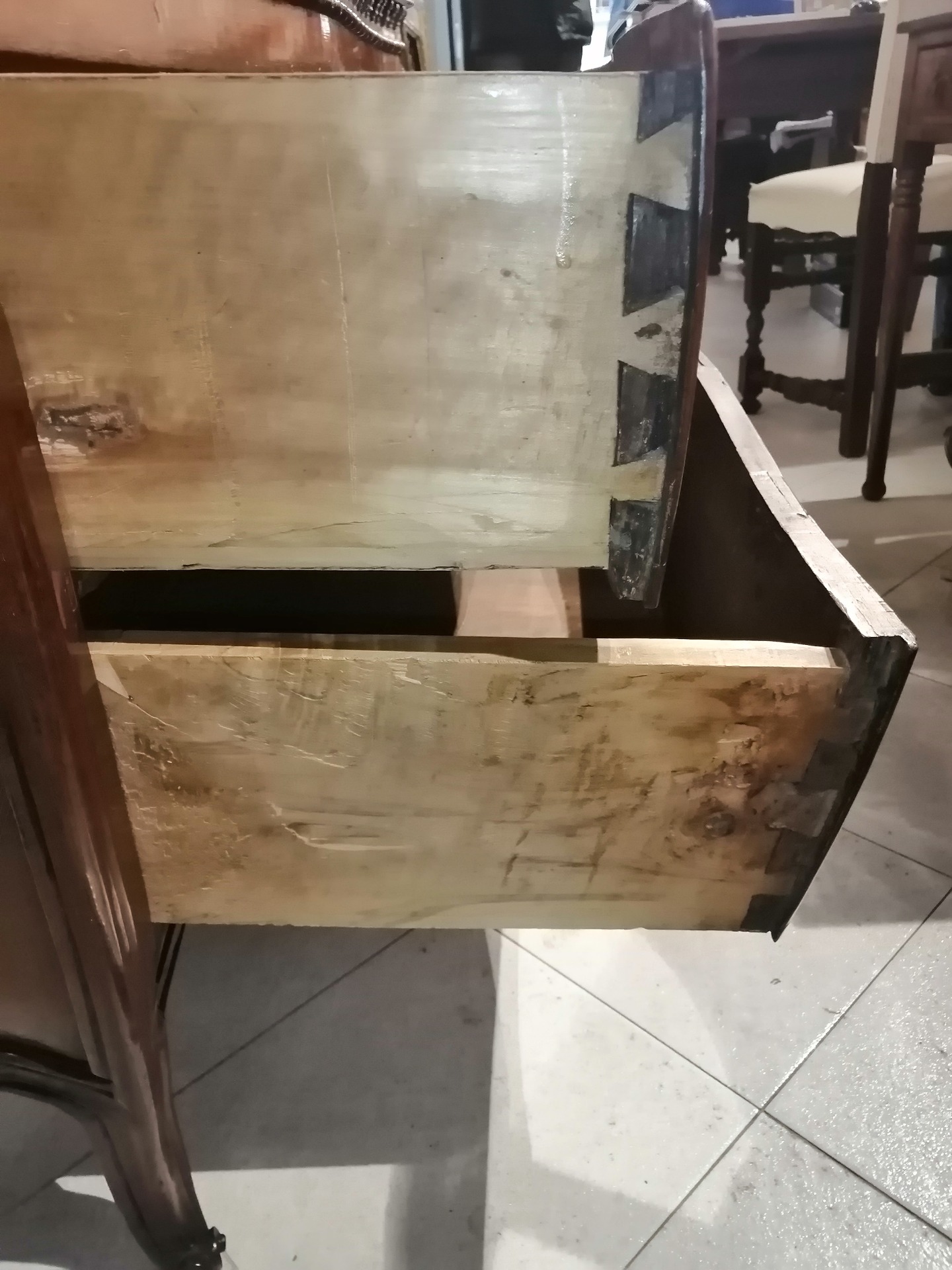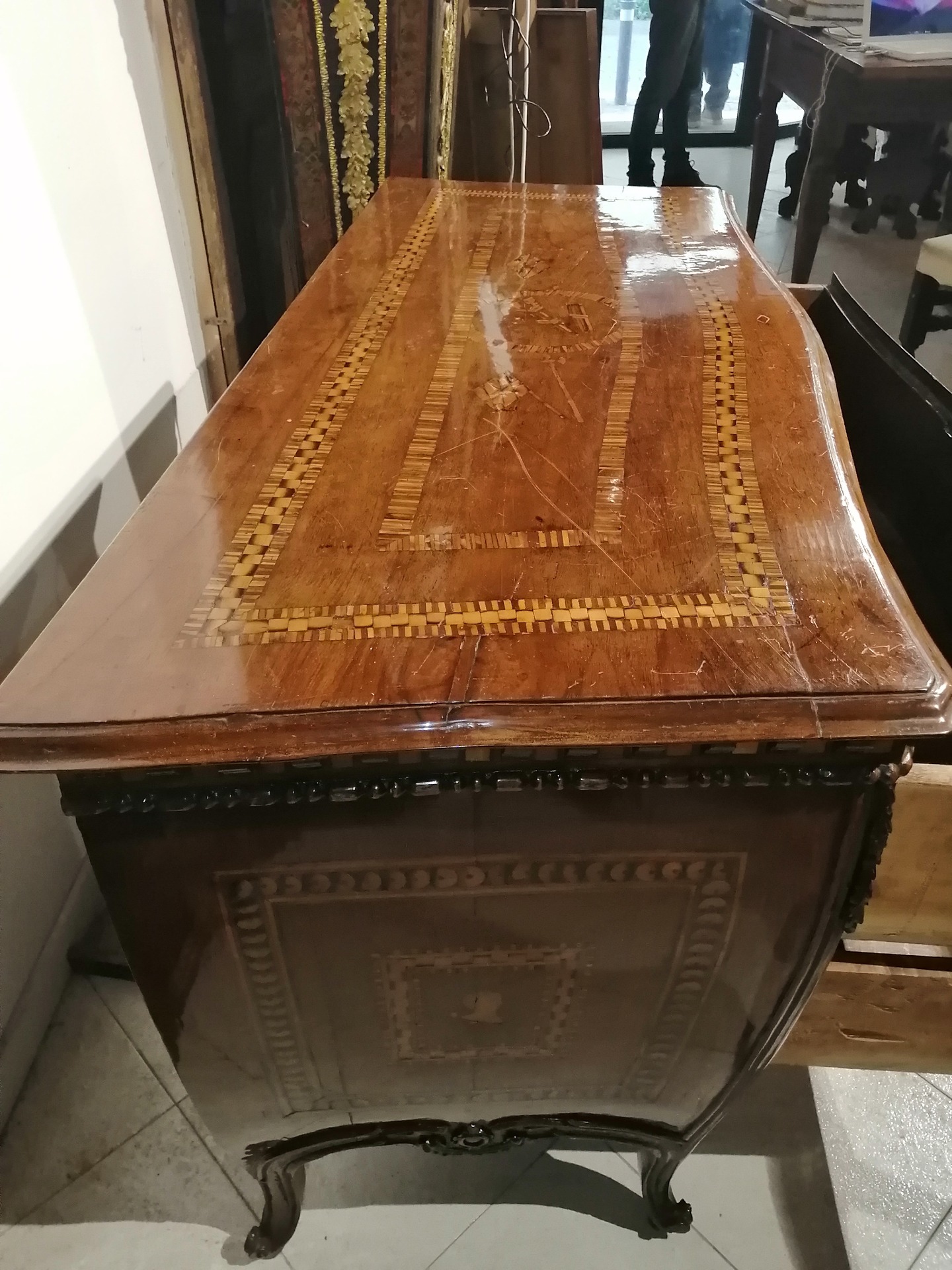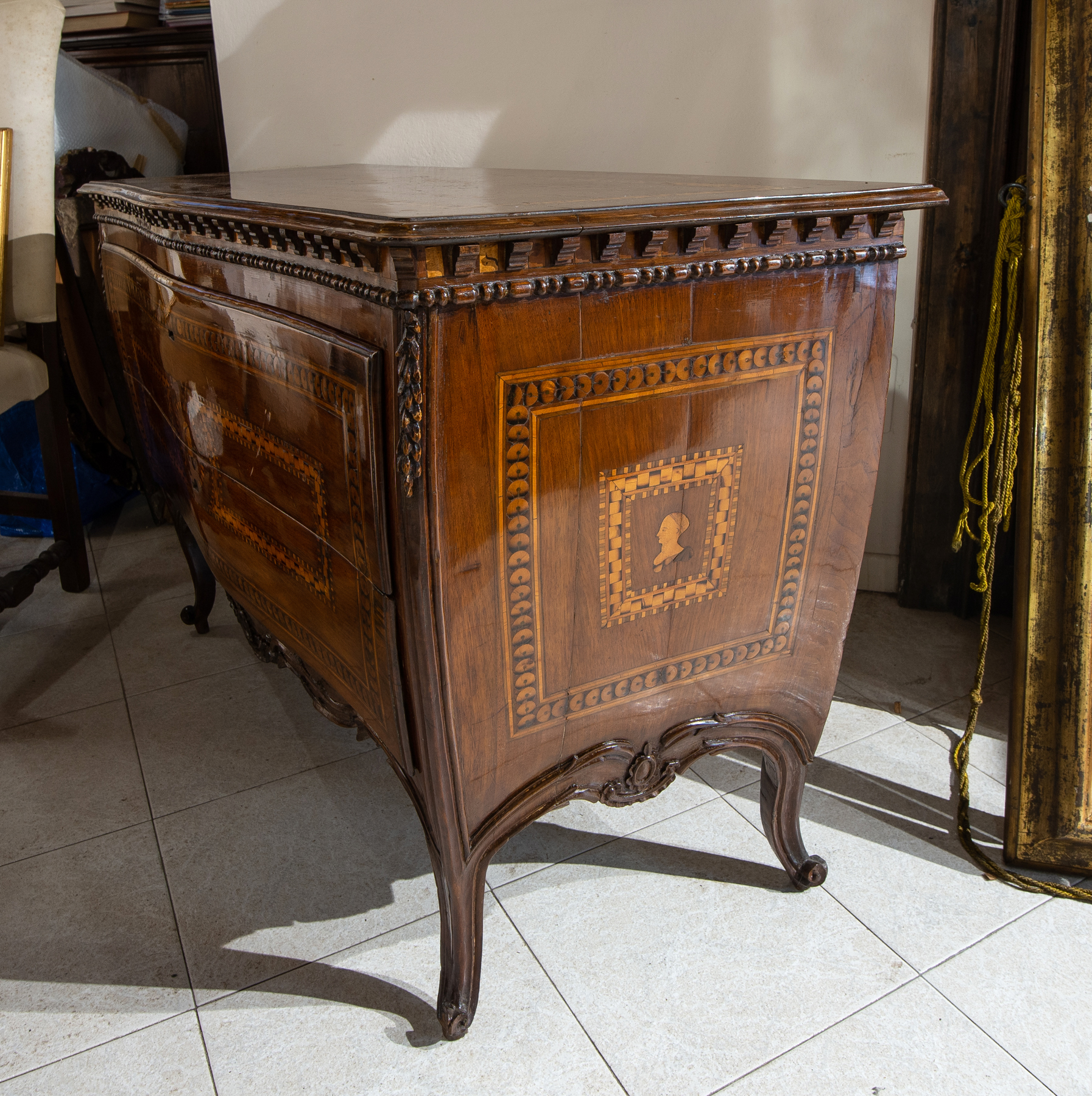 Comò piacentino a 2 cassetti intagliato ed intarsiato mosso sul fronte e sui fianchi - metà '700
