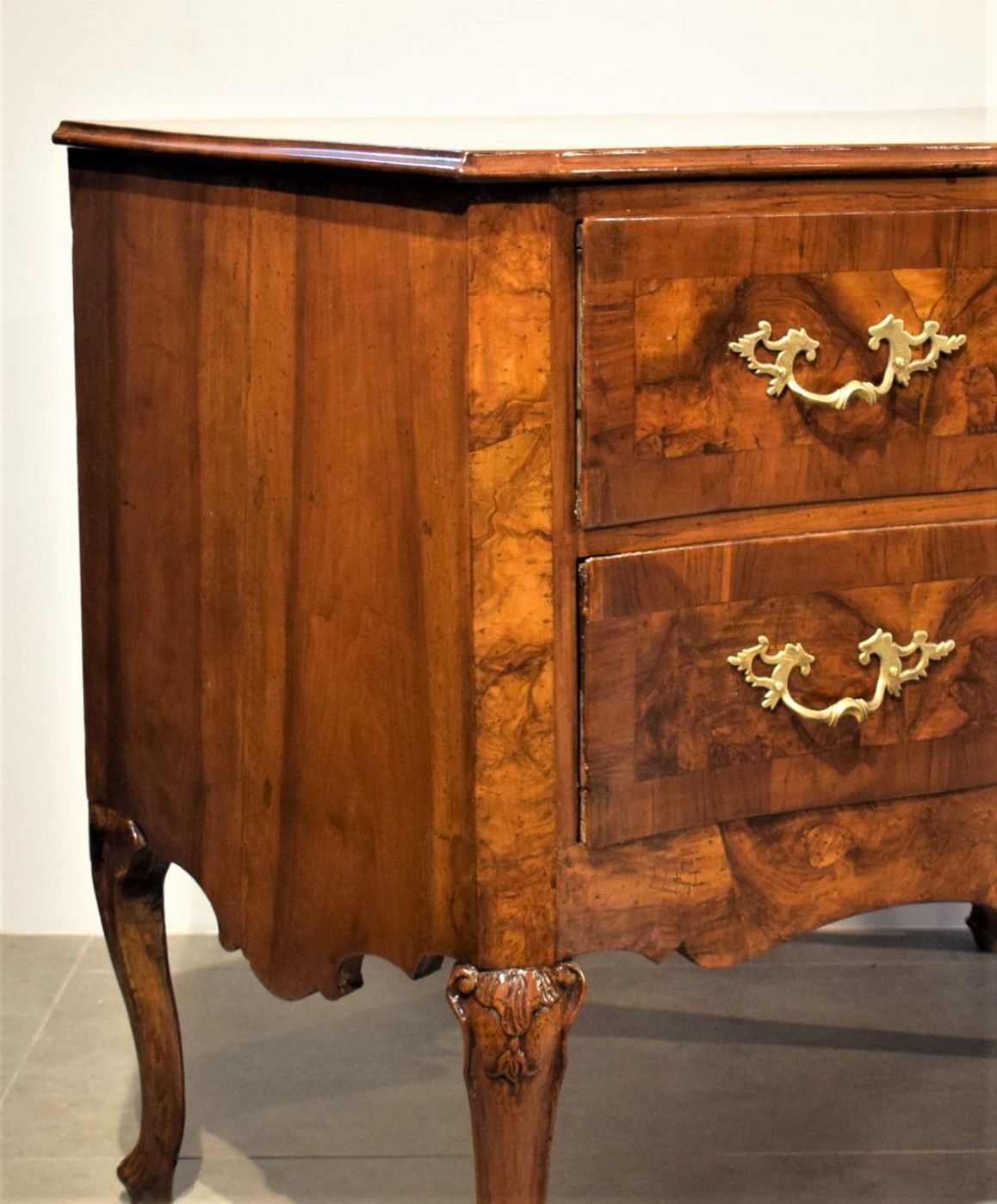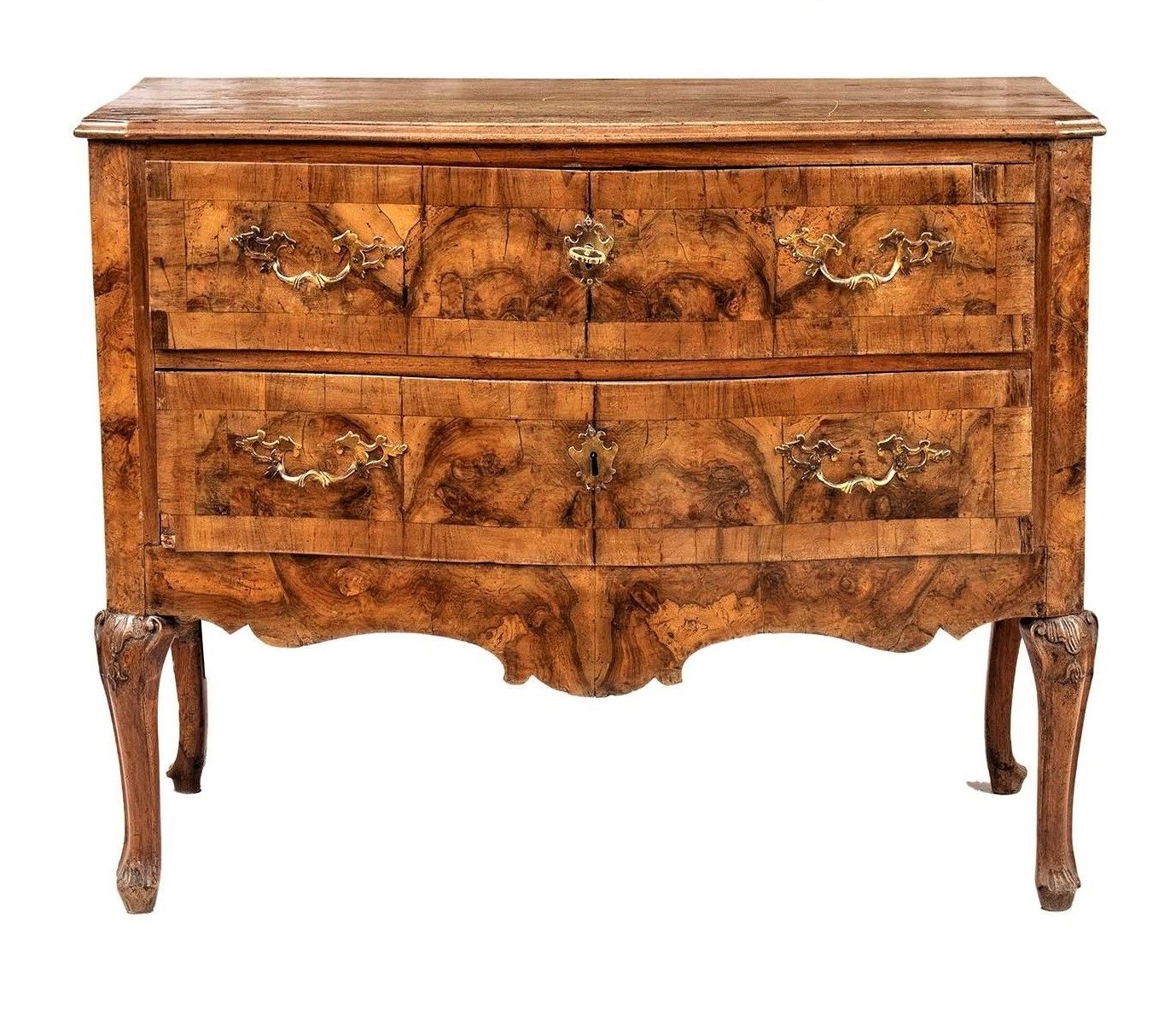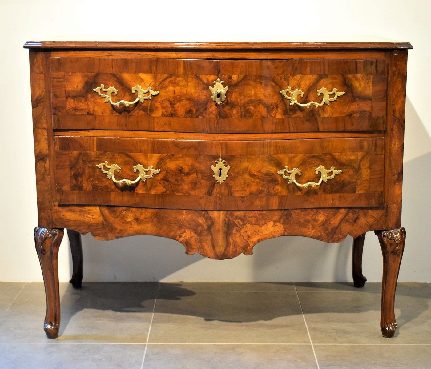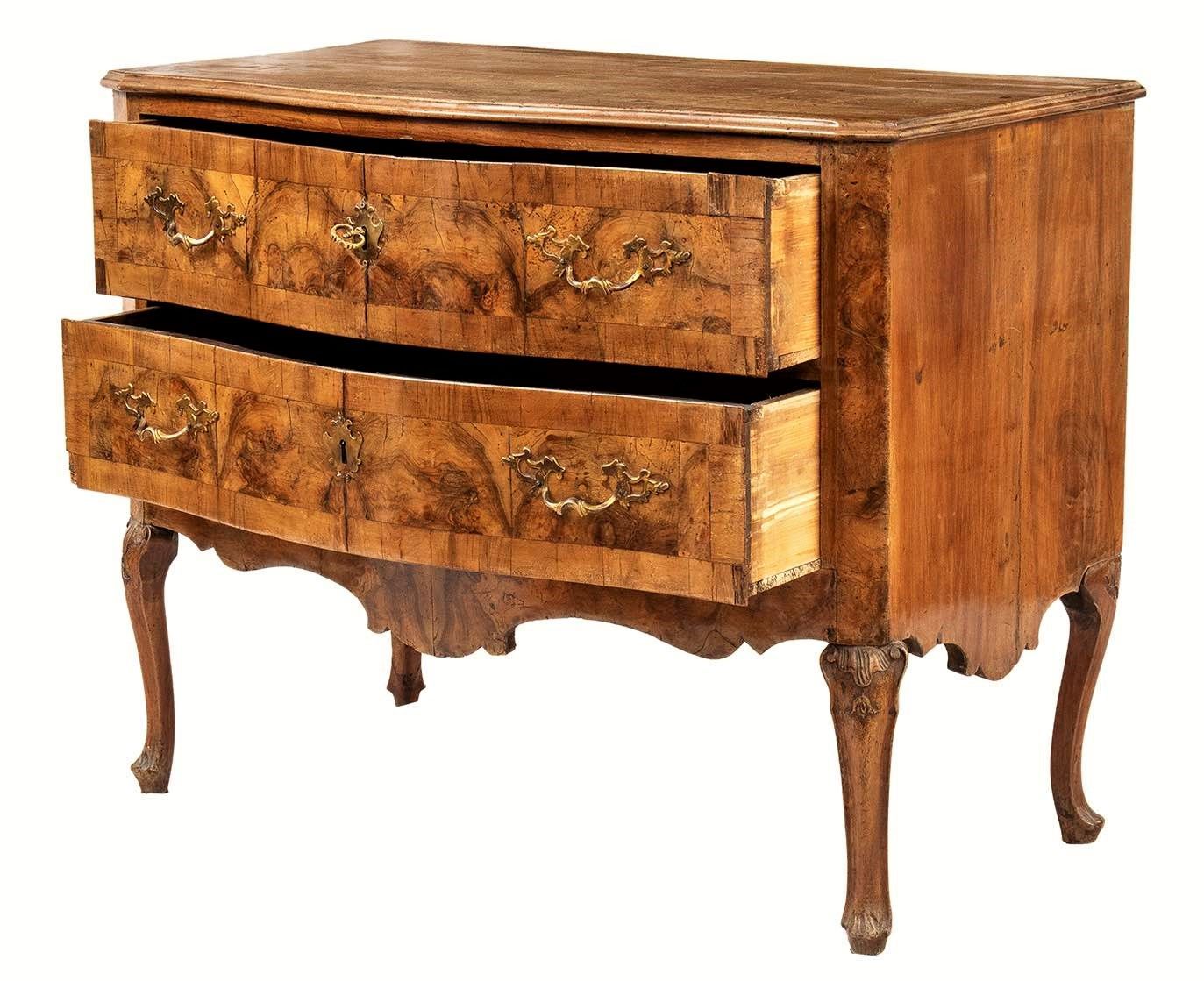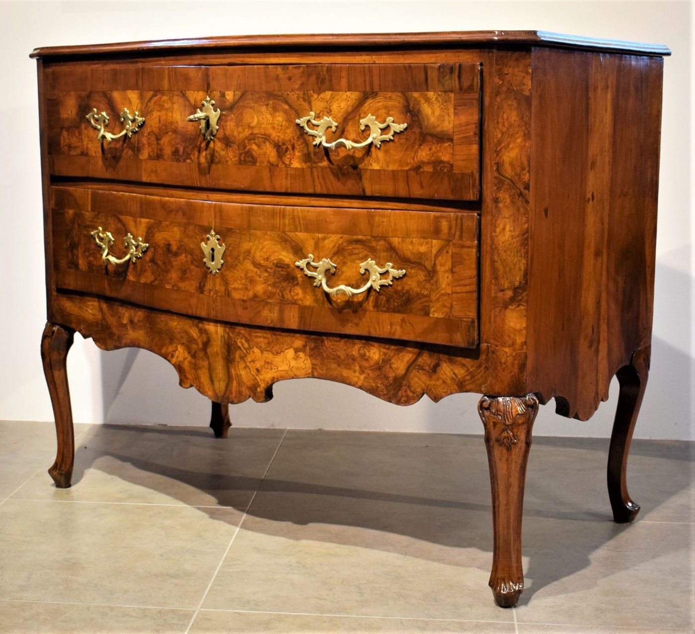 Splendido comò Luigi XV Veneziano con fronte mosso e gambe slanciate con elegante movimento sinuoso. Sul fronte e sui fianchi scende un lungo grembiule sagomato.
