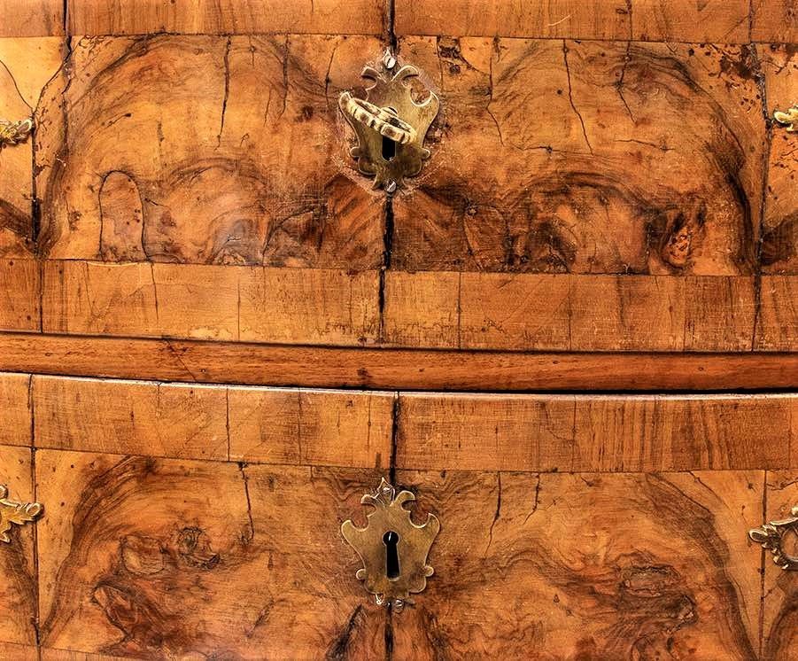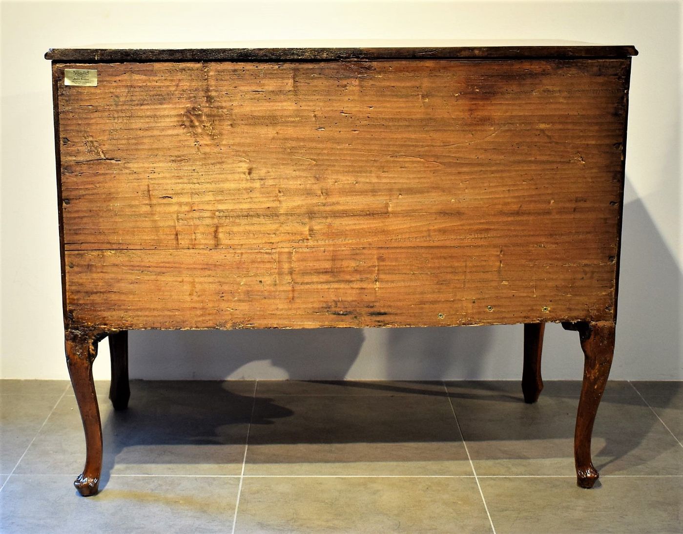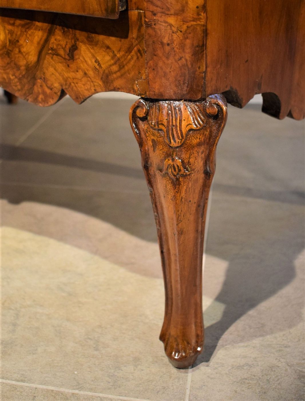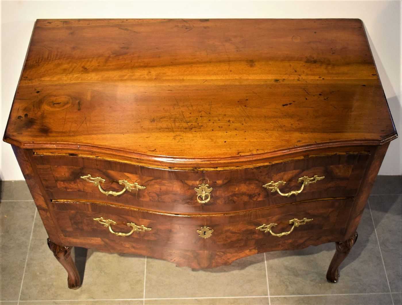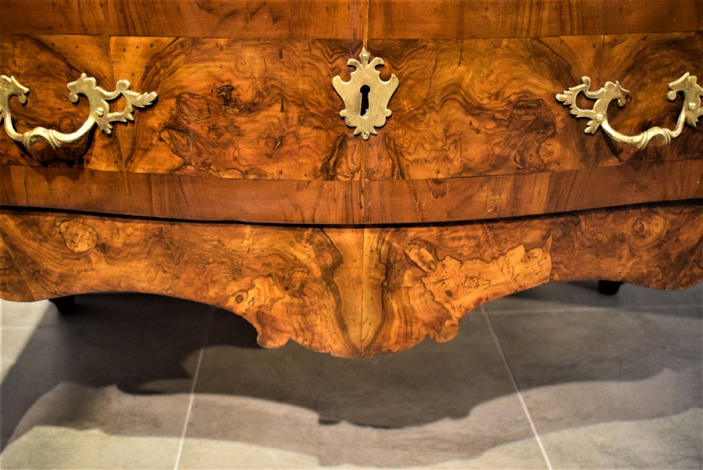 Splendido comò Luigi XV Veneziano con fronte mosso e gambe slanciate con elegante movimento sinuoso. Sul fronte e sui fianchi scende un lungo grembiule sagomato.